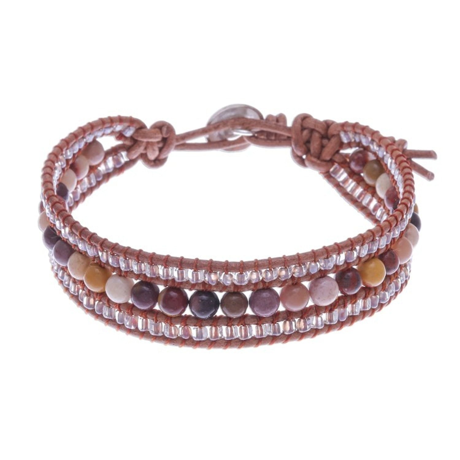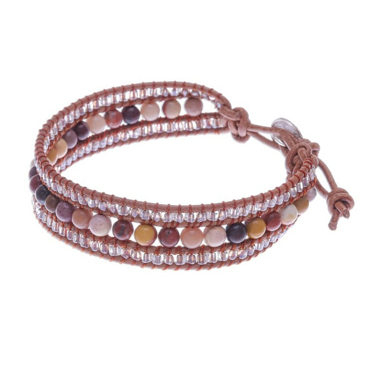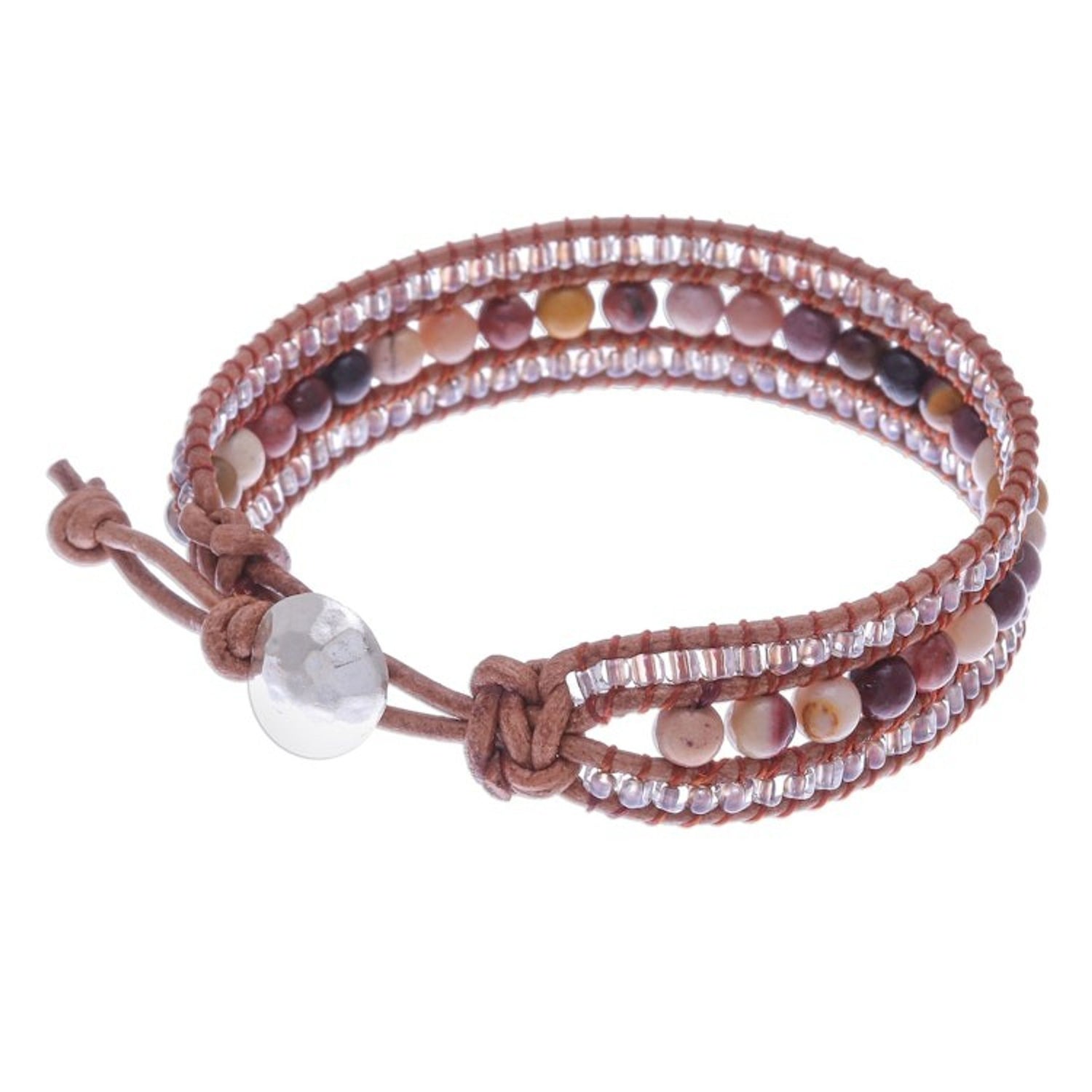 Handcrafted from jasper, glass beads, 950 silver, and leather, this adjustable bracelet measures 7 to 7.8 inches L and 0.6 inches W. It has a hammered finish and a button clasp. Colors may vary slightly.