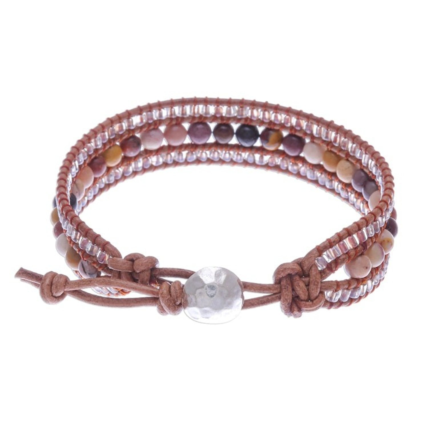 This Handmade Leather Bracelet with Jasper and Glass Beads by Siriporn Tongwat is a unique and bohemian-chic accessory. It features jasper in assorted warm colors and petite clear glass beads knotted on brown leather cords in three rows. The bracelet fastens at one of two lengths with a hammered 950 silver button.