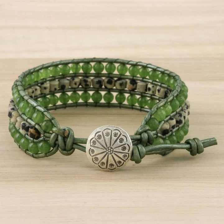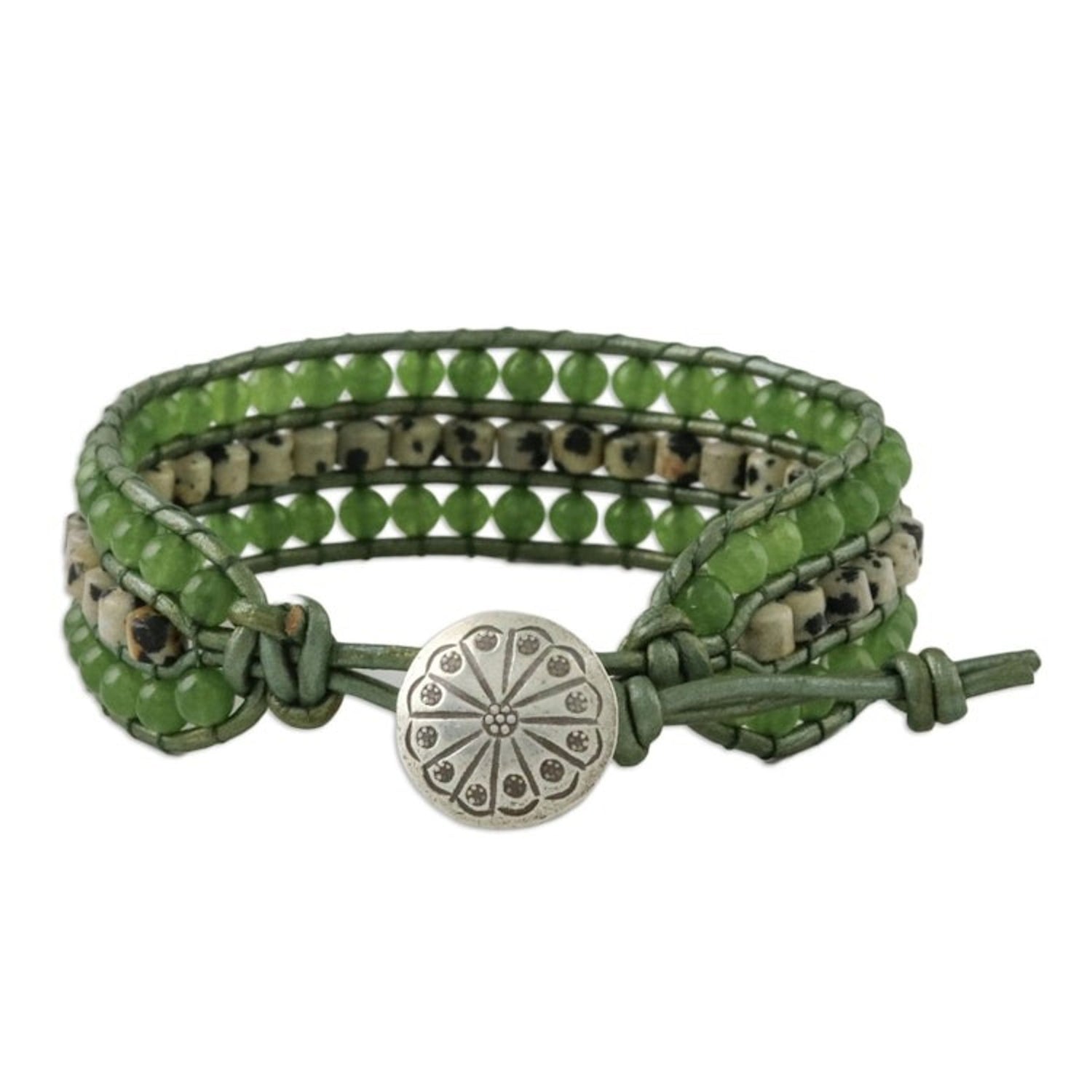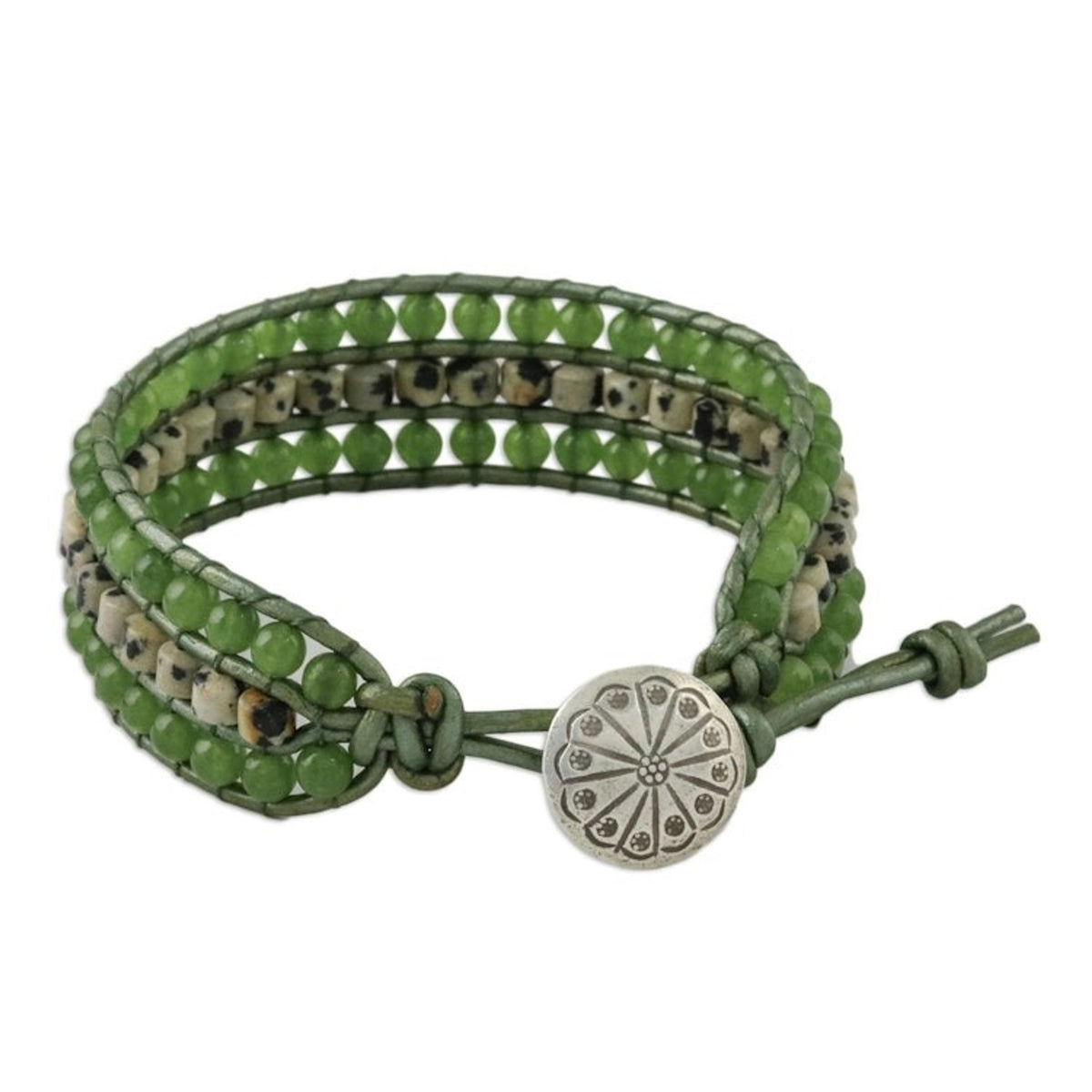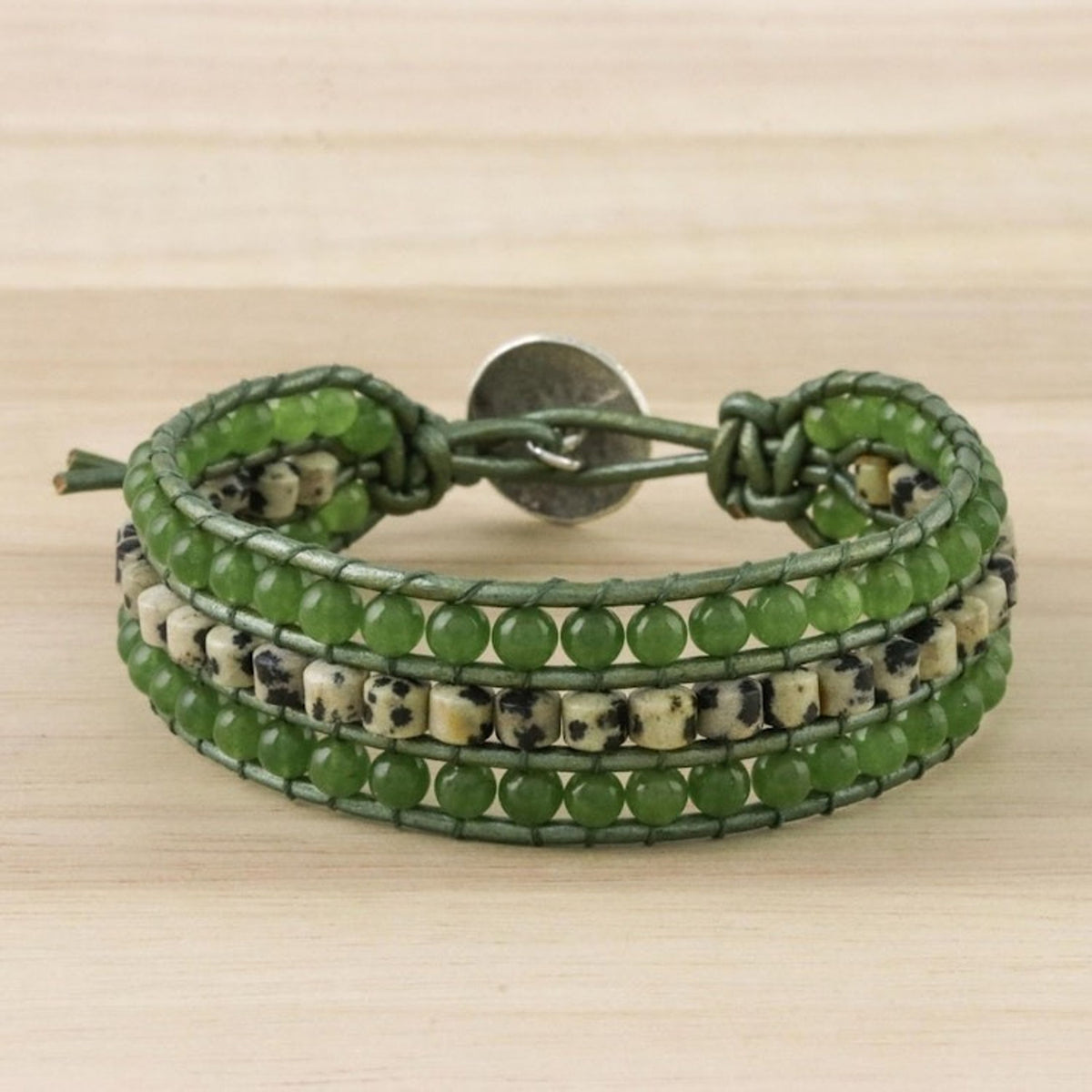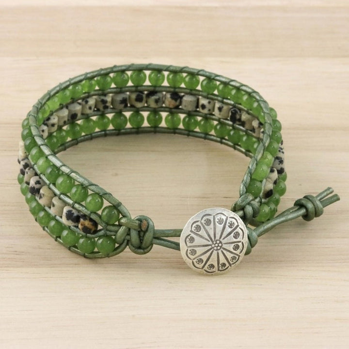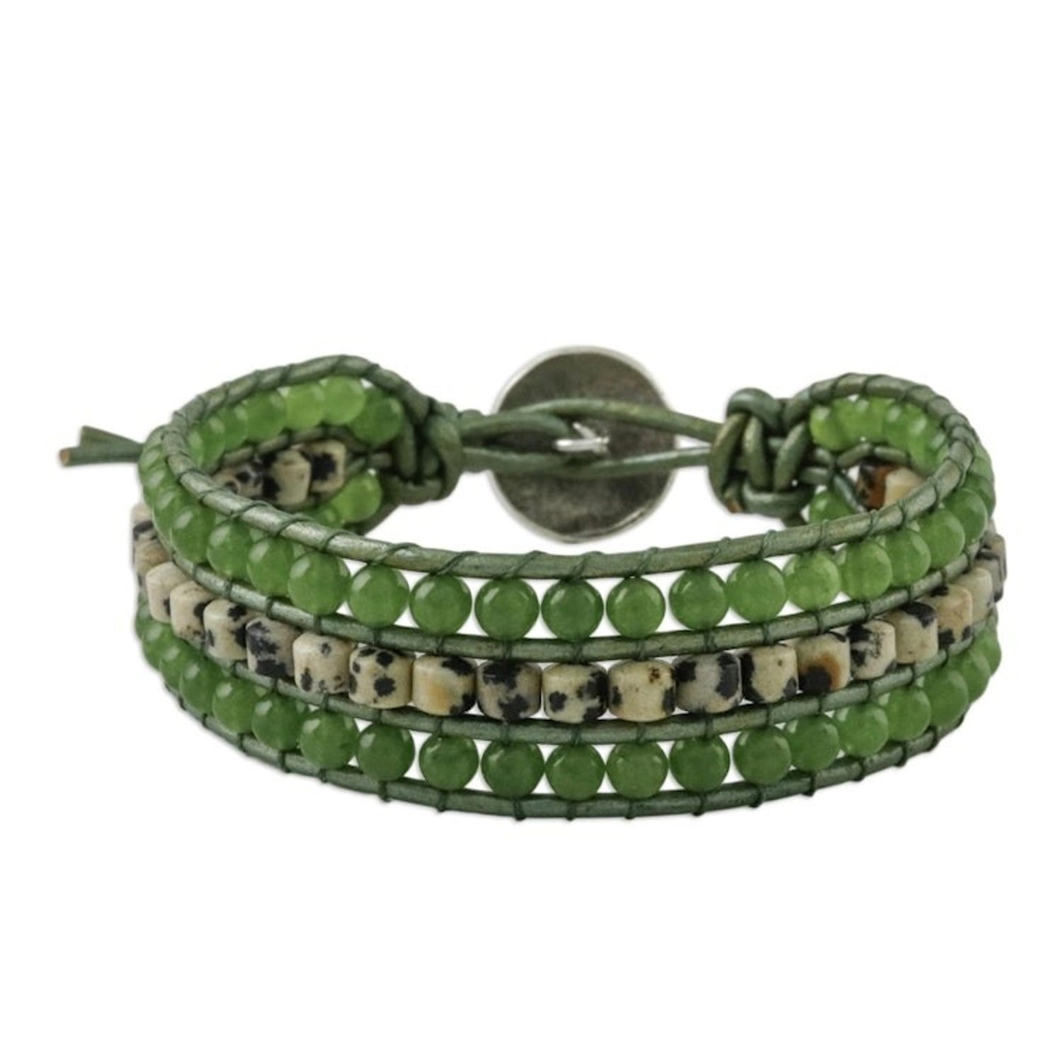 This Jasper Quartz Bead and Karen Silver Wristband Bracelet by Siriporn Tongwat evokes the image of a stone path through a green meadow. A row of cylindrical jasper beads lies between two rows of round green quartz beads. The rows of beads are wrapped to green leather cords, and the bracelet fastens with a silver button stamped with a flower from the Karen hill tribe.