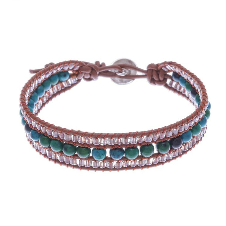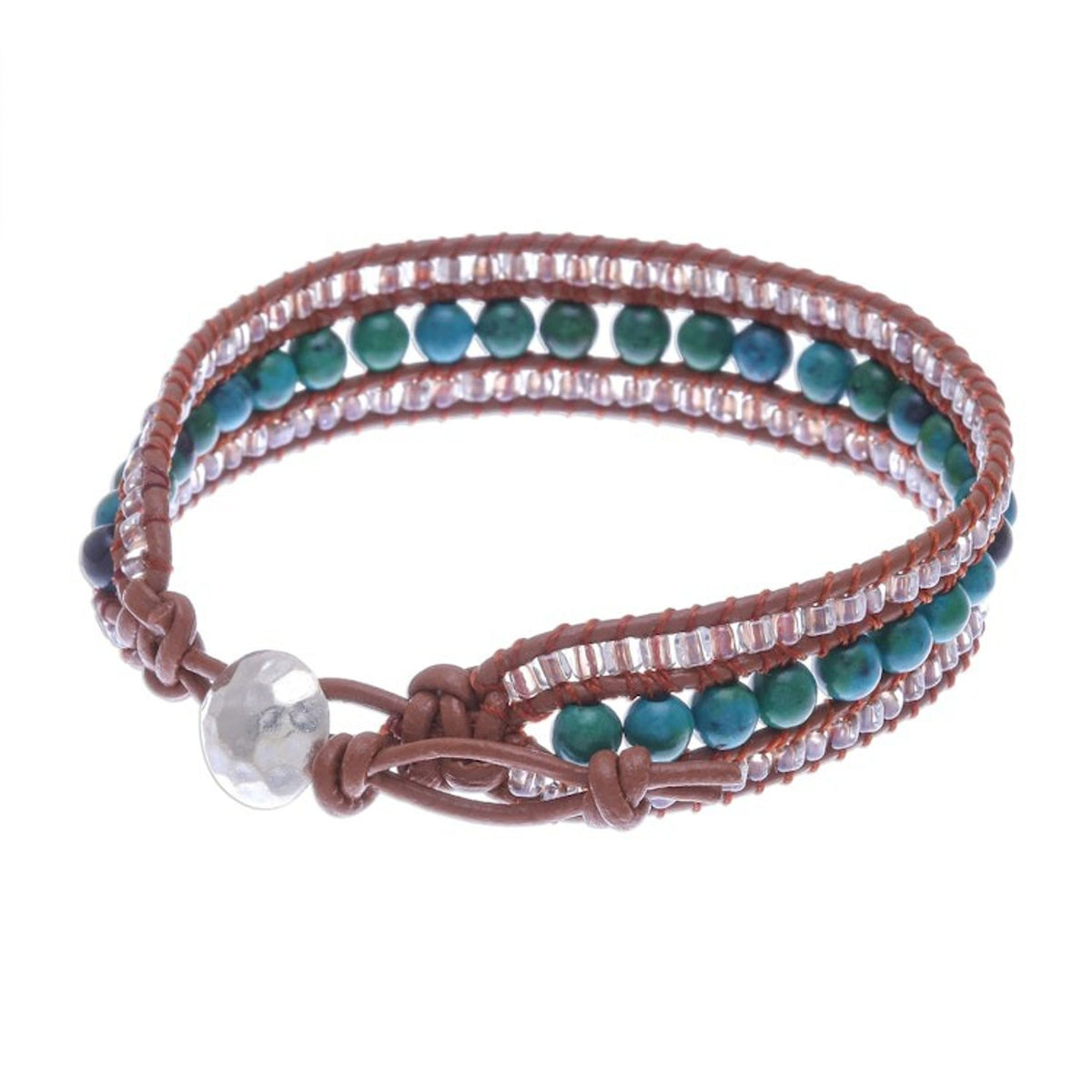 Handcrafted from dyed serpentine, glass beads, 950 silver, and leather, this adjustable bracelet measures 7 to 7.8 inches L and 0.6 inches W. It has a hammered finish and a button clasp. Colors may vary slightly.