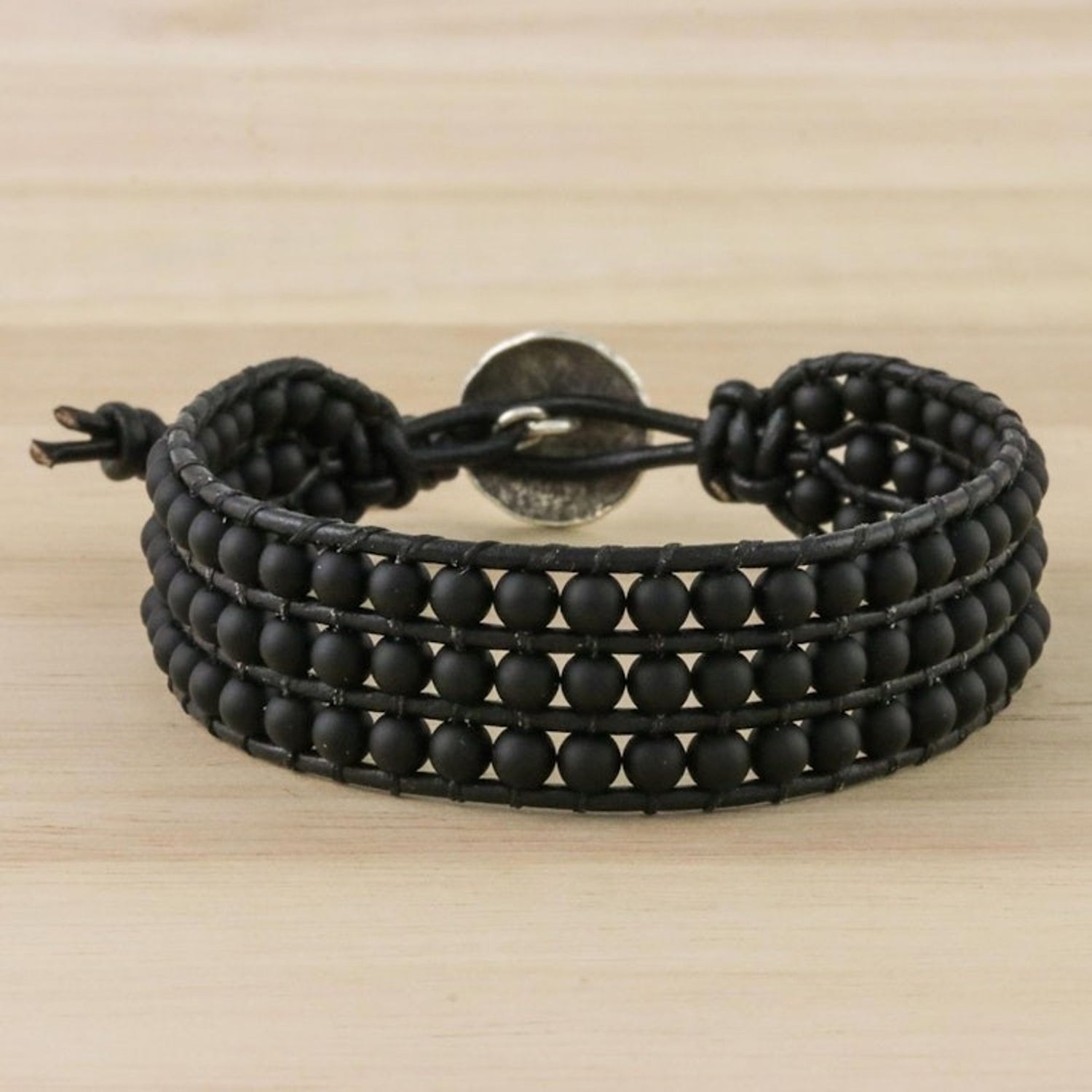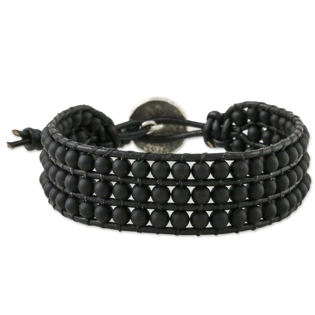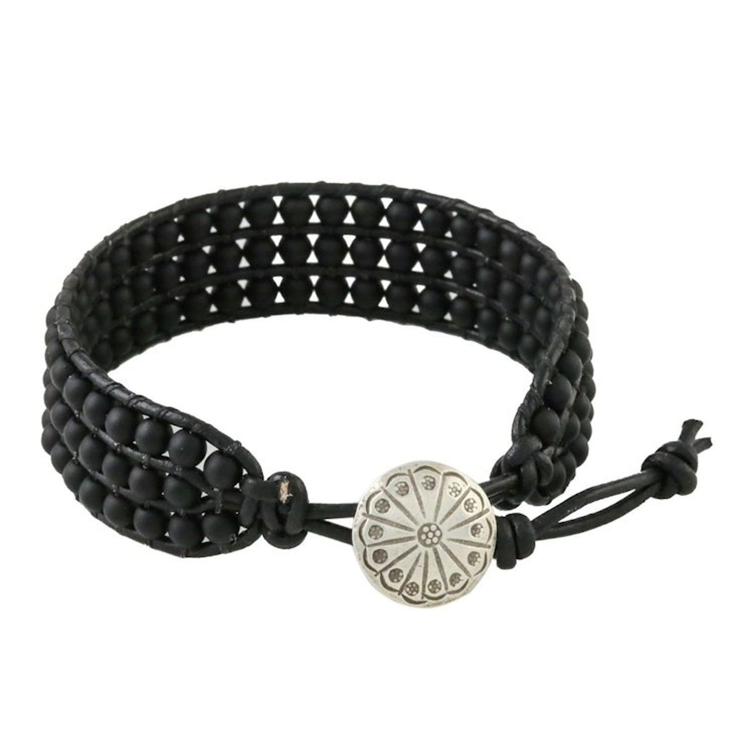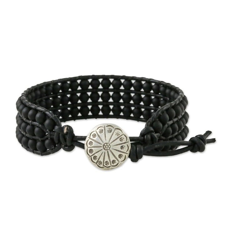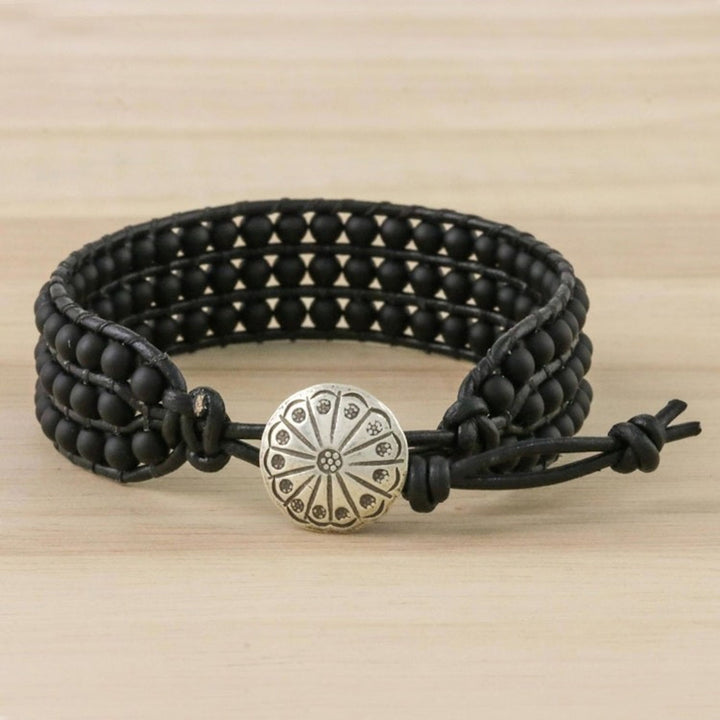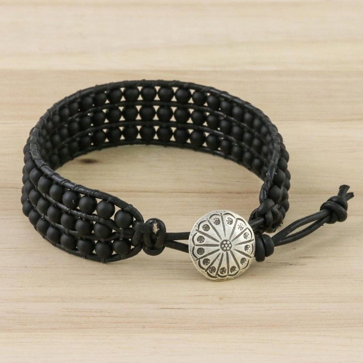 This Matte Black Bead and Karen Silver Button Wristband Bracelet by Siriporn Tongwat showcases the power and sophistication of black. Three rows of matte black glass beads are wrapped to black leather cords. The bracelet fastens with a silver button stamped with a flower from the Karen hill tribe and has two loops for an adjustable fit.