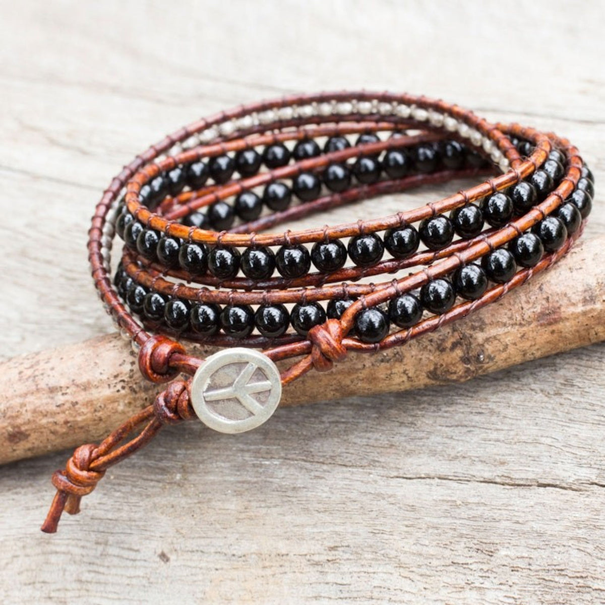 Onyx Beads on Brown Leather Wrap Bracelet from Thailand 'Hill Tribe Boheme'