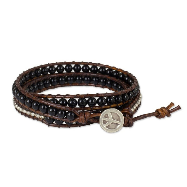 Onyx Beads on Brown Leather Wrap Bracelet from Thailand 'Hill Tribe Boheme' This 'Hill Tribe Boheme' bracelet by Siriporn Tongwat blends bohemian chic with timeless elegance. Gleaming black onyx beads are meticulously handcrafted onto a dark brown leather cord, creating a captivating juxtaposition of color and texture. The design is subtly enhanced with the inclusion of sterling silver beads from the Karen hill tribe, a detail that pays homage to traditional artistry and craftsmanship. This wrap bracelet is designed to be effortlessly stylish and versatile, securing with a button clasp that can be fastened at two different lengths for an ideal fit. It’s an essential piece for those who appreciate the fusion of earthy, natural elements with refined, sophisticated design.