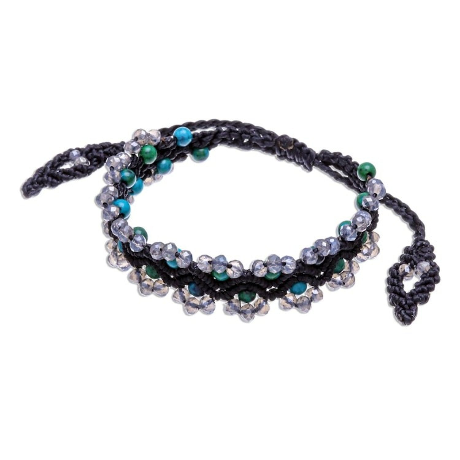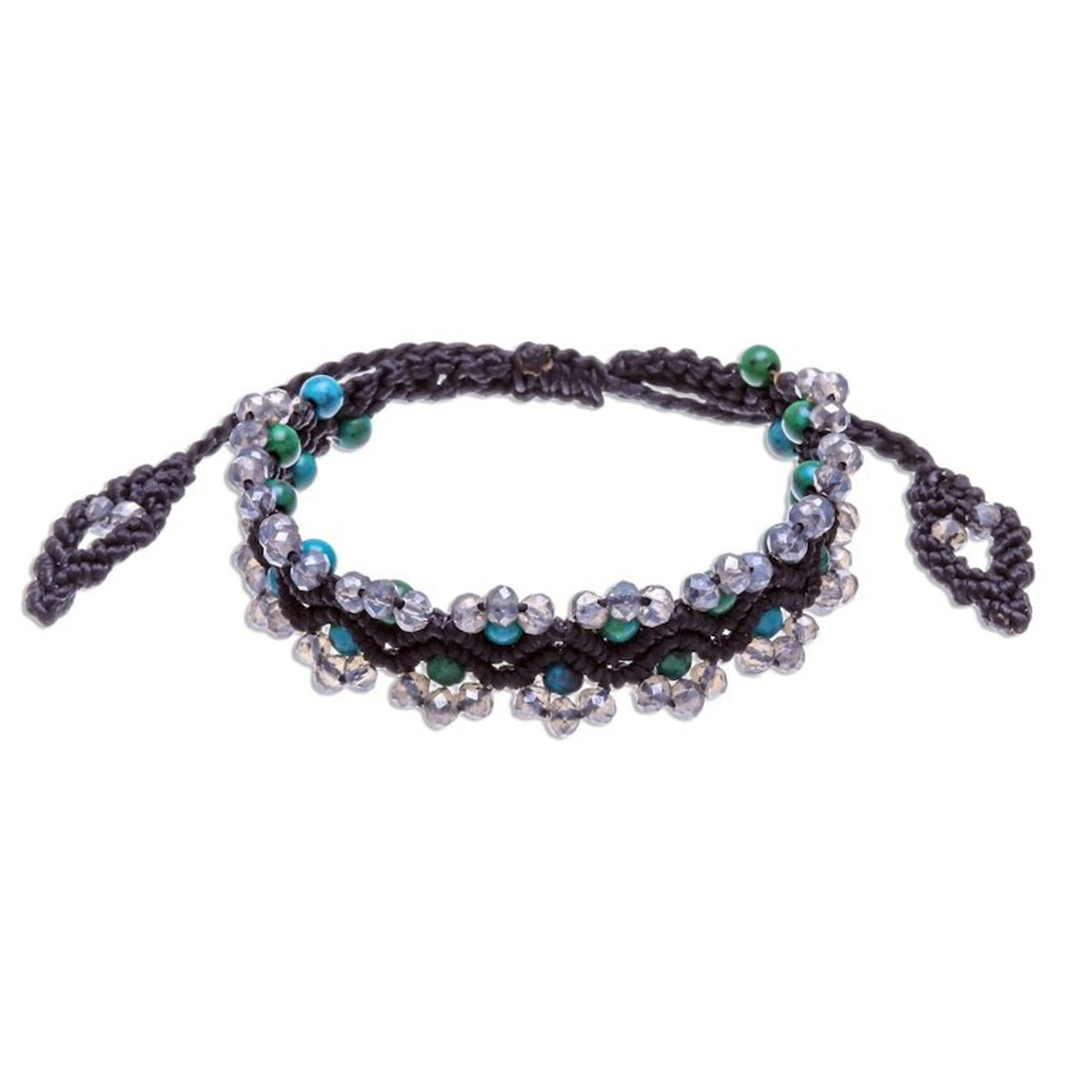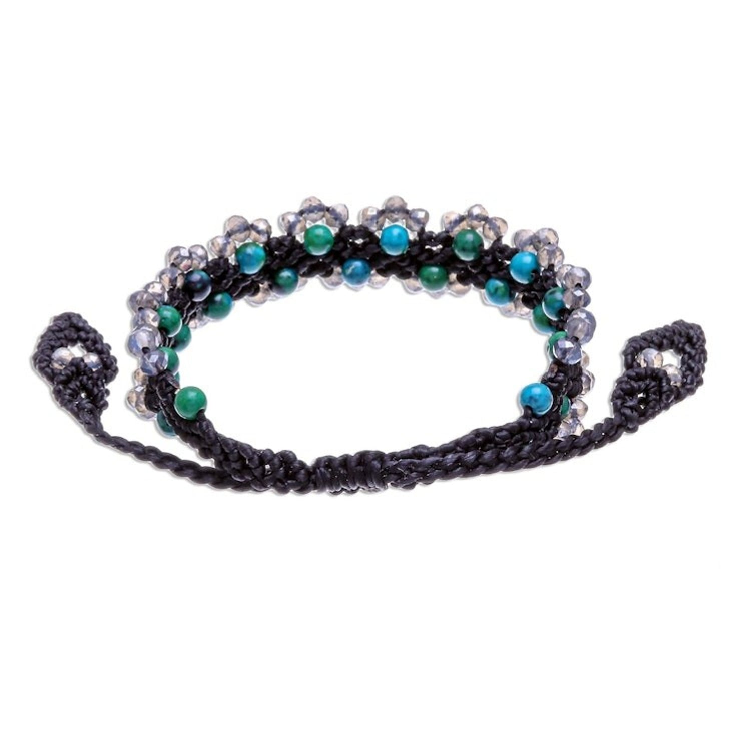 This handcrafted bracelet is made with faceted and polished green serpentine and glass beads on a waxed polyester cord, and features a sliding knot closure for an adjustable fit. It measures 7-11.5 inches in length and 0.7 inches in width.