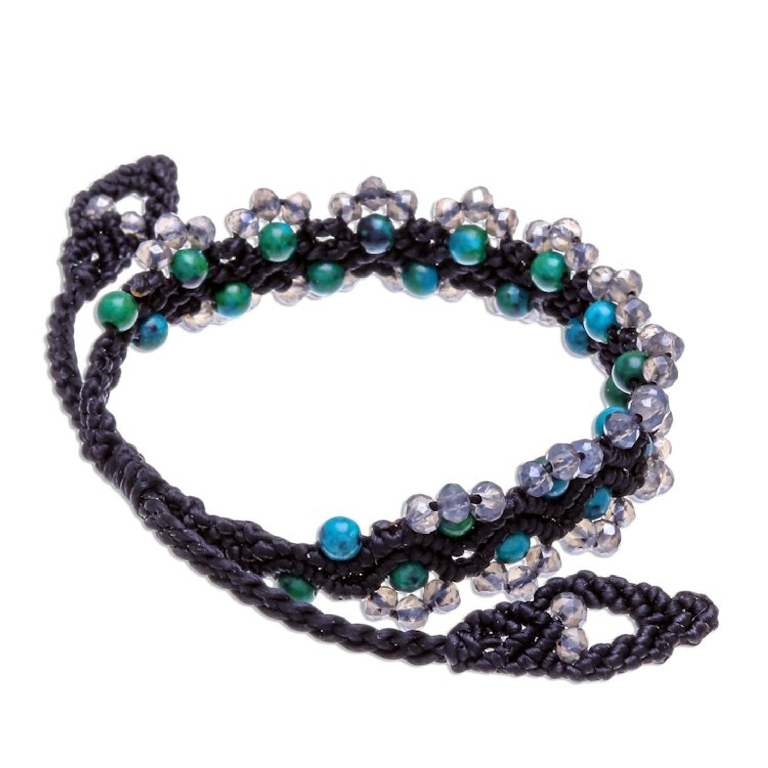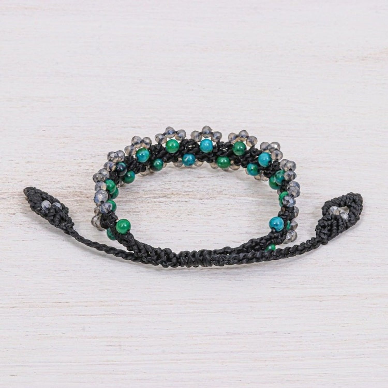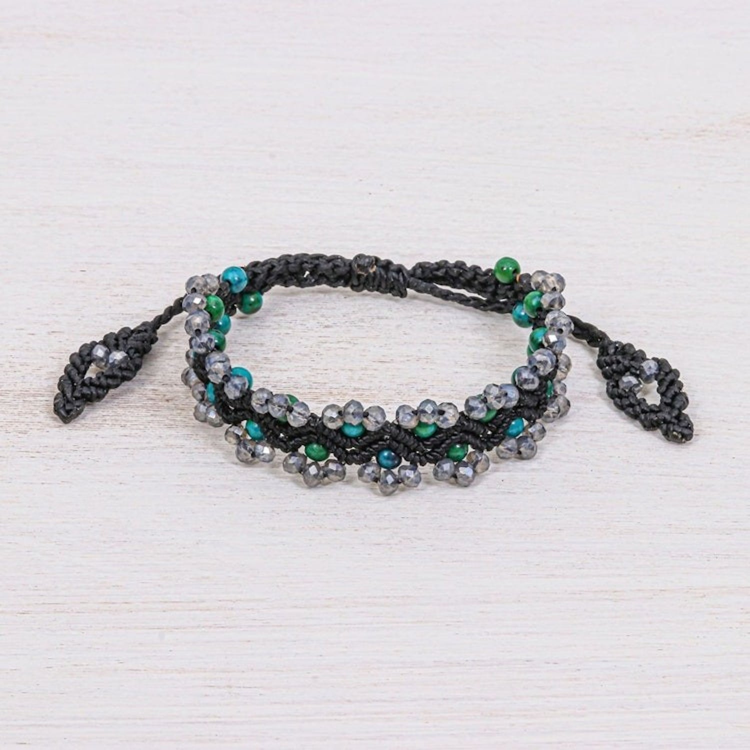 This handcrafted bracelet is made with faceted and polished green serpentine and glass beads on a waxed polyester cord, and features a sliding knot closure for an adjustable fit. It measures 7-11.5 inches in length and 0.7 inches in width.
