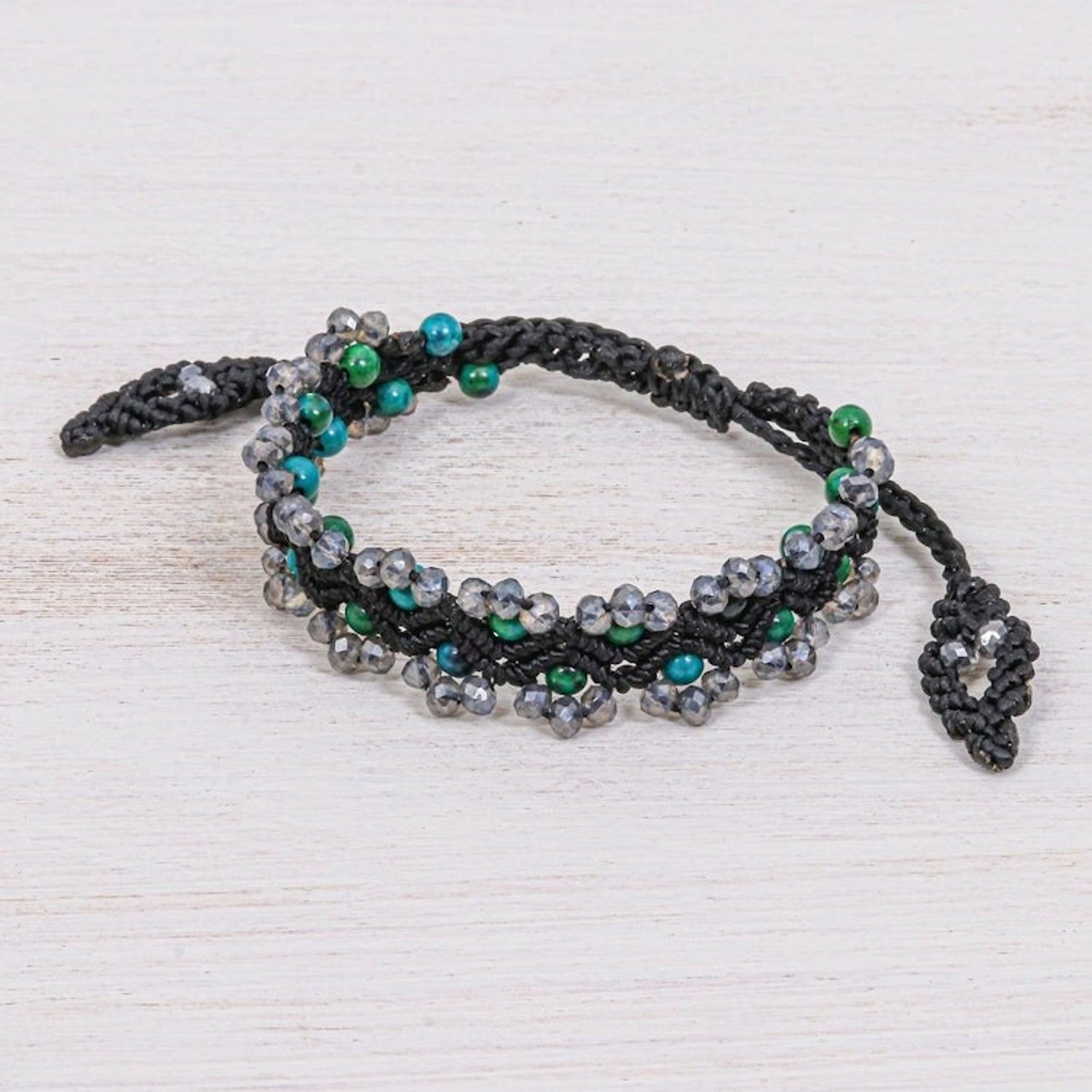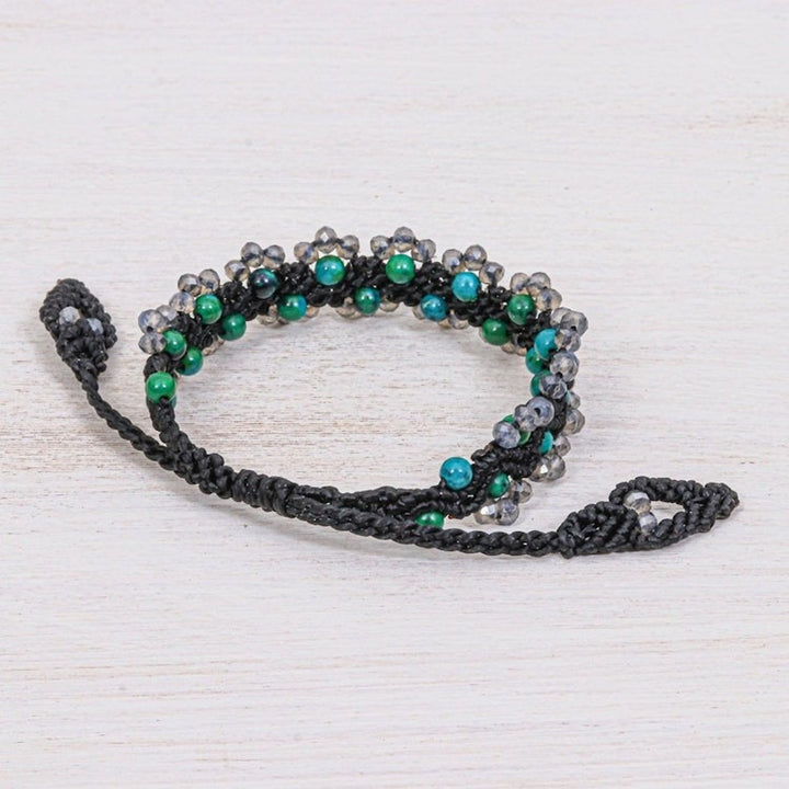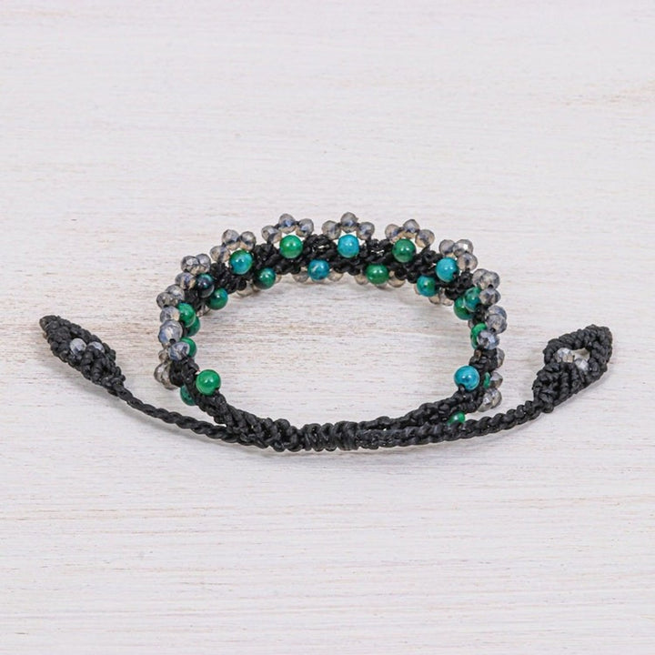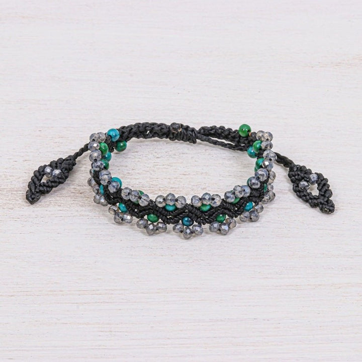 Serpentine Beaded Cord Bracelet with Sliding Knot 'Shiny Forest in Black' This 'Shiny Forest in Black' bracelet by Siriporn Tongwat brings the tranquil energy of a woodland walk to your wrist. The rich black macrame cord is hand-tied in a detailed chevron pattern, creating a textured base for the shimmering serpentine and glass beads that adorn its edges. This piece captures life’s intricate poetry, a theme central to Koy's work, offering a delicate transformation from simple materials to a wearable piece of art. The bracelet is secured with a sliding knot closure, ensuring an adjustable and comfortable fit for any wrist size, while the beaded tassels add a playful, elegant finish.