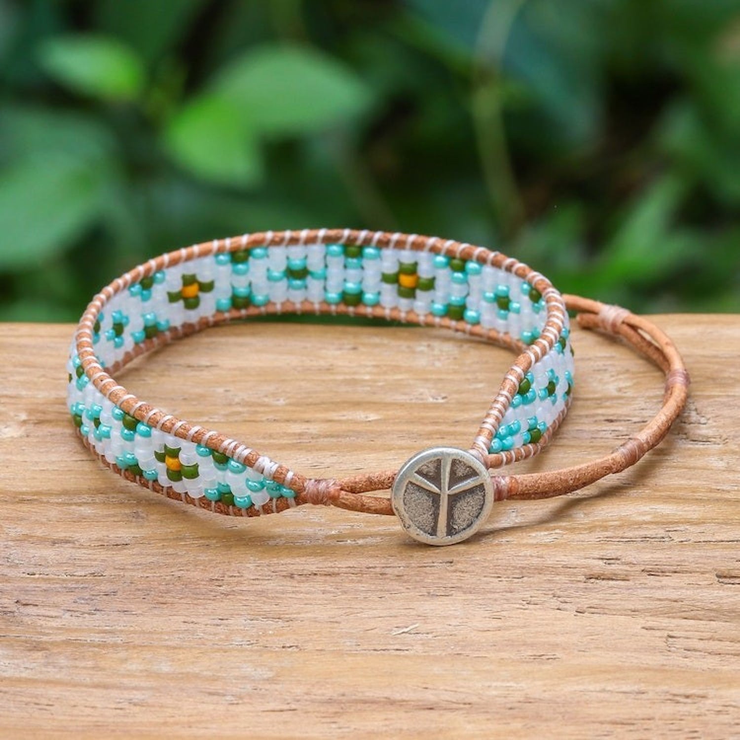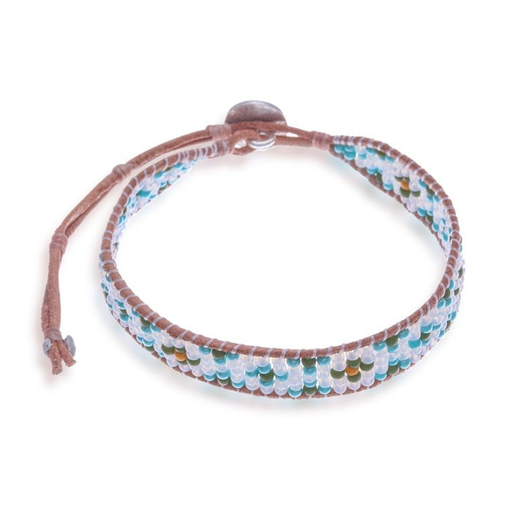 Turquoise Glass Bead and Brown Leather Wristband Bracelet 'Peace at the Shore' This 'Peace at the Shore' bracelet by Siriporn Tongwat invites a sense of serene coastal tranquility. A vibrant palette of turquoise, green, white, and yellow glass beads, meticulously hand-threaded onto a rich brown leather cord, creates a miniature landscape of a paradisiacal beach. The bracelet is secured with a simple, adjustable button closure, which allows for a comfortable, custom fit. This piece is beautifully crowned with a silver peace pendant, serving as a powerful symbol of tranquility and harmony. This wristband is a perfect accessory for anyone seeking a reminder of calm and peaceful moments.