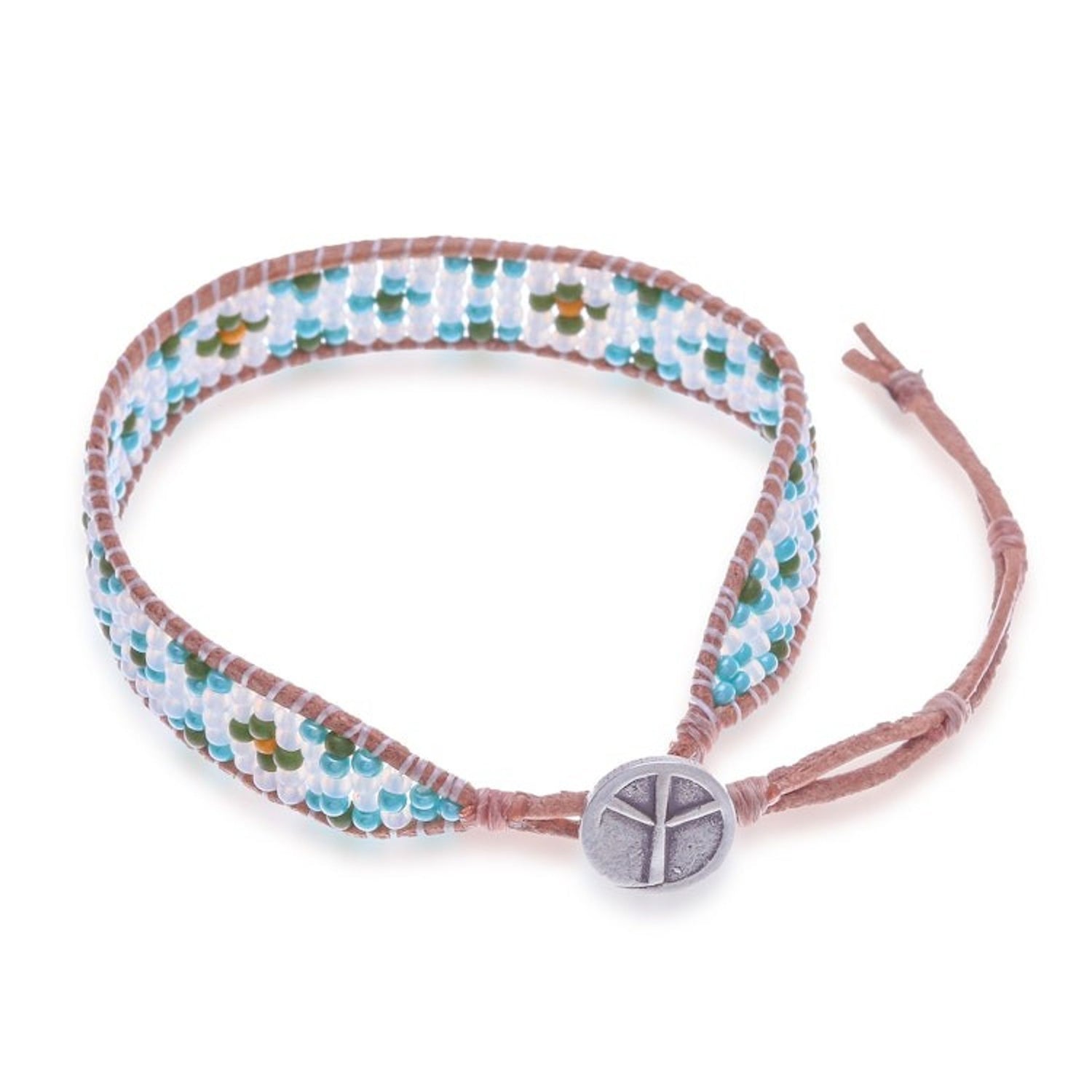 This handcrafted wristband bracelet features glass beads and a brown leather cord, and is secured with an adjustable button closure and a 0.950 silver peace pendant. It measures 6.8-8.8 inches in length and 0.4 inches in width.