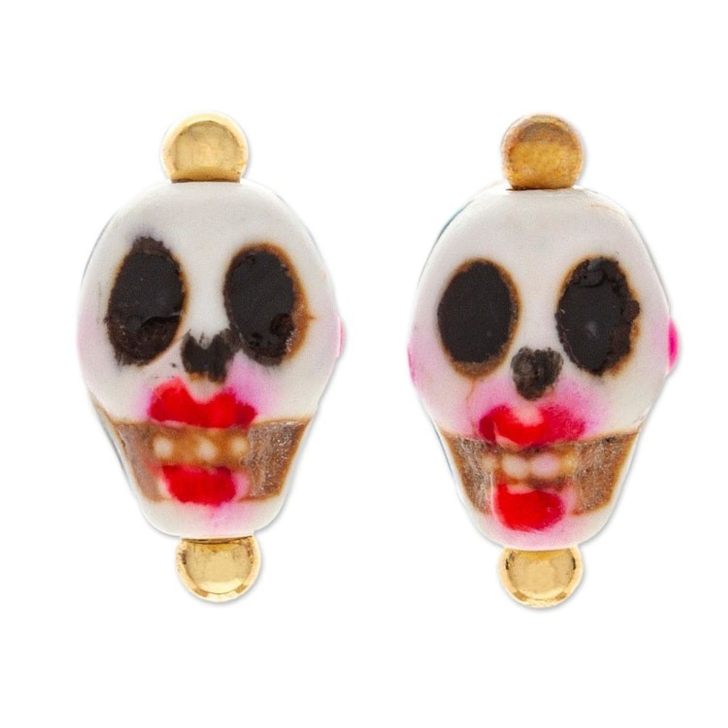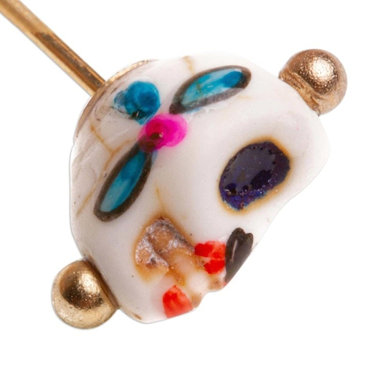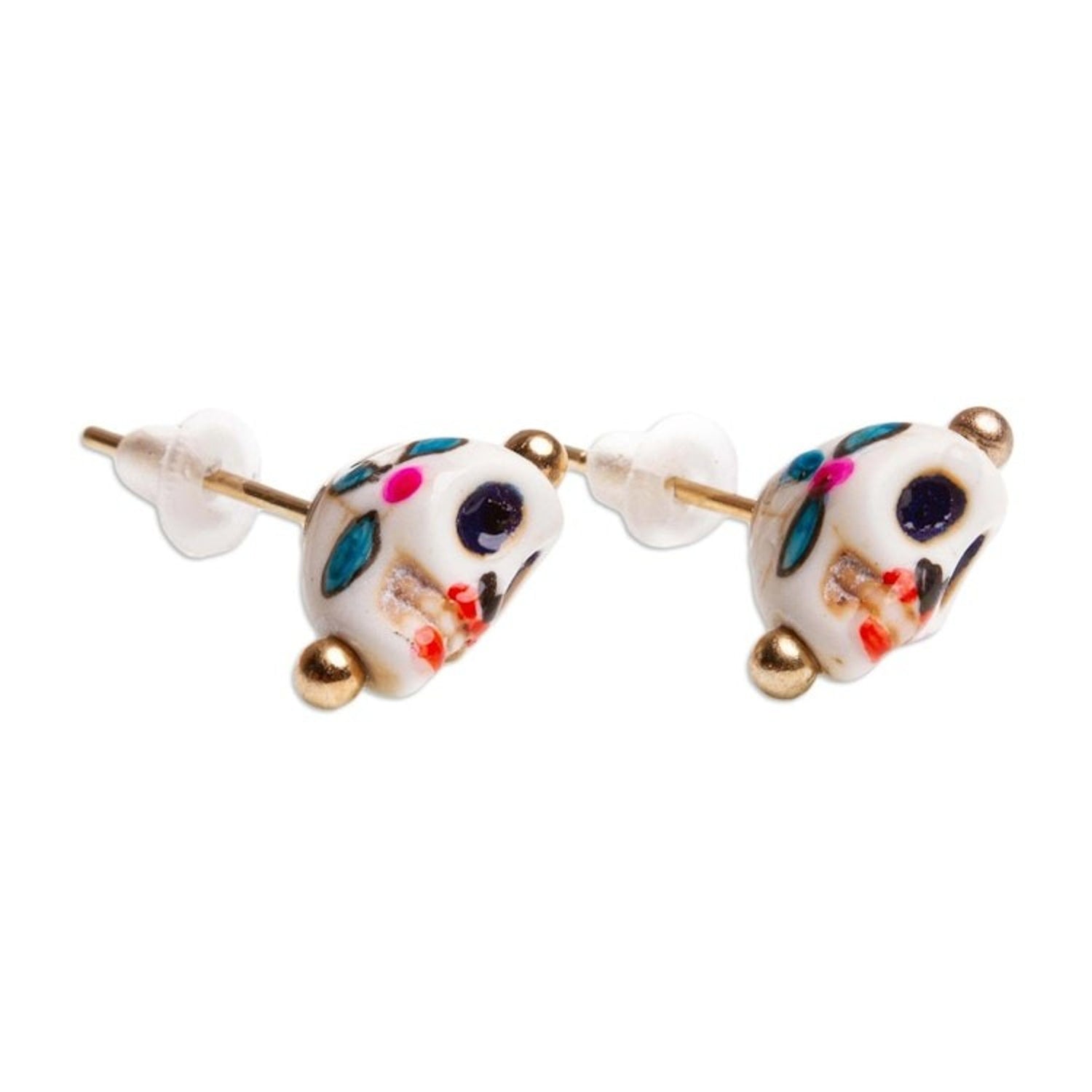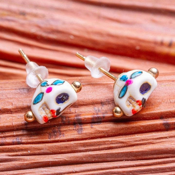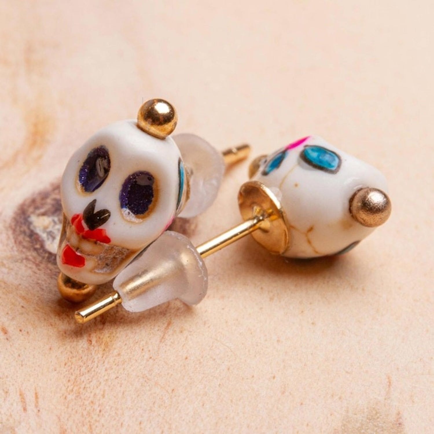 Skull Motif Stud Earrings 'Smiling Calavera' These 'Smiling Calavera' earrings by Sisters Josefina and Cecilia are the perfect blend of tradition and modern artistry. Crafted from marble and lovingly hand-painted, these stud earrings feature a smiling skull motif, a beautiful tribute to the joyful spirit of the Day of the Dead. The design is subtly enhanced with reconstituted turquoise and delicate enamel, adding a pop of color and detail. The earrings are completed with 14k gold-plated brass posts and beads, which add a touch of polished elegance. This accessory is a wonderful way to honor culture and memory with style and grace.