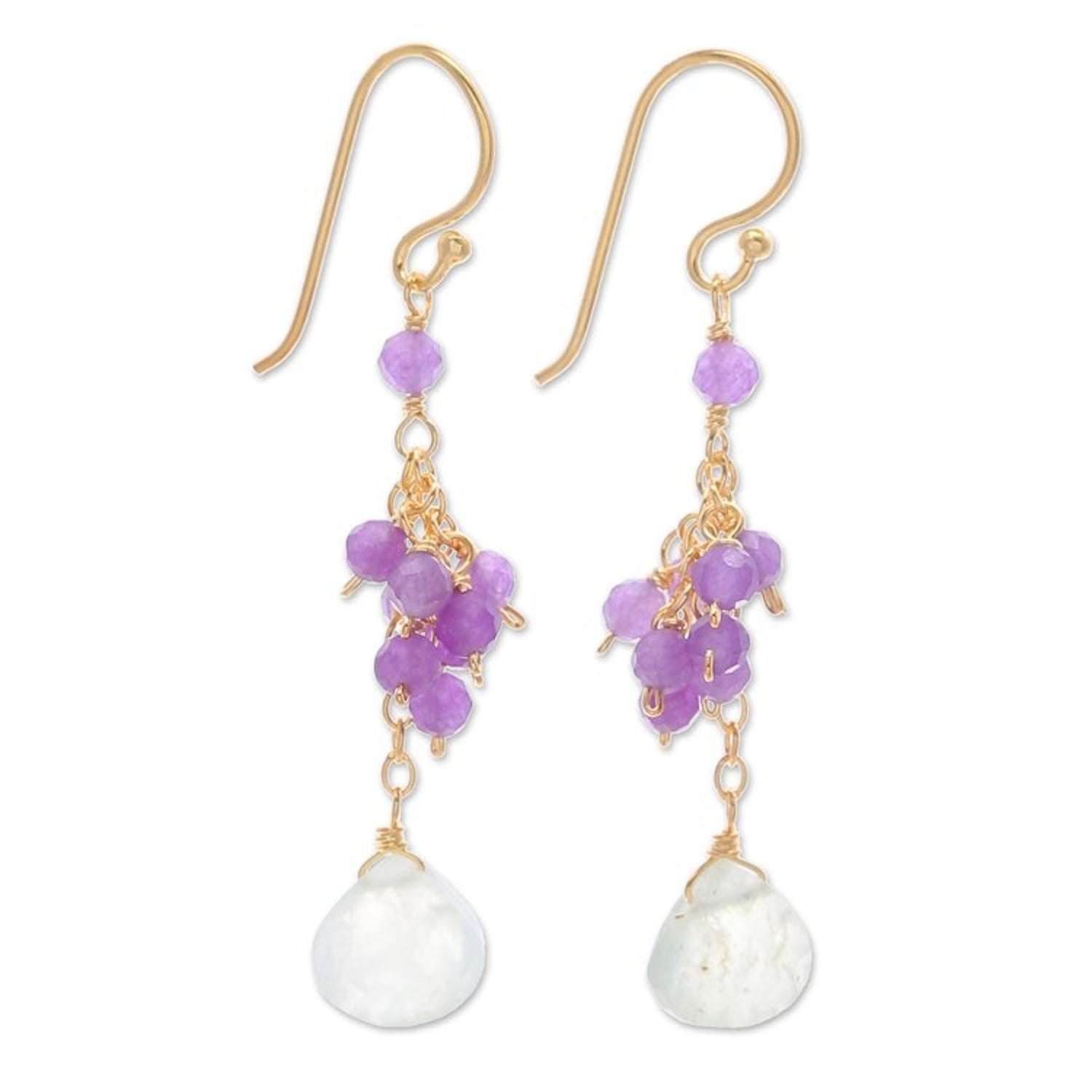 24k Gold-Plated Prehnite and Amethyst Dangle Earrings 'Wise Bliss' These 'Wise Bliss' dangle earrings by Somsiri Juntamin are designed to make you shine with a unique, mystic light. Crafted in Thailand, the design features charming 24k gold plating that elegantly frames delicate prehnite and amethyst gemstones. The stones dangle gracefully, creating a vibrant and eye-catching effect. With a polished finish and elegant hook closures, these earrings offer a sophisticated and elegant look that blends vibrant gemstones with luxurious metalwork. They are a beautiful reflection of the artisan's love of beauty and her creative vision.
