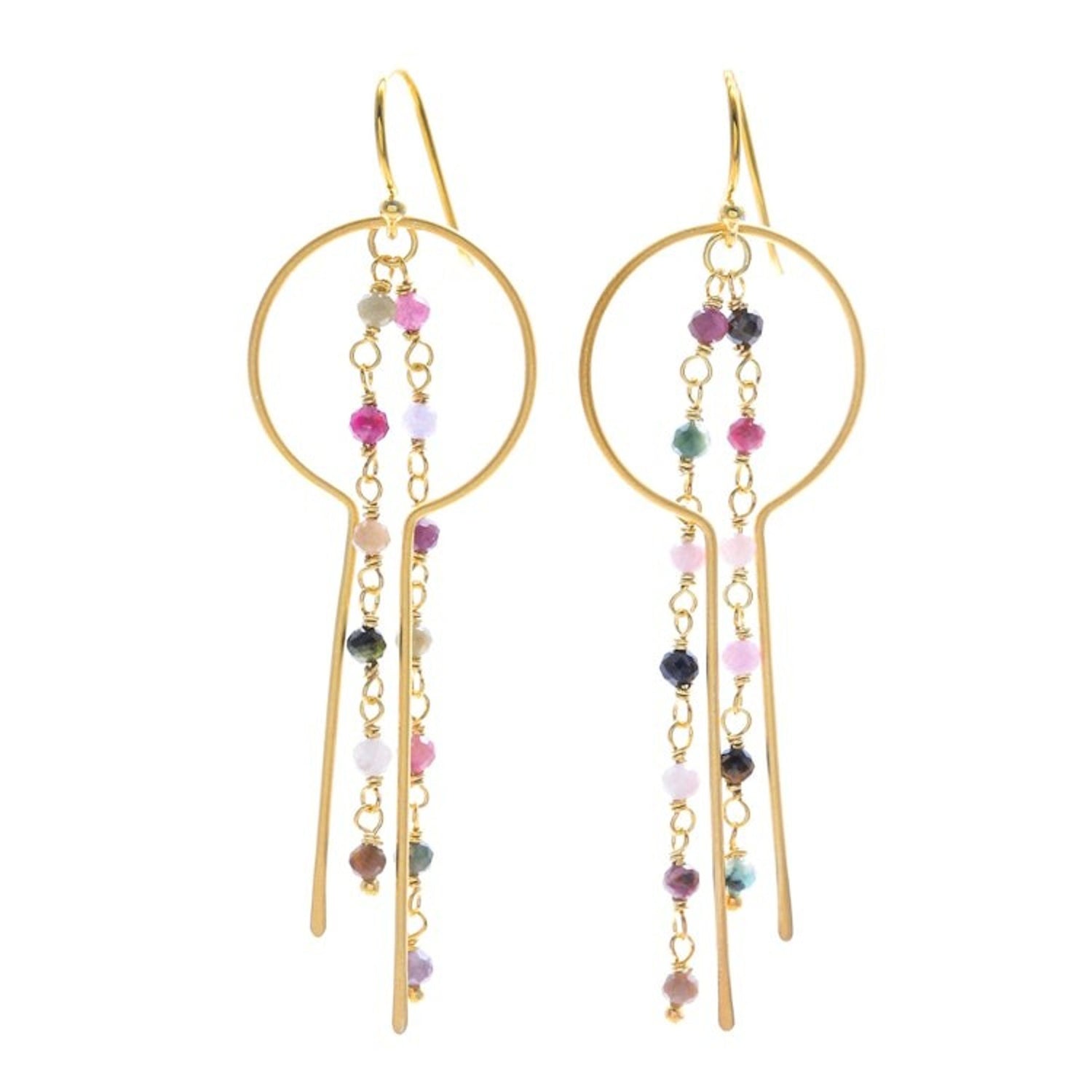 These handcrafted hook earrings are made with tourmaline beads and 24k gold-plated 925 sterling silver, and have a matte finish. They measure 2.8 inches in length and 0.8 inches in width.