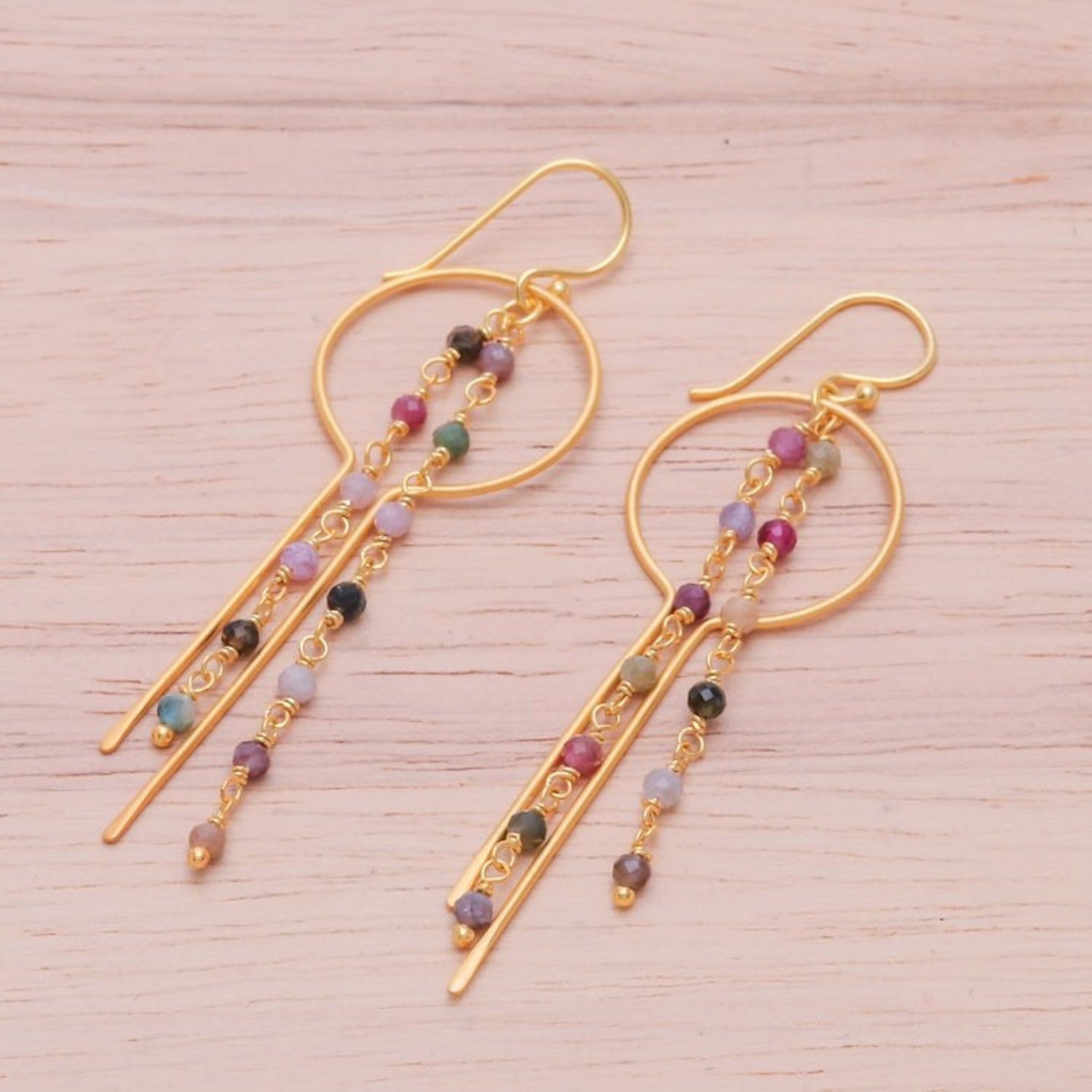 24k Gold-Plated Waterfall Earrings with Tourmaline Beads 'Creative Emotions' These 'Creative Emotions' waterfall earrings by Somsiri Juntamin are an enchanting and magical accessory. They feature delicate chains of 24k gold-plated sterling silver that hold colorful tourmaline beads, creating a beautiful cascading effect. The design includes round structures that add a modern and magical vibe. These earrings are finished with a unique matte texture, which provides a sophisticated contrast to the vibrant tourmaline. They are a perfect example of the artisan's ability to blend precious metals with fine gemstones to create a piece that is both artistic and emotionally resonant.
