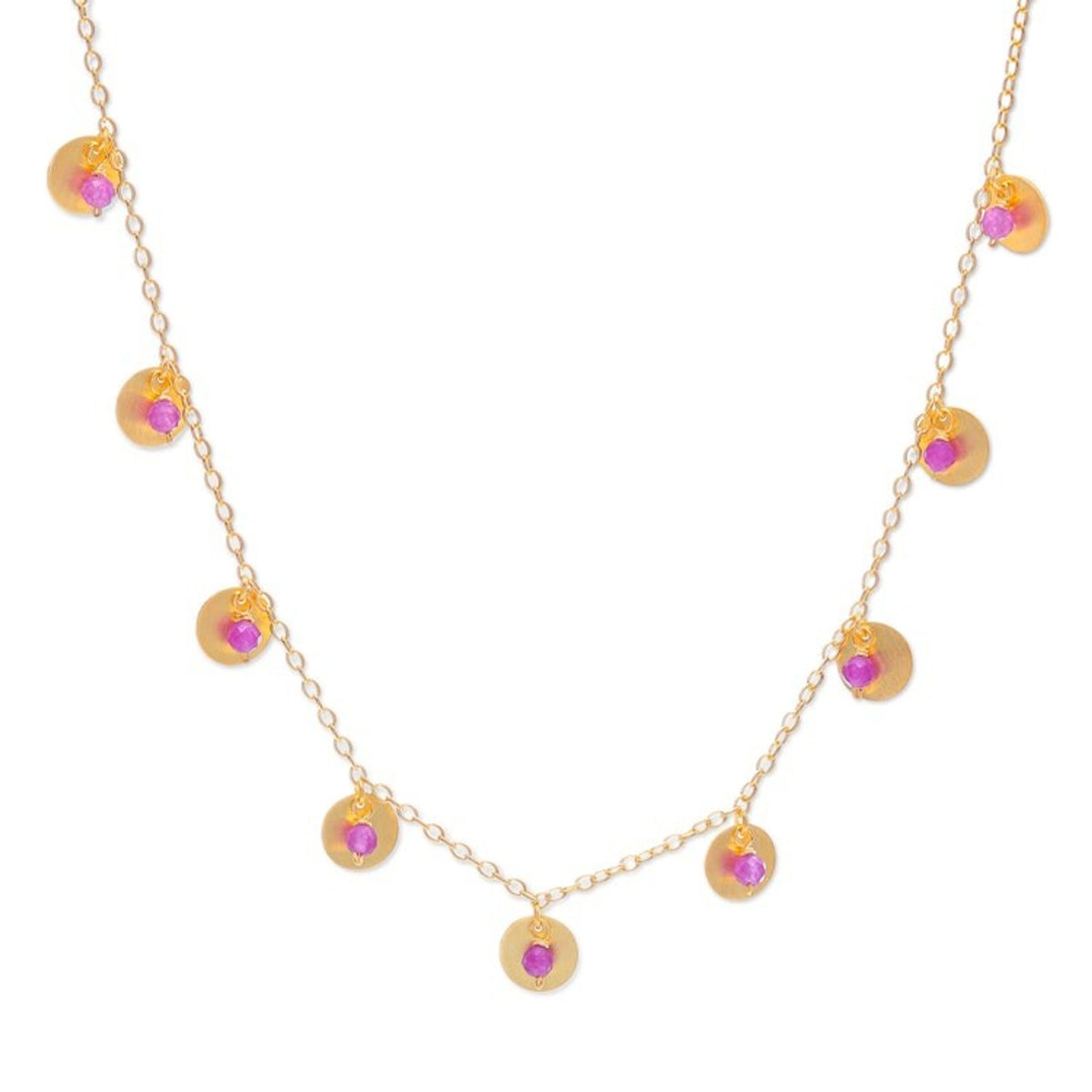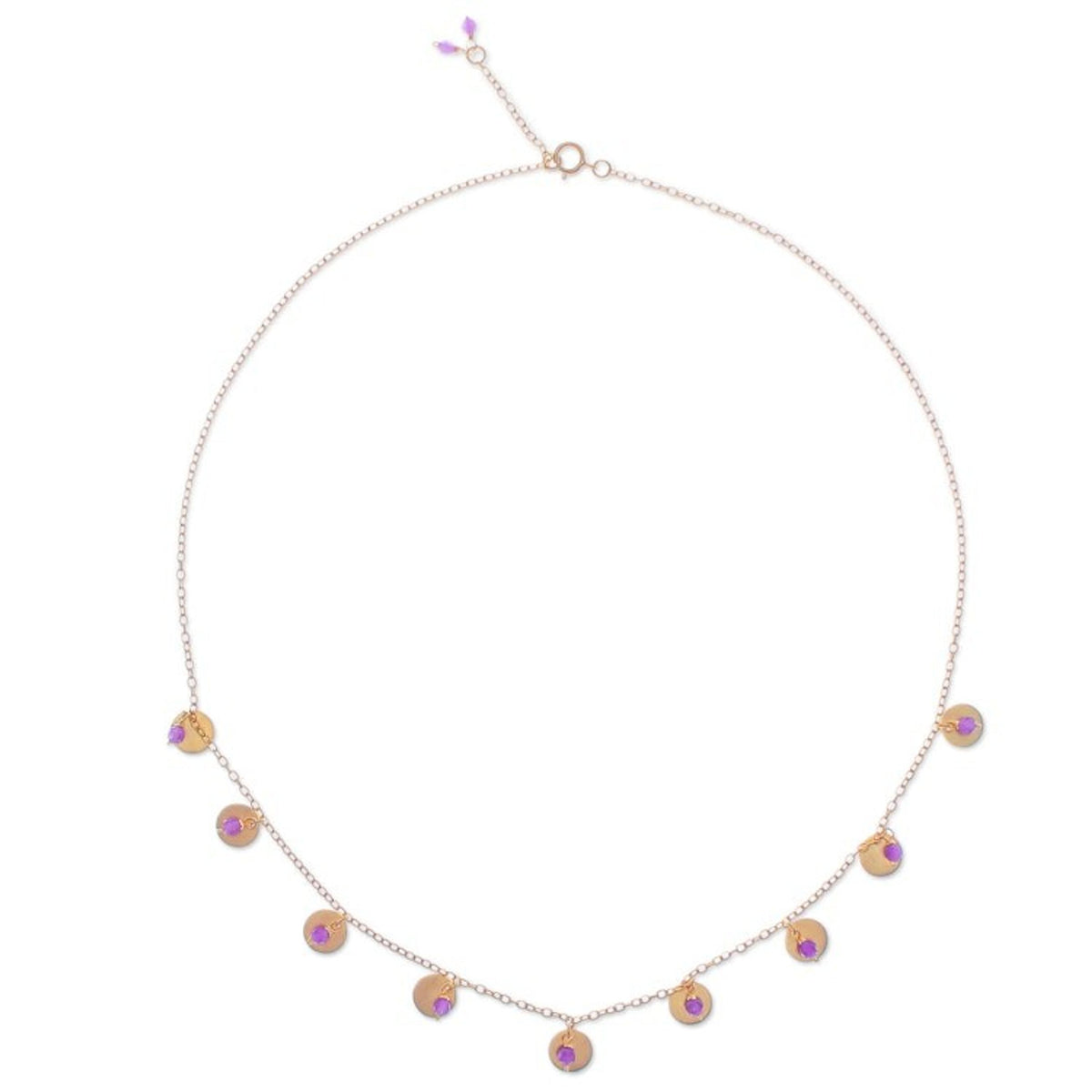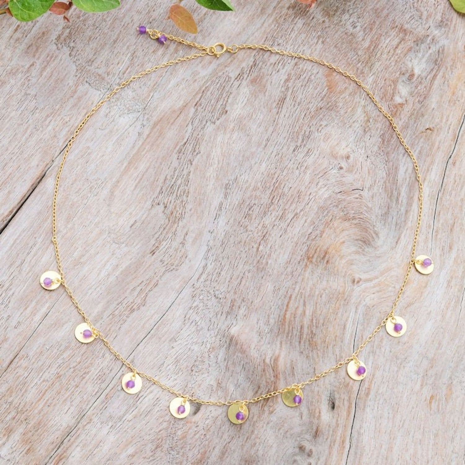 This handcrafted charm necklace is made with amethyst beads and 18k gold-plated 925 sterling silver on a cable chain. It is adjustable from 18.3 to 19.3 inches in length and has a matte finish with a spring ring clasp.