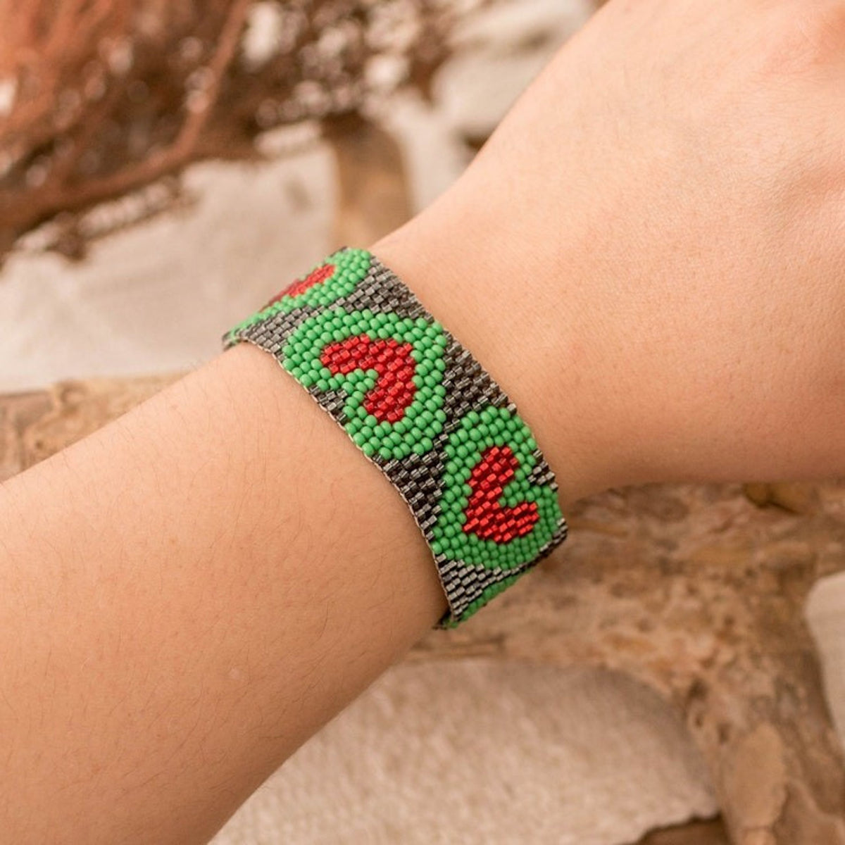 Adjustable Grey Red Green Beaded Bracelet with Heart Theme 'Green Queen of Hearts'