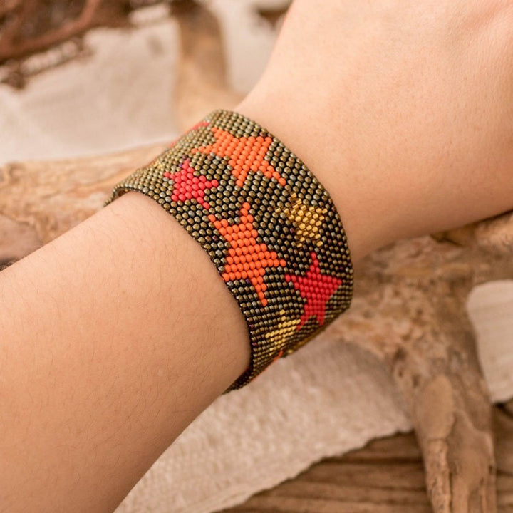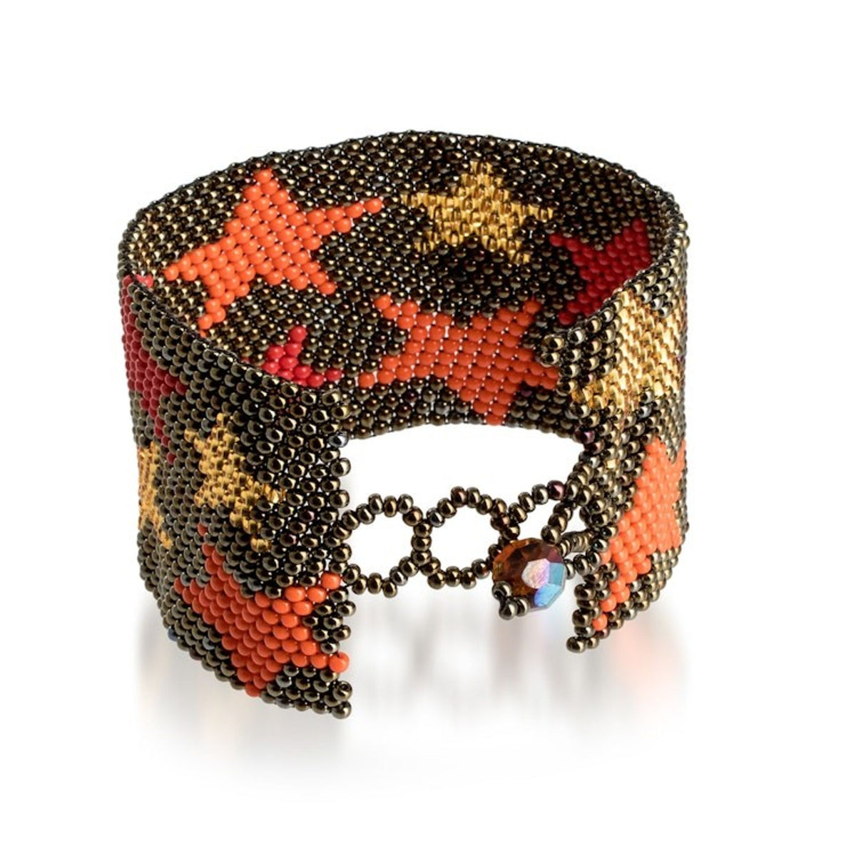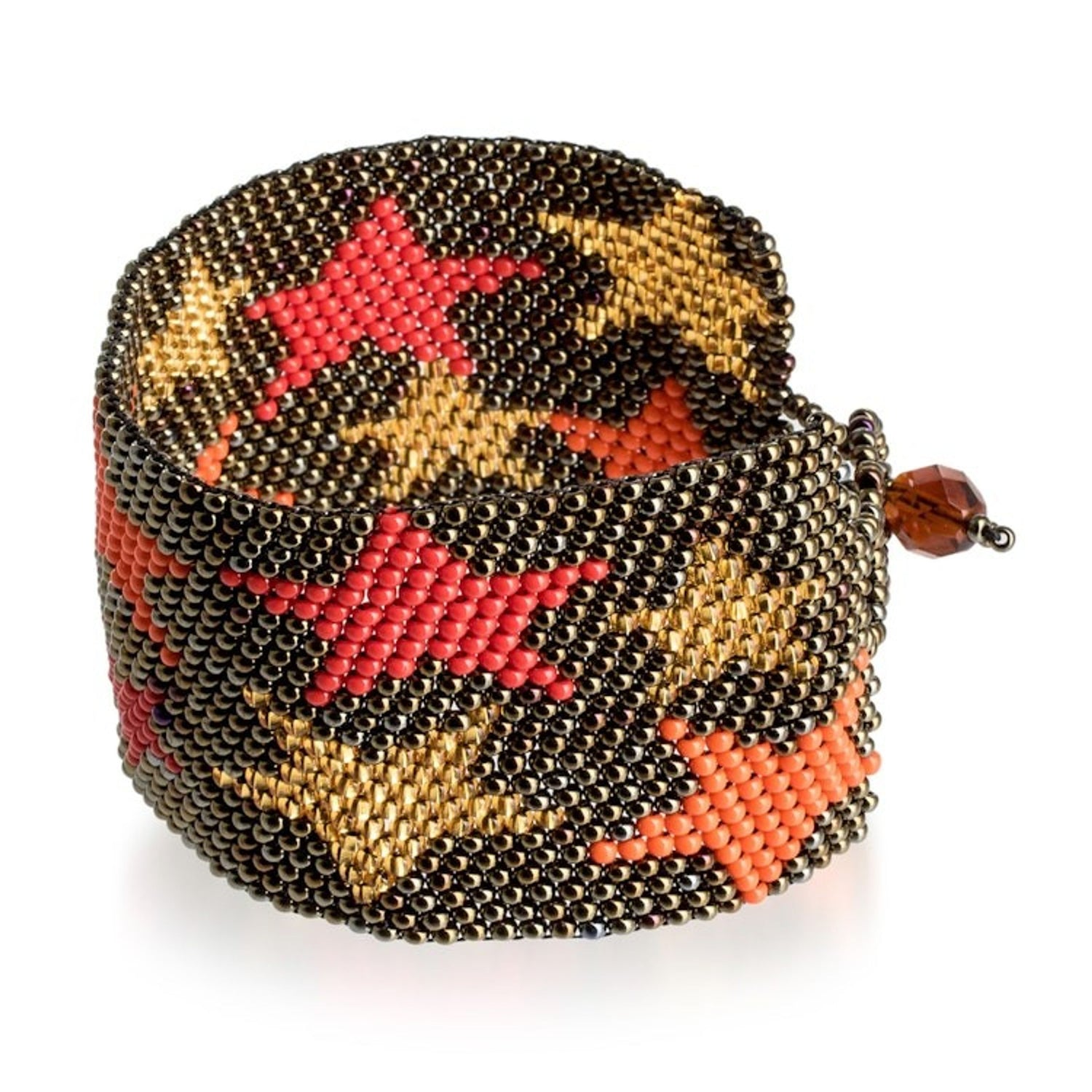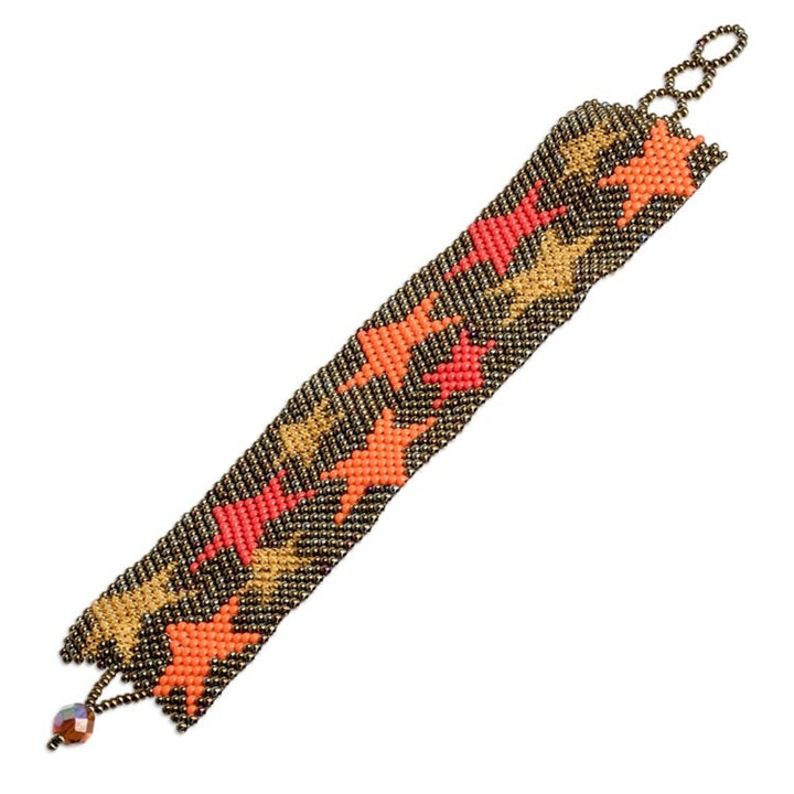 Guatemalan-Made Bronze Glass Beaded Star Wristband Bracelet 'Constellation in Bronze' The "Constellation in Bronze" wristband bracelet immortalizes the region's starry nights. Gifted hands of The Artisans of Panabaj weave a stylish design with a bronze base hue and a star pattern. A brown crystal serves as a button clasp, allowing you to adjust the length. This piece is a beautiful blend of cosmic inspiration and traditional beading.