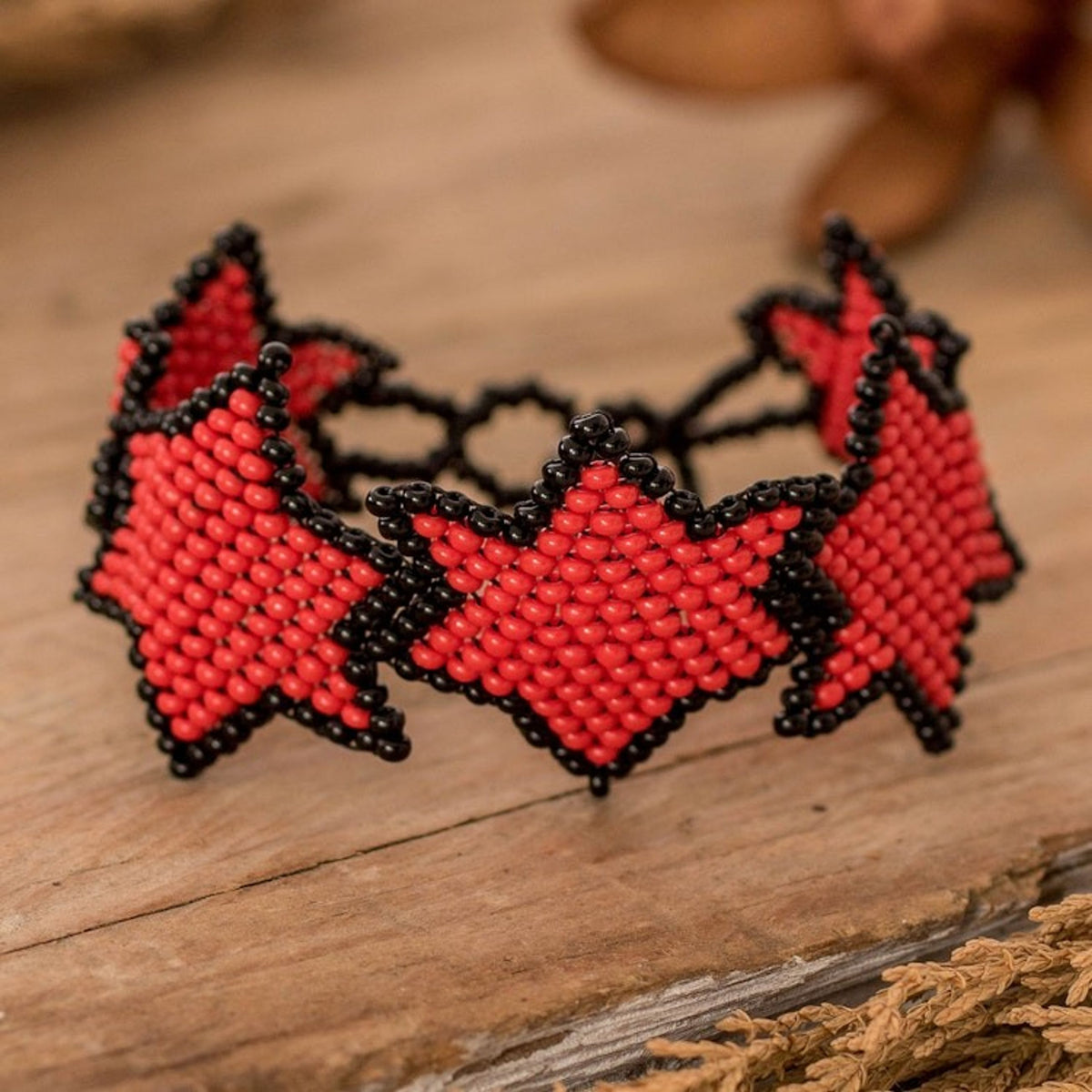 Handcrafted Red and Black Beaded Bracelet with Star Design 'Red Starlight' This "Red Starlight" bracelet is a stylish tribute to the stars. It features a dynamic pattern crafted from tiny glass beads in vivid red and black hues. The precise beadwork creates a geometric brilliance that draws attention with every movement. Adjustable with a crystal bead button, it offers a perfect fit for any wrist and is a wearable piece of handcrafted art.