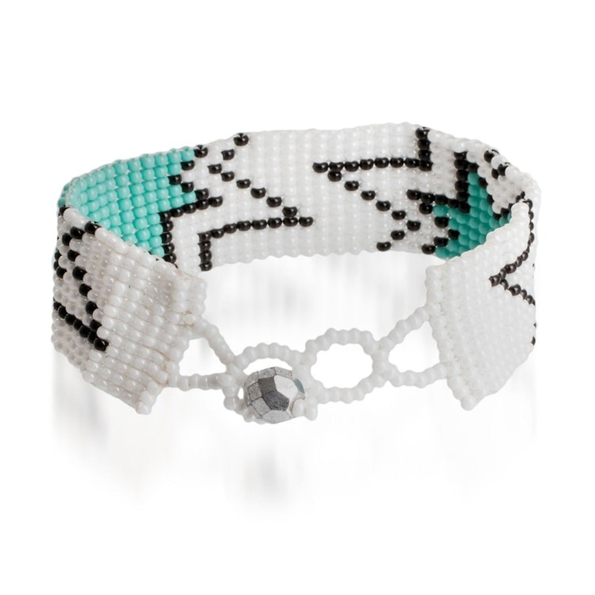 Mint Green and White Glass Beaded Star Wristband Bracelet 'Vital Blast' This "Vital Blast" wristband bracelet adds a blast of refreshing hues to your days. Skillful artists from The Artisans of Panabaj work together to craft this accessory, arranging glass beads around a star-themed pattern. Mint, black, and white colors merge on each motif, while a crystal completes the piece with a convenient button clasp.