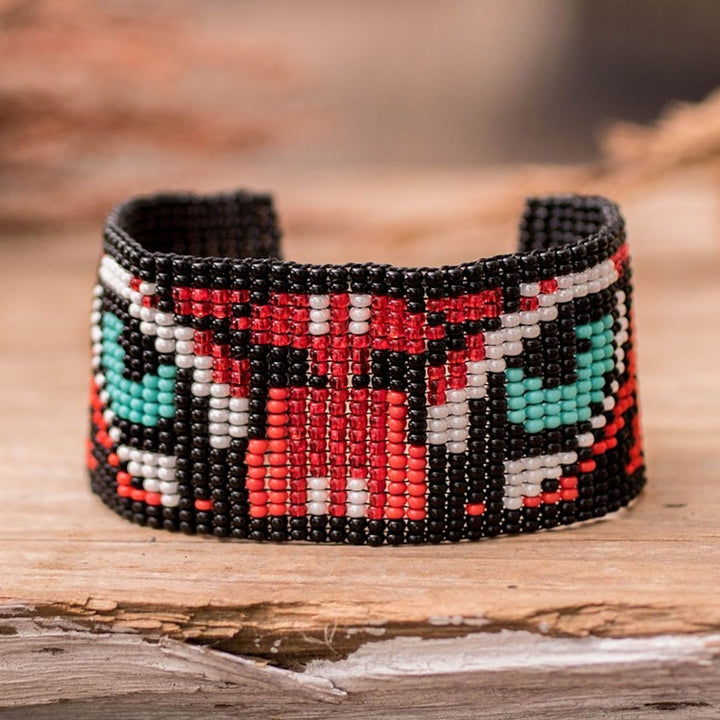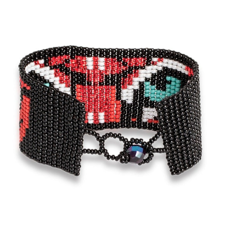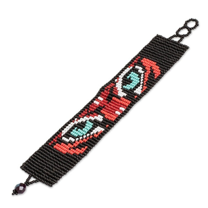 Multicolored Beaded Tiger Motif Bracelet 'Tiger Eyes' This "Tiger Eyes" bracelet is a wonderful beaded accessory created on small looms. Crafted of tiny glass beads, the wide wristband depicts the steady and forbidding gaze of a tiger. The bracelet can be secured at one of three lengths with a crystal button, making it as stylish as it is unique.