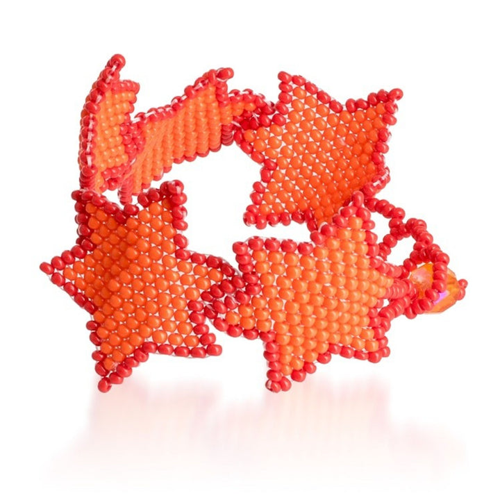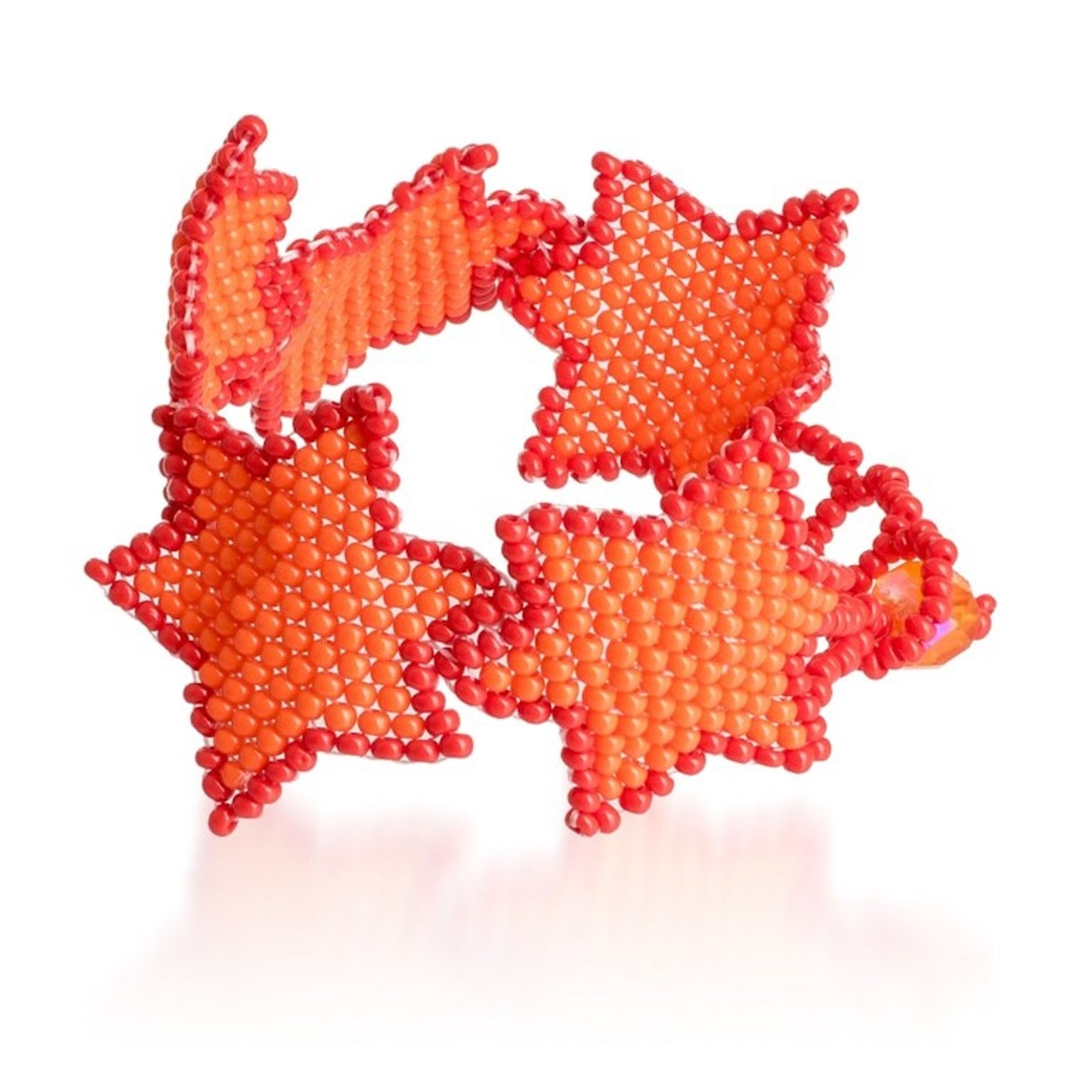 Orange Red Star-Themed Handmade Beaded Wristband Bracelet 'Orange Starlight' This "Orange Starlight" wristband bracelet effortlessly stands out with its awe-inspiring star pattern created from tiny orange and red glass beads. The lively hues blend harmoniously, creating a striking visual impact. Designed with an adjustable closure featuring a crystal bead button, it ensures a perfect fit.