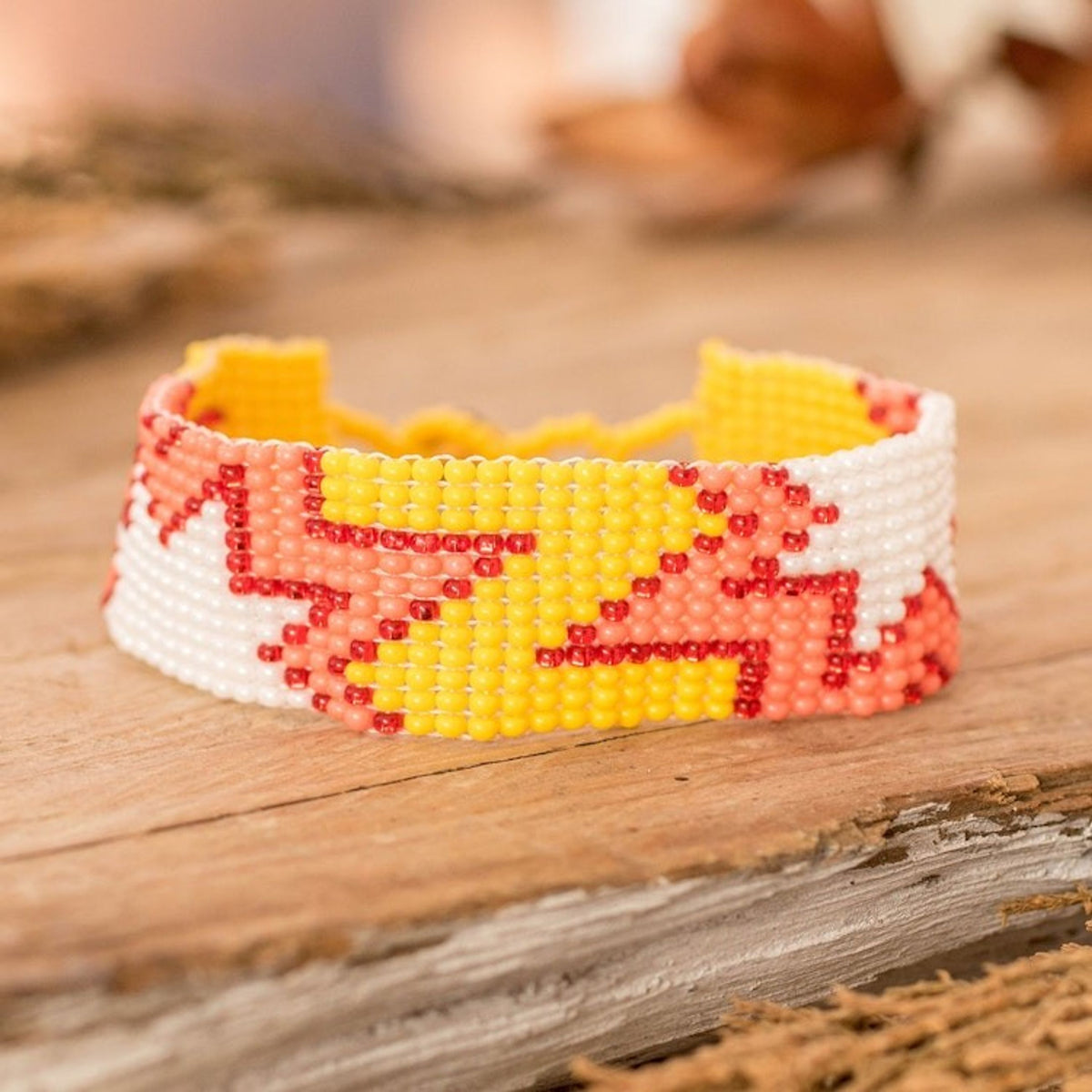 Star-Inspired Glass Beaded Wristband Bracelet in Warm Hues 'Sunrise Blast' This "Sunrise Blast" wristband bracelet evokes the sunrise's beauty with a blast of sublime hues. Glass beads compose the design, merging red, pink, yellow, and white colors around starry motifs. A crystal serves as a button clasp to complete the piece.