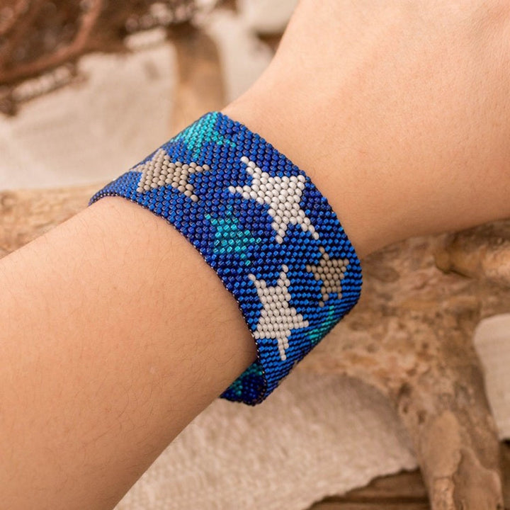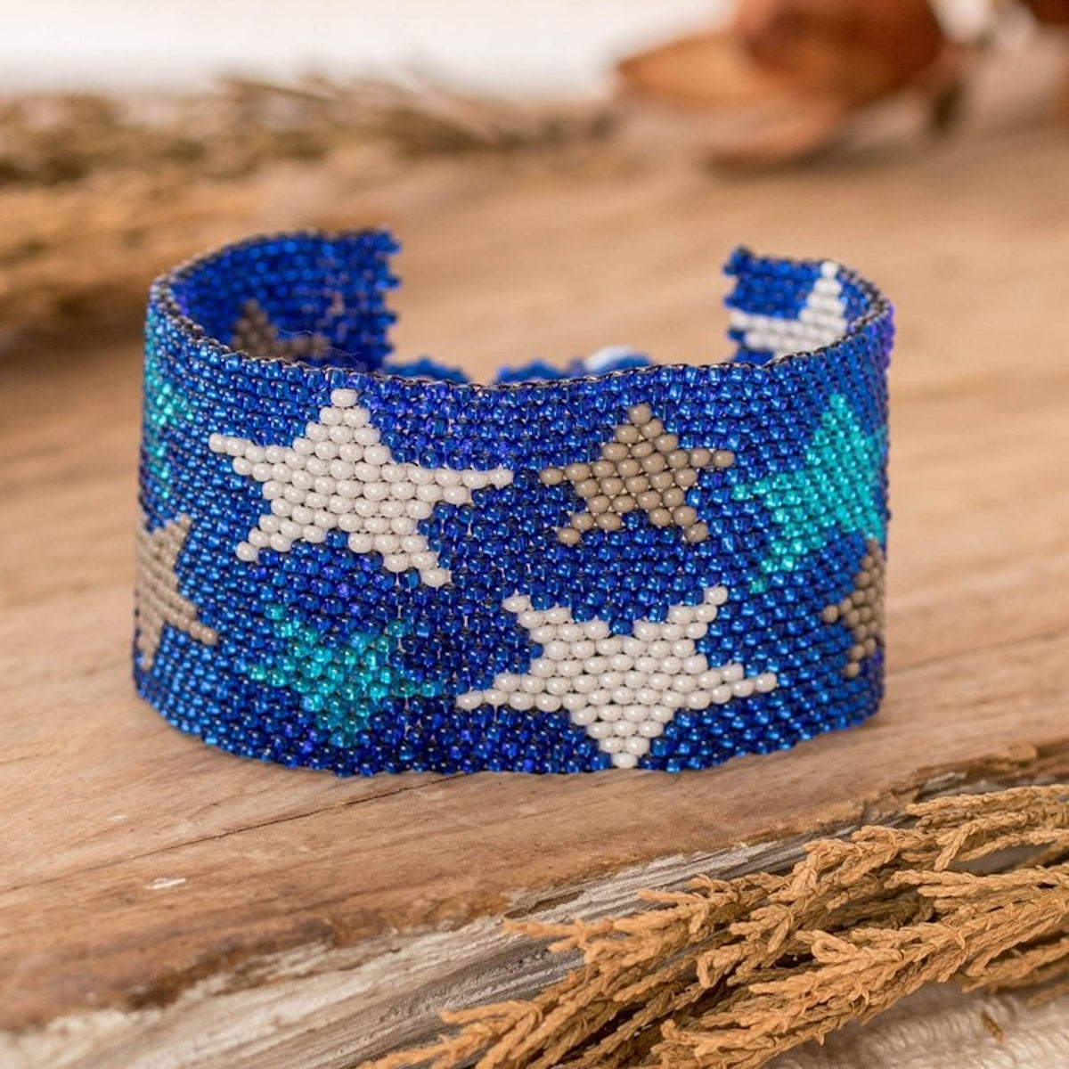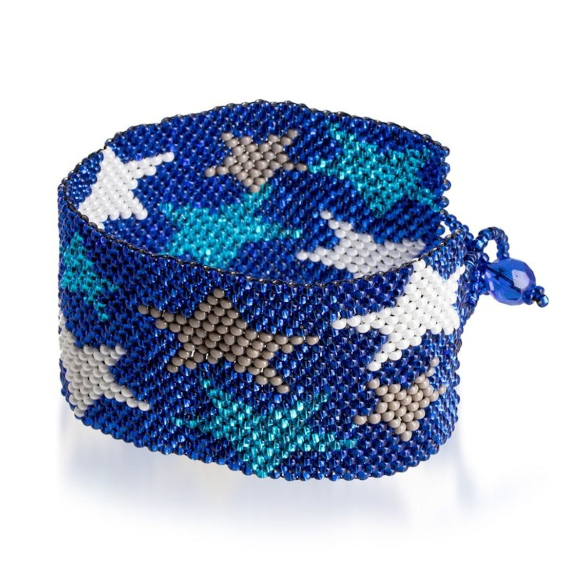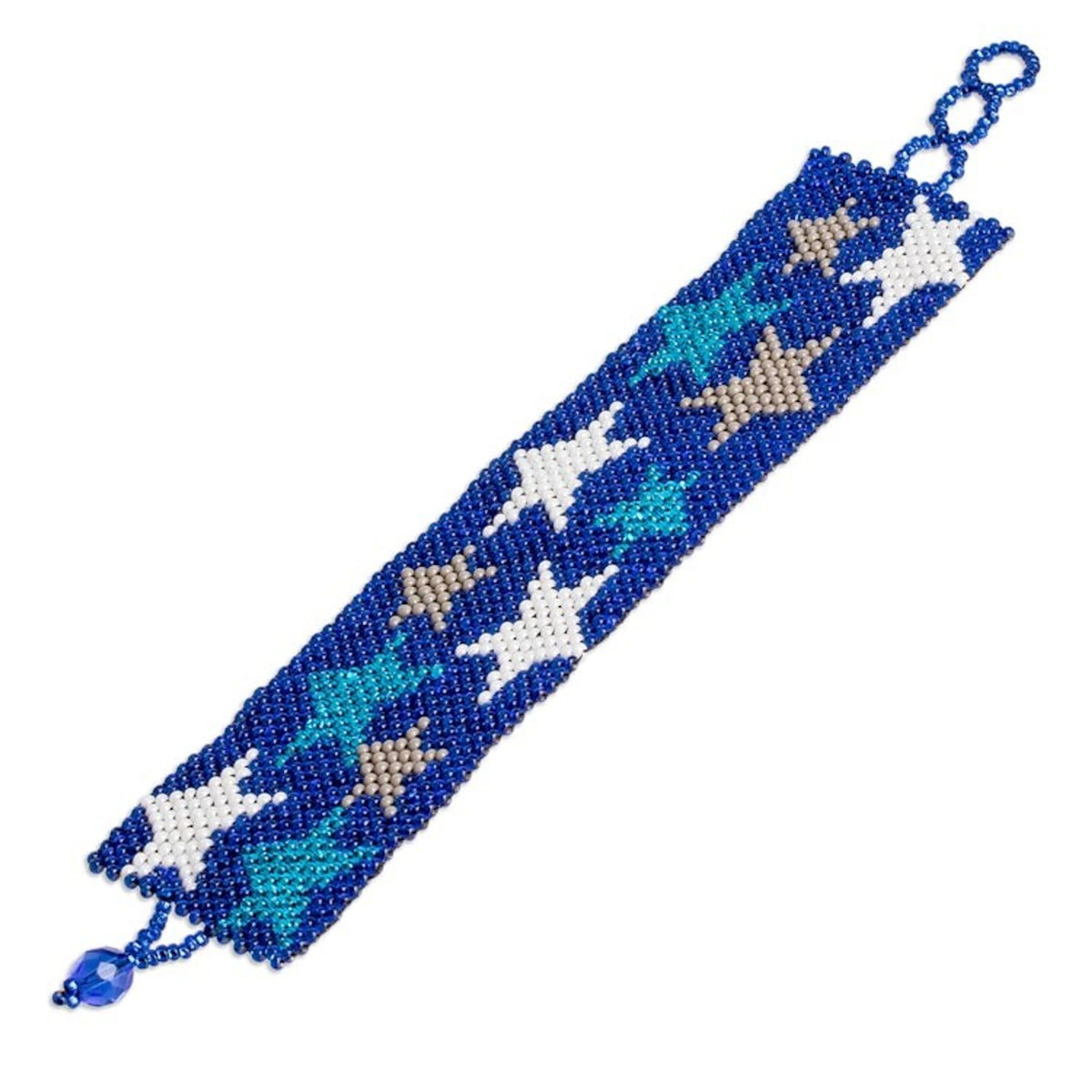 Star-Themed Handmade Beaded Bracelet in Blue White and Grey 'Constellation in Blue' This "Constellation in Blue" wristband bracelet is bright and captivating, boasting radiant star motifs. Vivid glass beads in blue, white, and grey create a lively accessory that stands out in any setting. The adjustable length, secured with a crystal bead button, ensures the perfect fit.