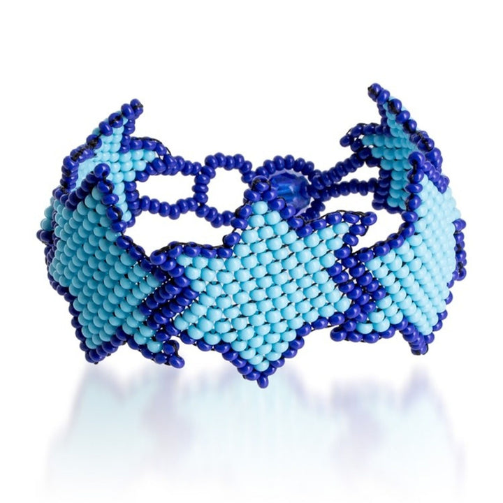 Star-Themed Handmade Beaded Wristband Bracelet in Blue Hues 'Azure Starlight' Inspired by the brilliance of the night sky, this "Azure Starlight" wristband bracelet shimmers with a sublime star design. Petite glass beads in shades of blue form a bold pattern, blending tradition with contemporary style. Secured with a crystal bead button, the adjustable fit ensures comfort and beauty.