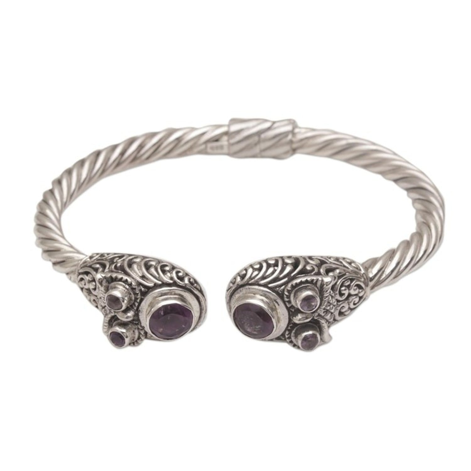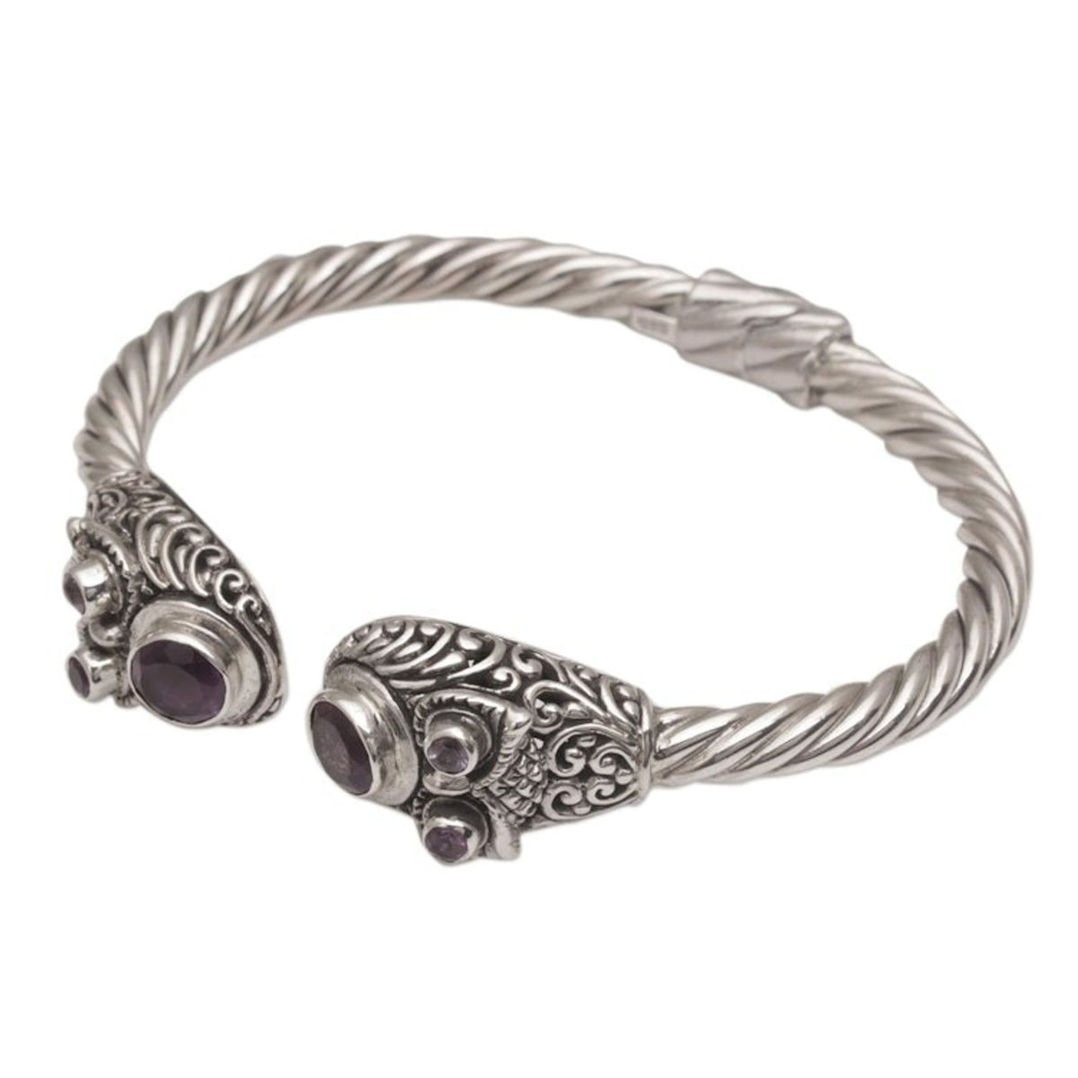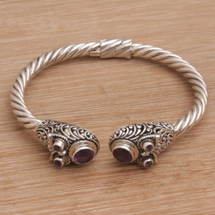 Handmade Amethyst 925 Sterling Silver Cuff Bracelet 'Wandering Eyes' Balinese artisan Komang Suastra designs and crafts this bracelet in gorgeous detail. The cuff is first carefully created from sterling silver. Then, brilliant, purple amethyst 'eyes' totaling nearly 1.5 carats are placed in a vine-motif setting. A hidden hinge makes it easy to put on and take off.