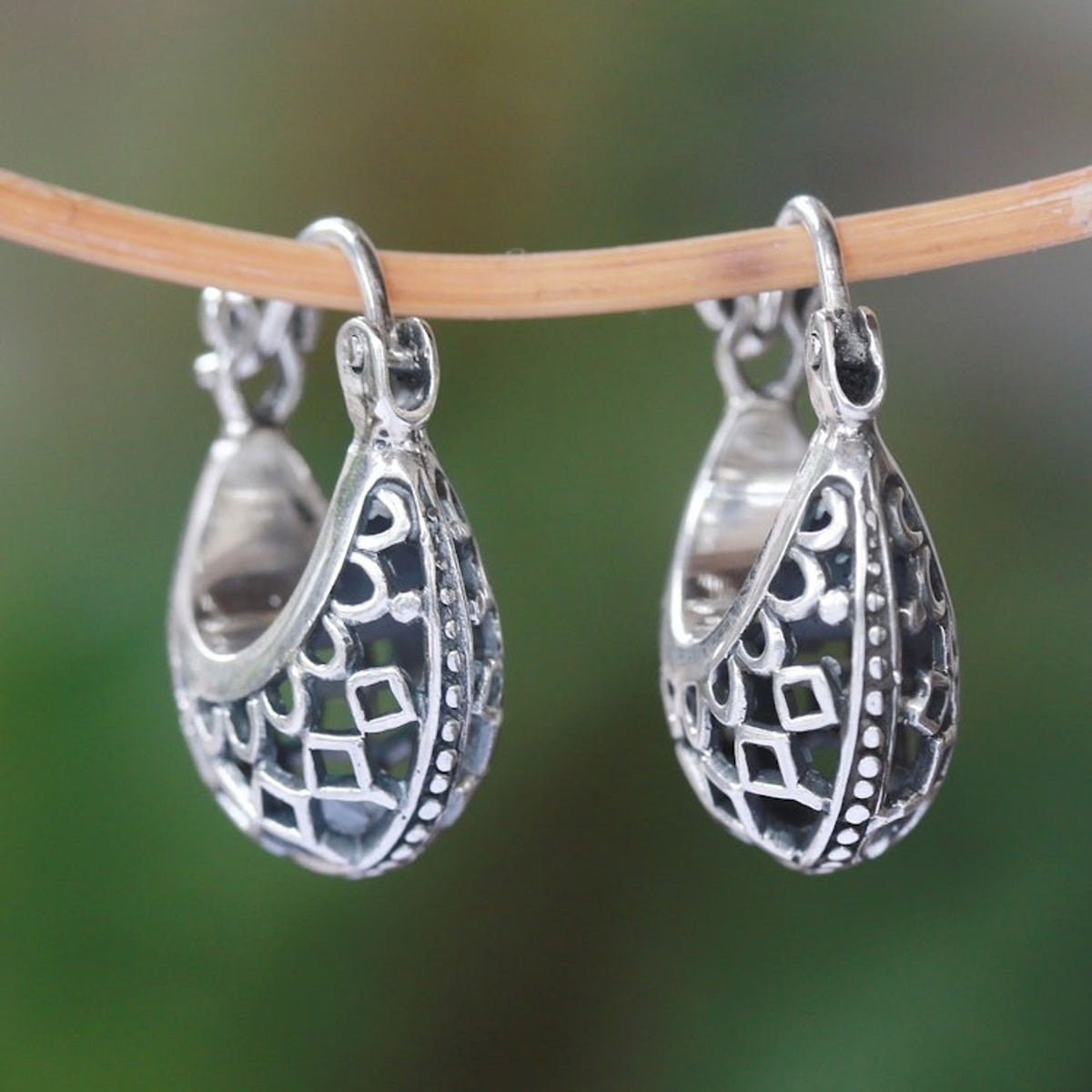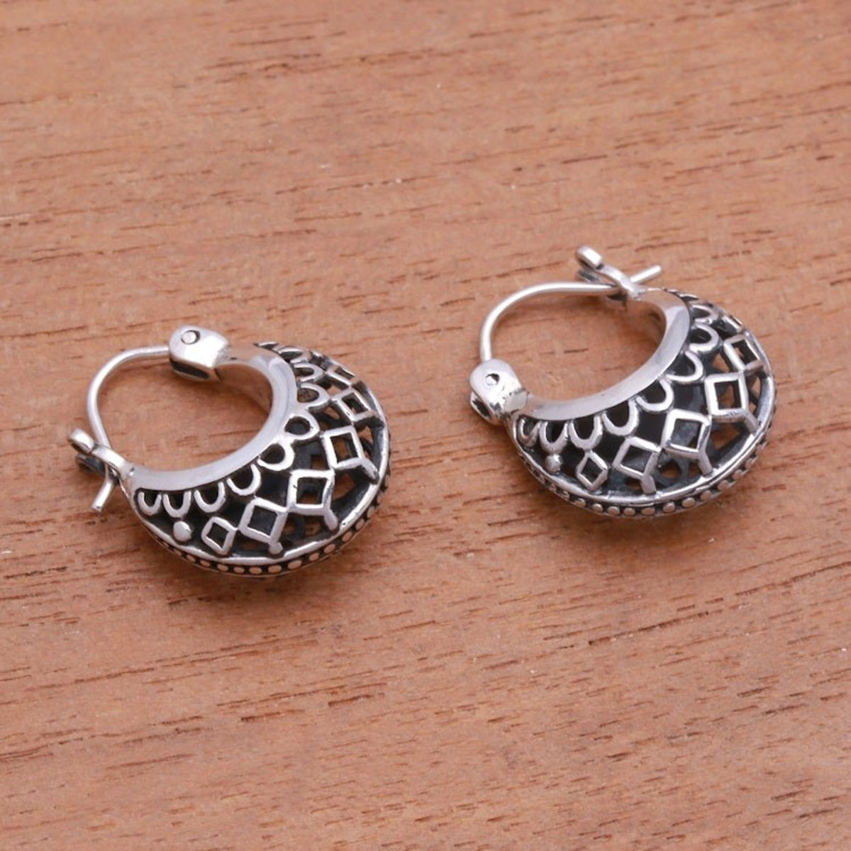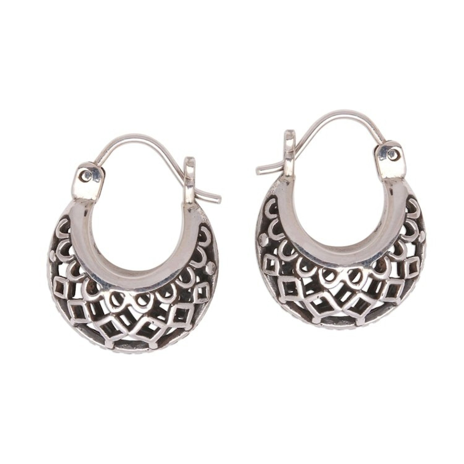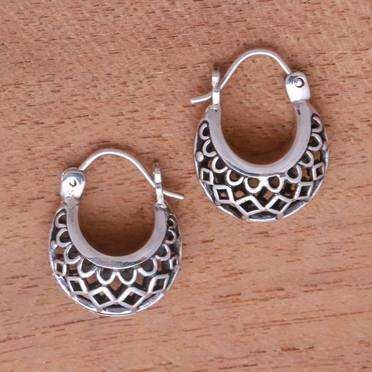 Openwork Sterling Silver Hoop Earrings from Bali 'Curved Elegance'