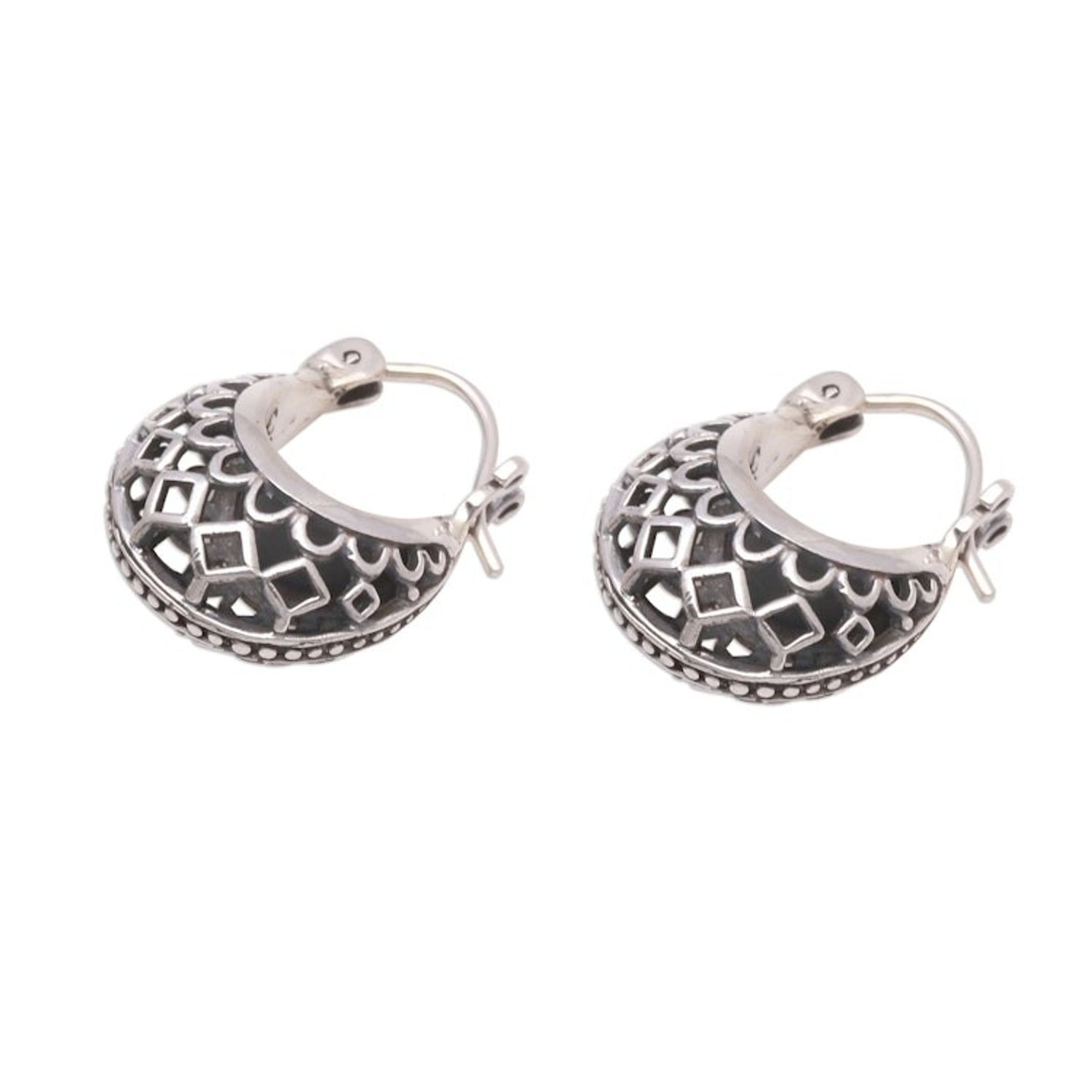 Openwork Sterling Silver Hoop Earrings from Bali 'Curved Elegance' Crafted from sterling silver, these "Curved Elegance" earrings feature curved and square openwork patterns with a combination of finishes. Balinese artisan Komang Suastra creates these hoop earrings, which hang like lovely baskets.