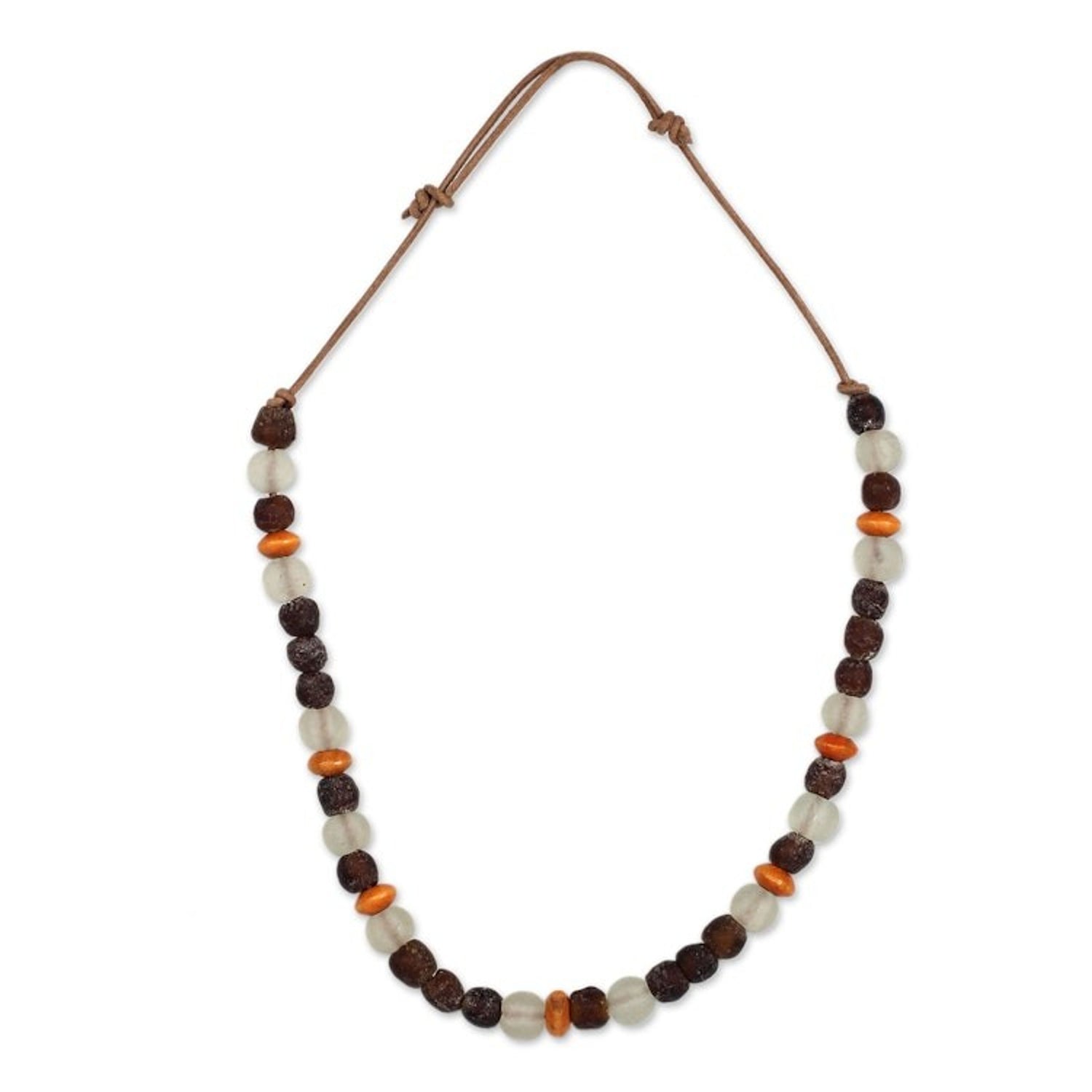 A Good Lady This A Good Lady necklace by Ghanaian artisan Rita Addo Zakour is a testament to the beauty of natural and recycled materials. The design elegantly combines weathered sese wood beads with vibrant recycled yellow glass and frosted glass globes, creating a rich texture and earthy appeal. Strung on a simple brown leather cord, the necklace features a sliding knot for adjustable length. Named “Ewuraba Pa,” or “a good lady” in the Akan language, the piece honors the spirit of resilience and grace.