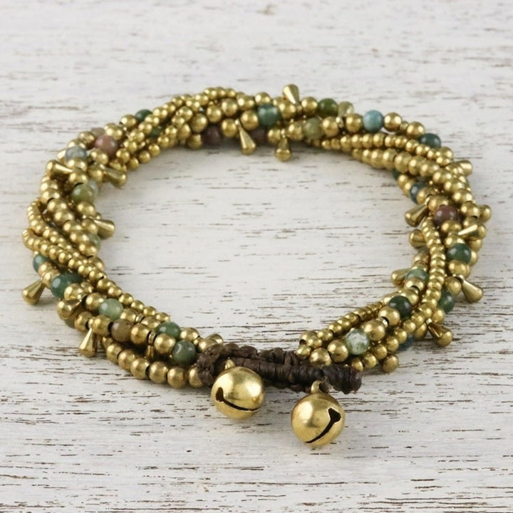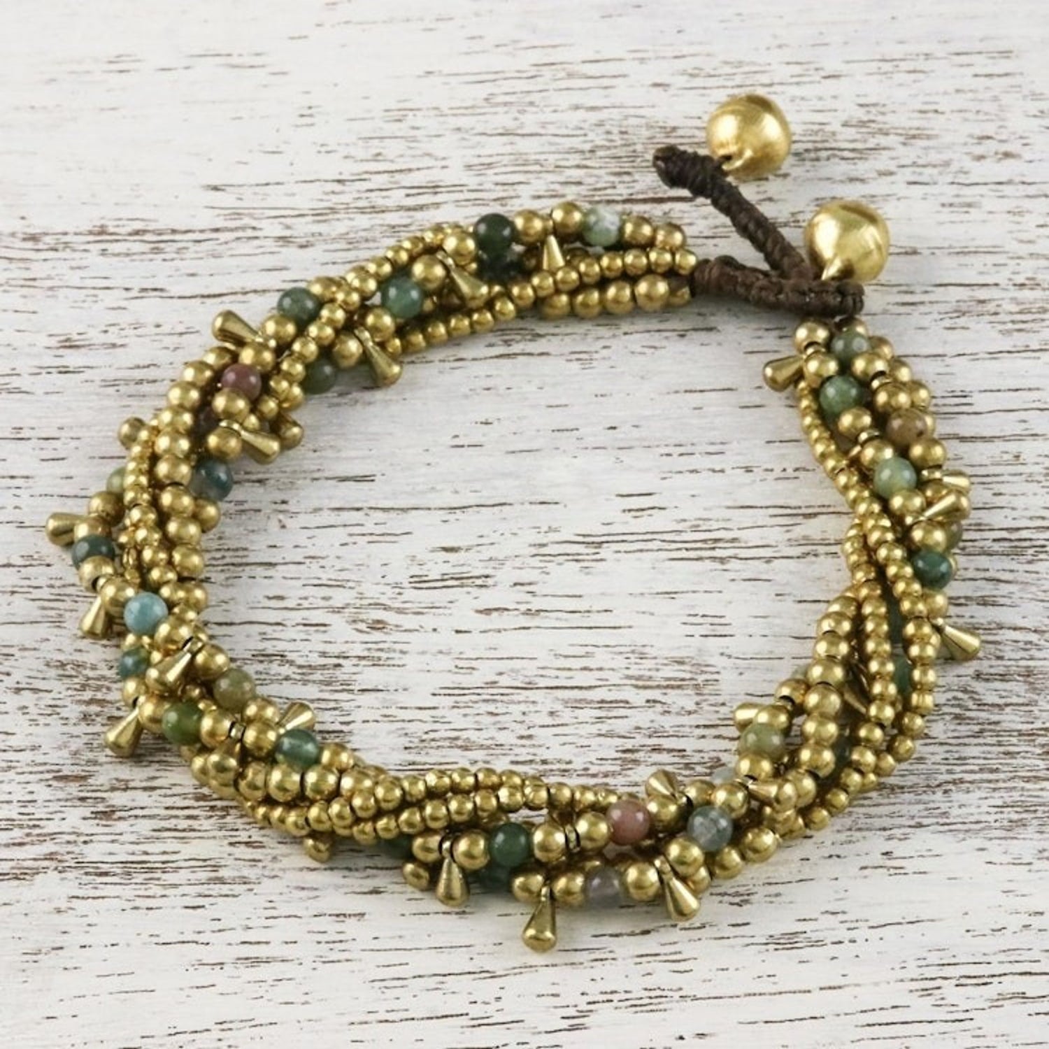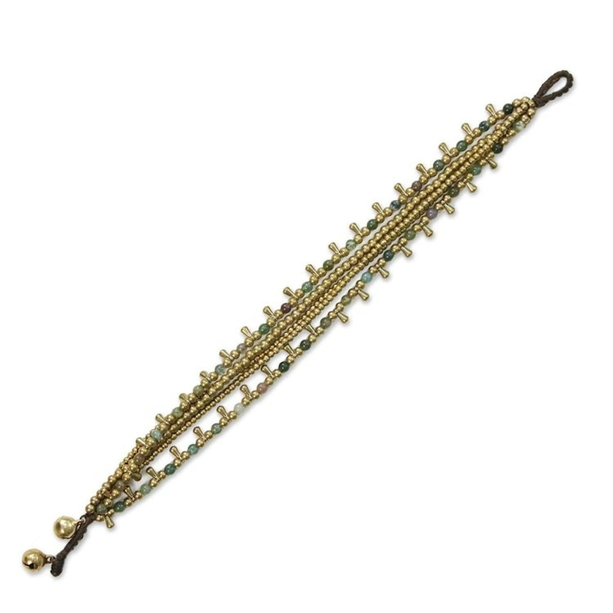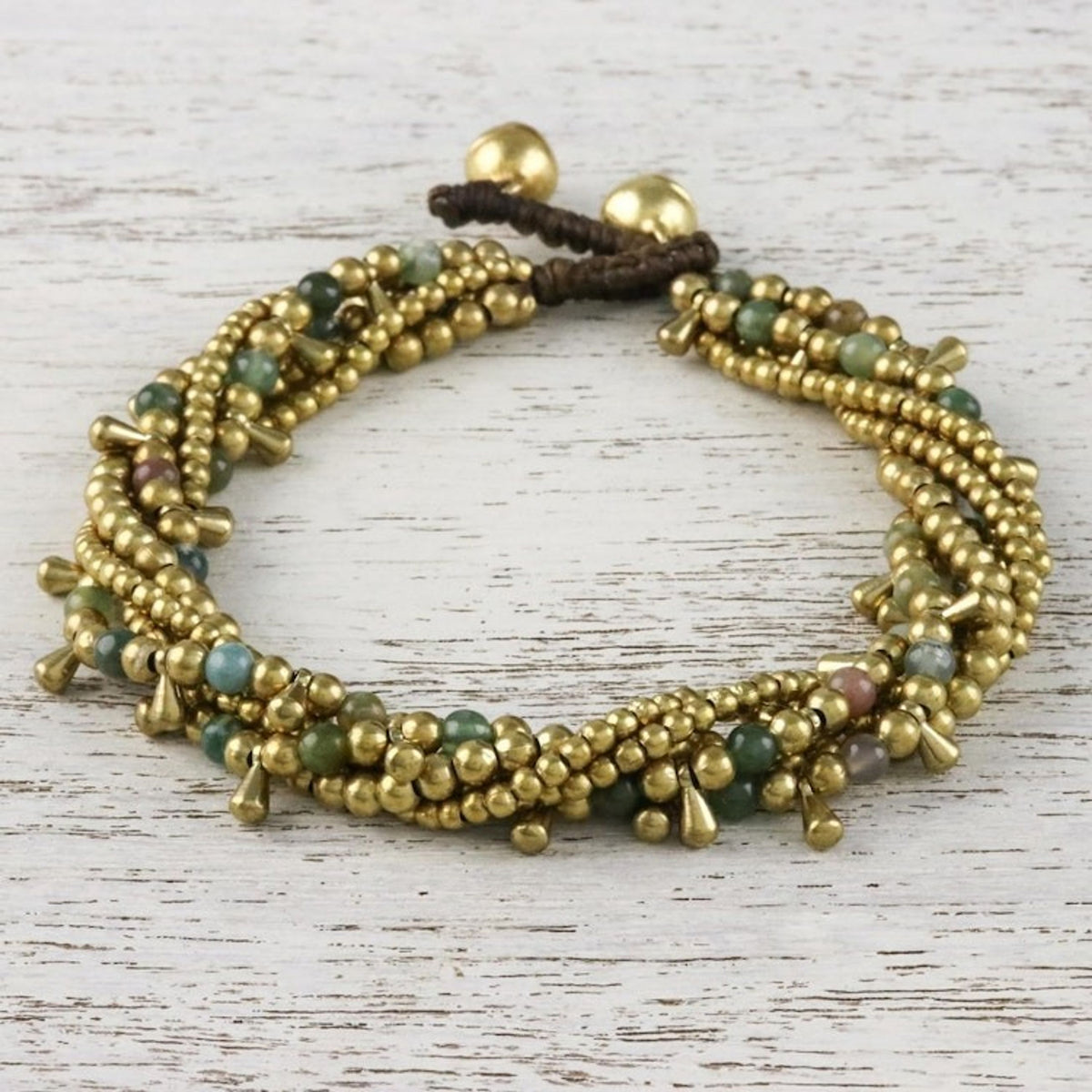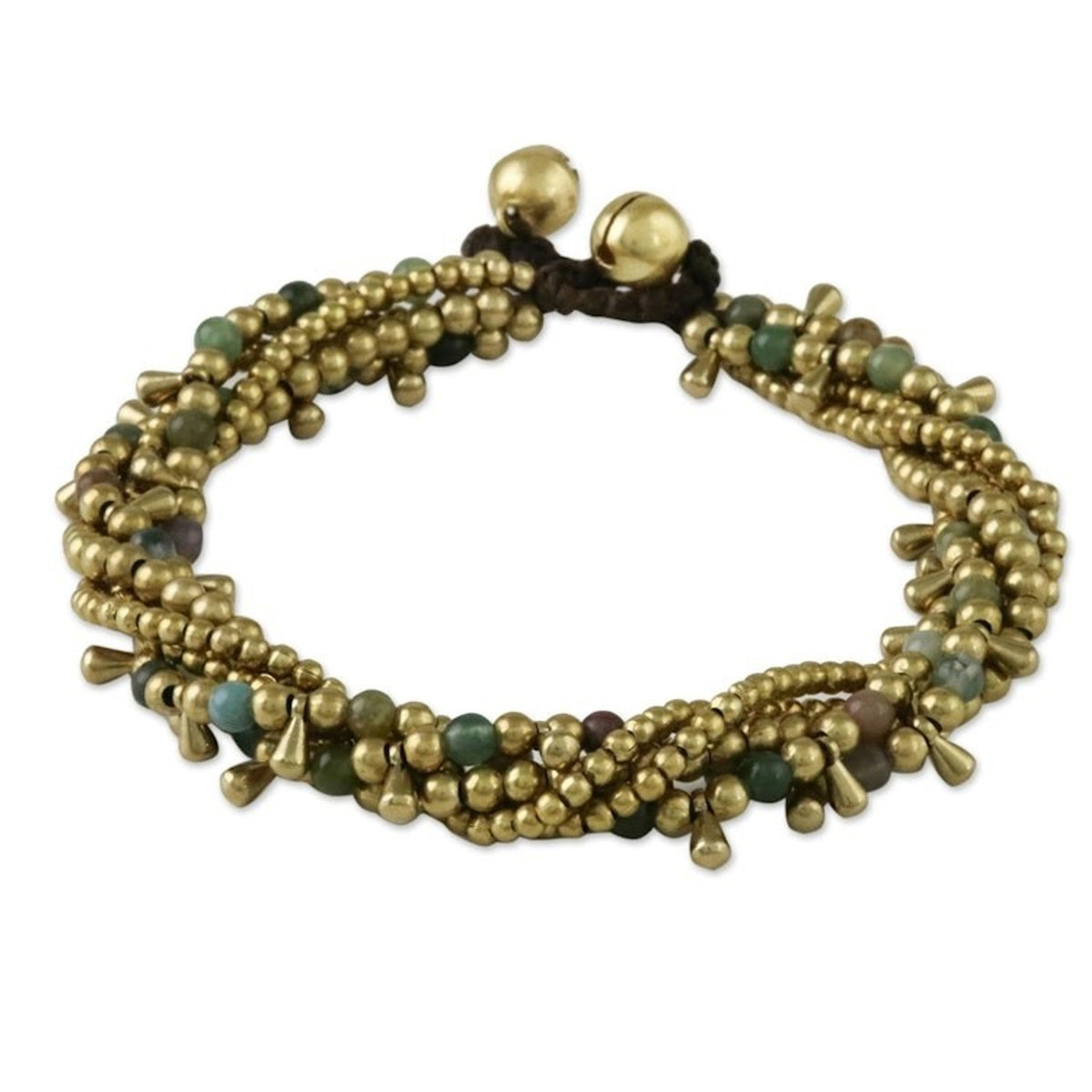 Handcrafted from heat-treated agate and brass beads on a polyester cord, this adjustable bracelet measures 7.8 inches min L x 8.8 inches max L and features a button clasp. The color of the stones may vary slightly and the piece features bells that produce sound.