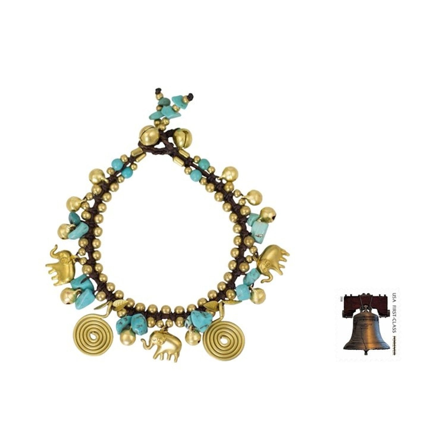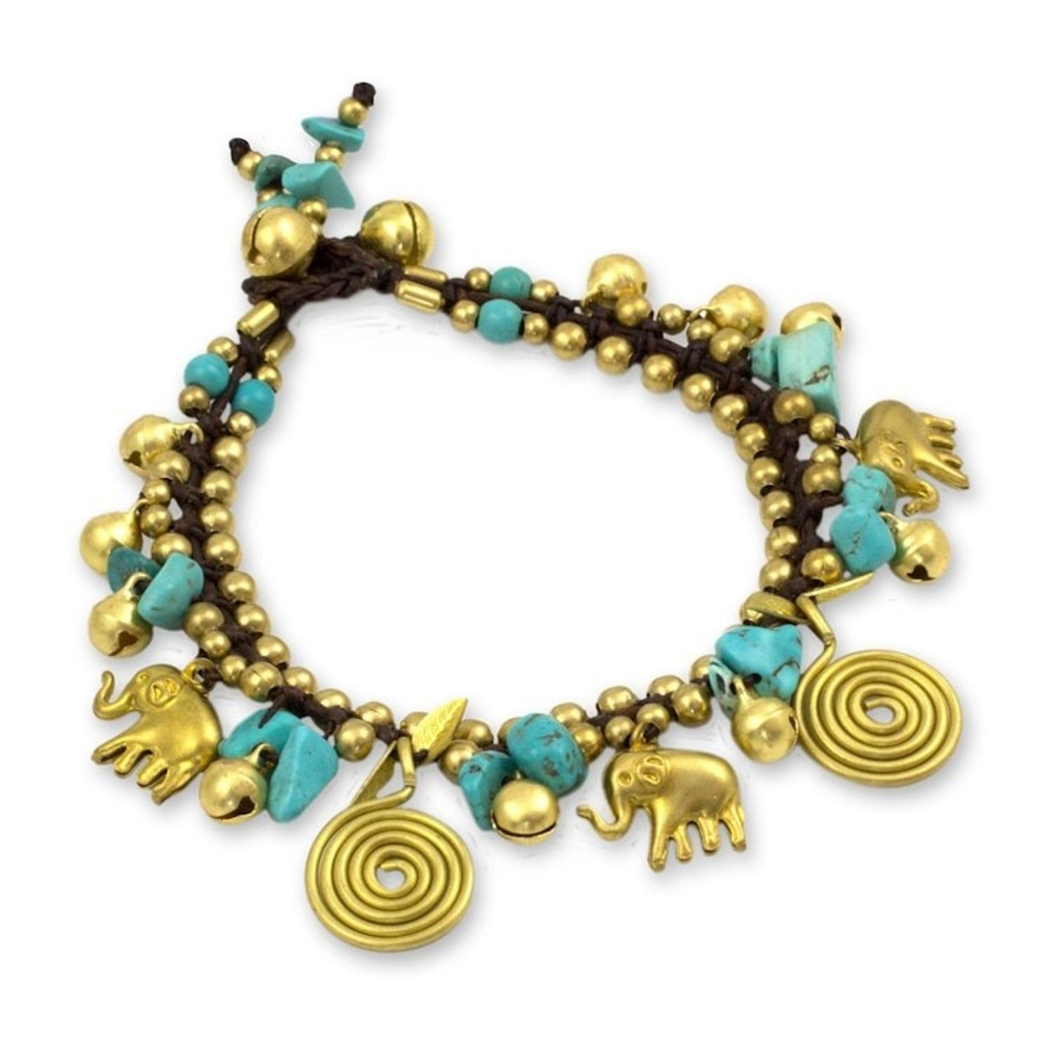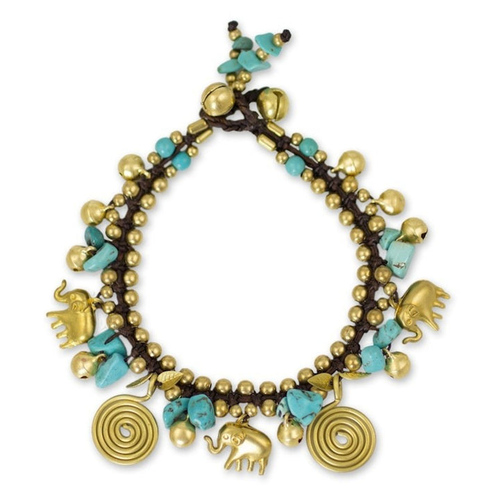 This Splendor of Siam bracelet by Thai artisan Tiraphan Hasub captures the charm of old Thailand with its rich details. The brown braided bracelet features a delightful combination of golden brass charms, including elephants, spirals, and ringing bells, all alternating with turquoise-blue dyed calcite beads. The piece beautifully showcases traditional Thai motifs and is designed to fasten at one of two lengths, making it both symbolic and versatile.