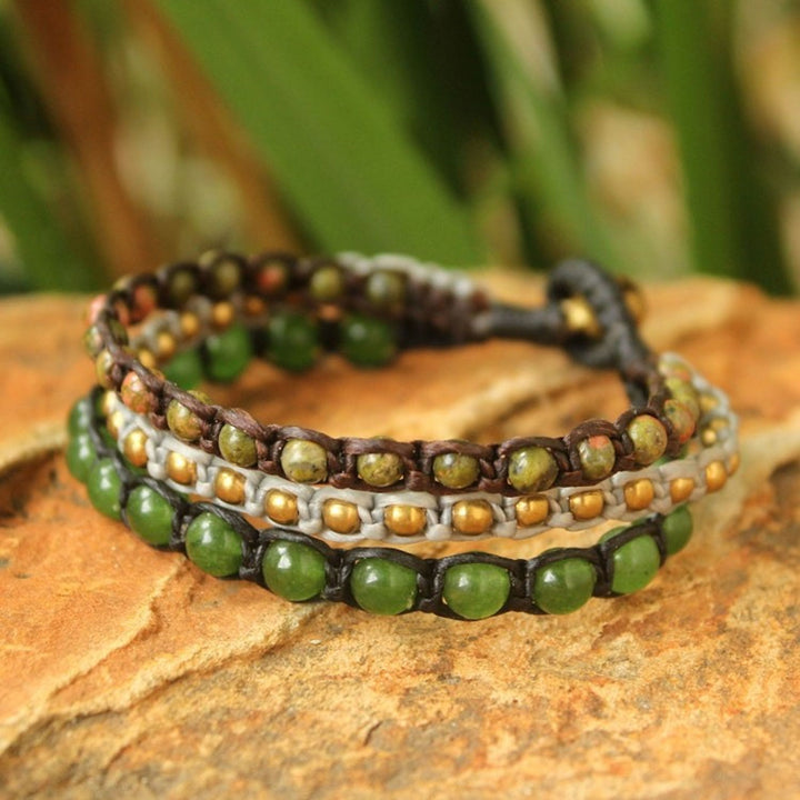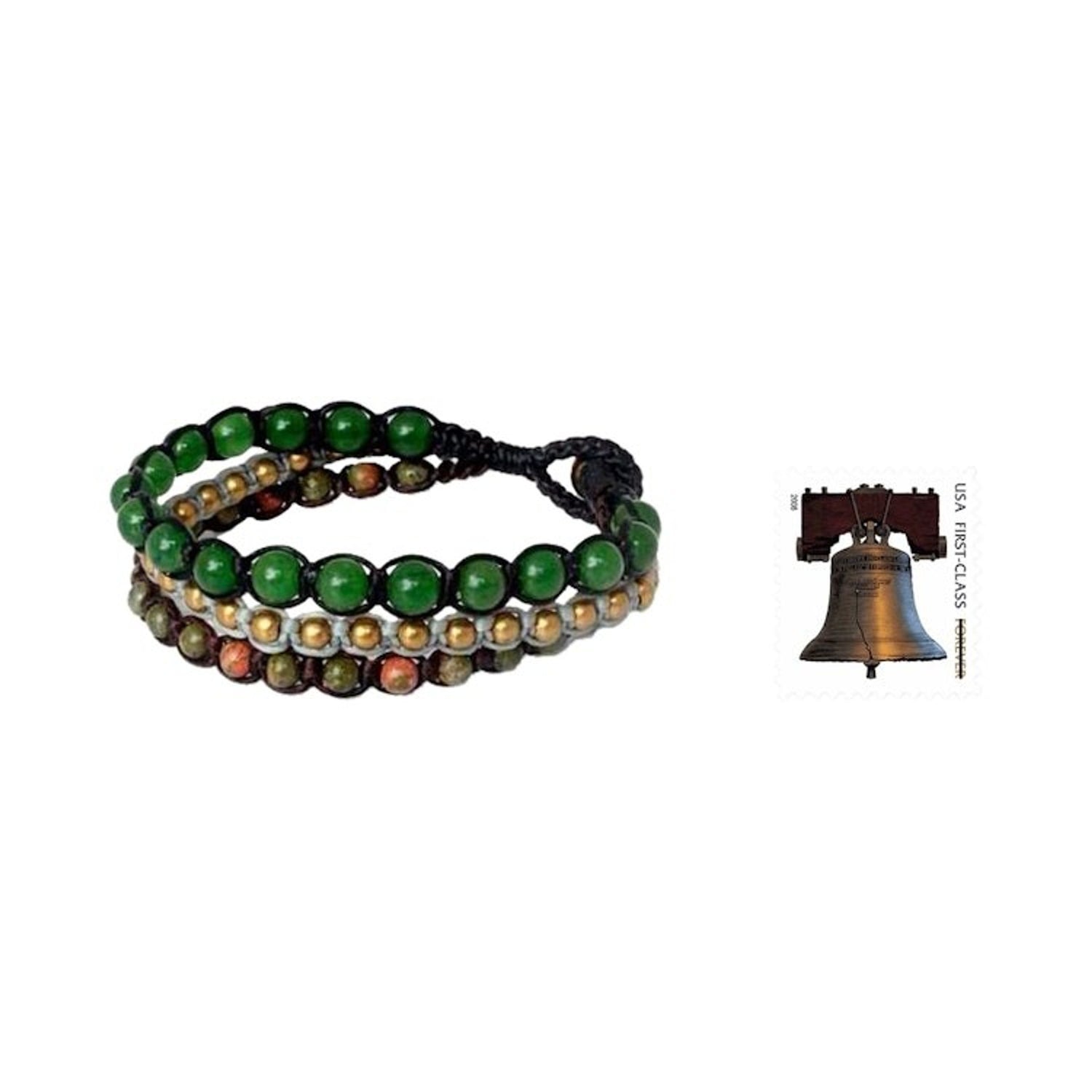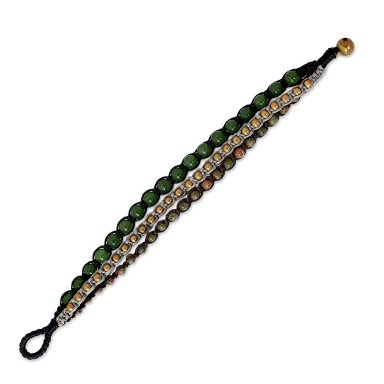 Handcrafted from unakite, dyed quartz, and brass beads on waxed polyester cord, this bracelet measures 7.5 inches L x 0.7 inches W and features a toggle clasp.