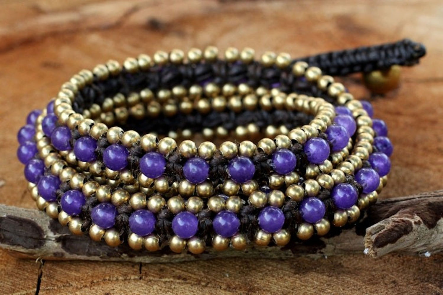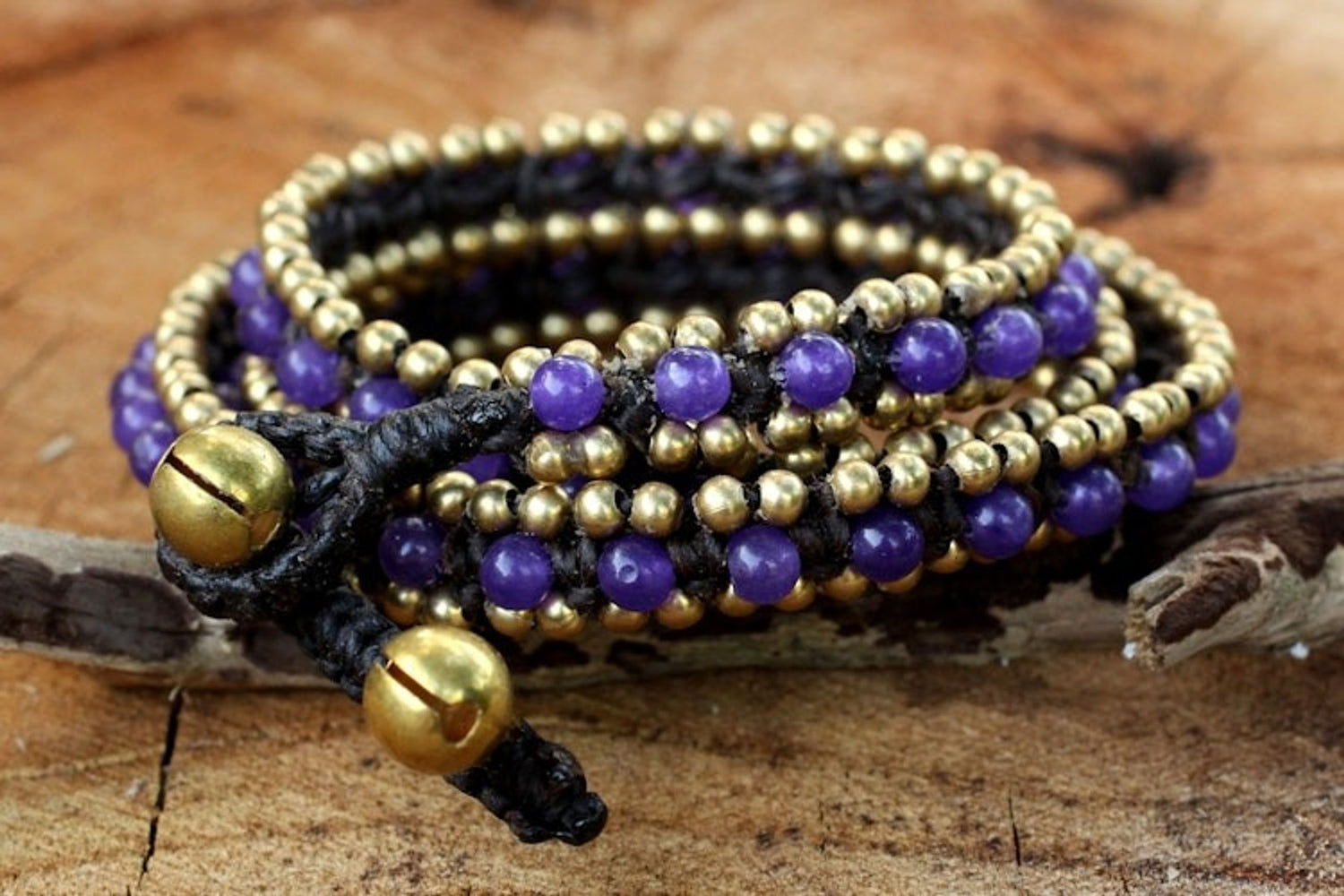 This Violet Happiness bracelet by Thai artisan Tiraphan Hasub is a beautiful, hand-knotted piece that wraps around the wrist. The design features rich purple dyed quartz, which mingles with gleaming brass beads to create a harmonious and elegant look. The bracelet is adorned with small brass beads and finished with silent bells that form the clasp, providing the symbolic charm of bells without the sound. This piece is a testament to the artisan's meticulous craftsmanship and love for beautiful accessories.