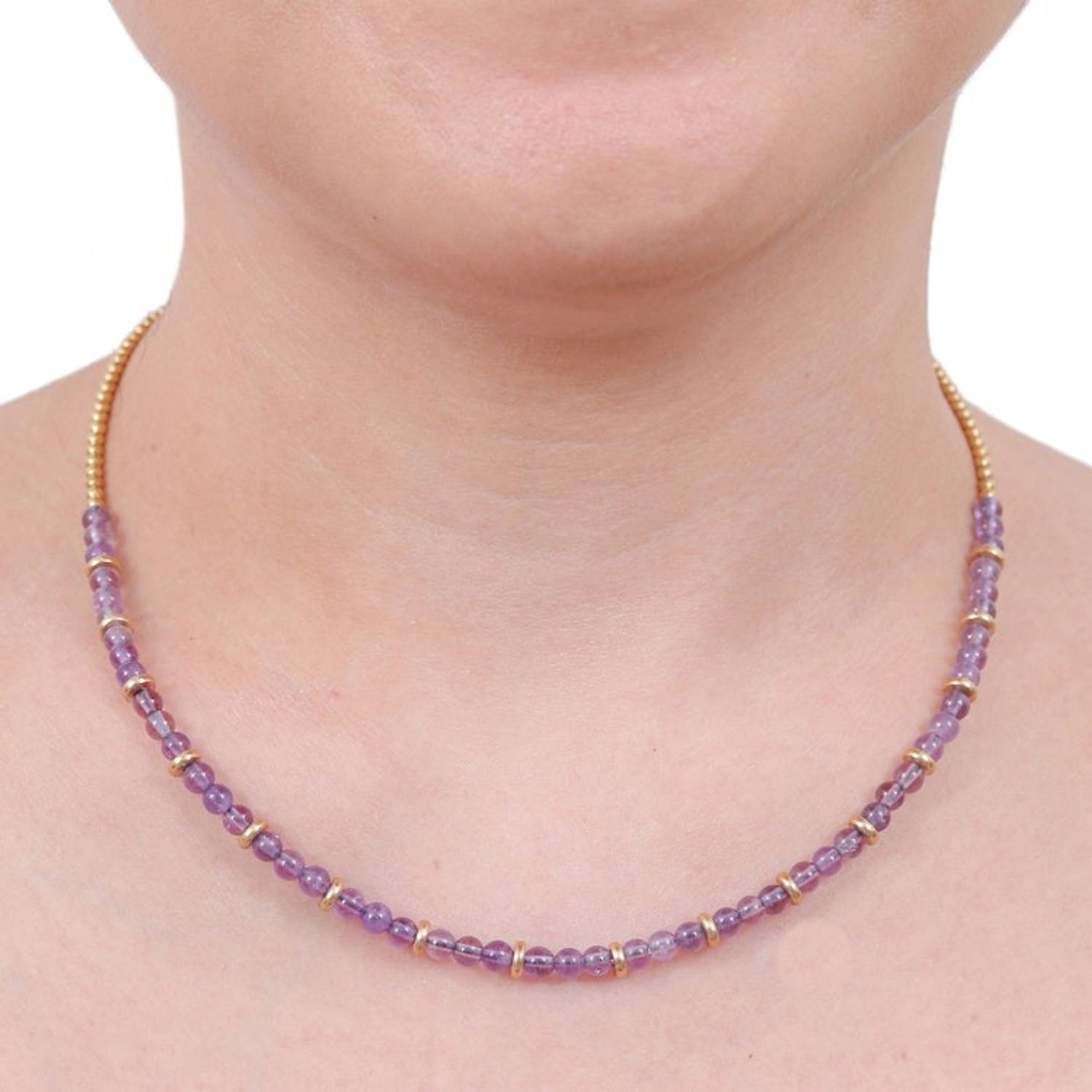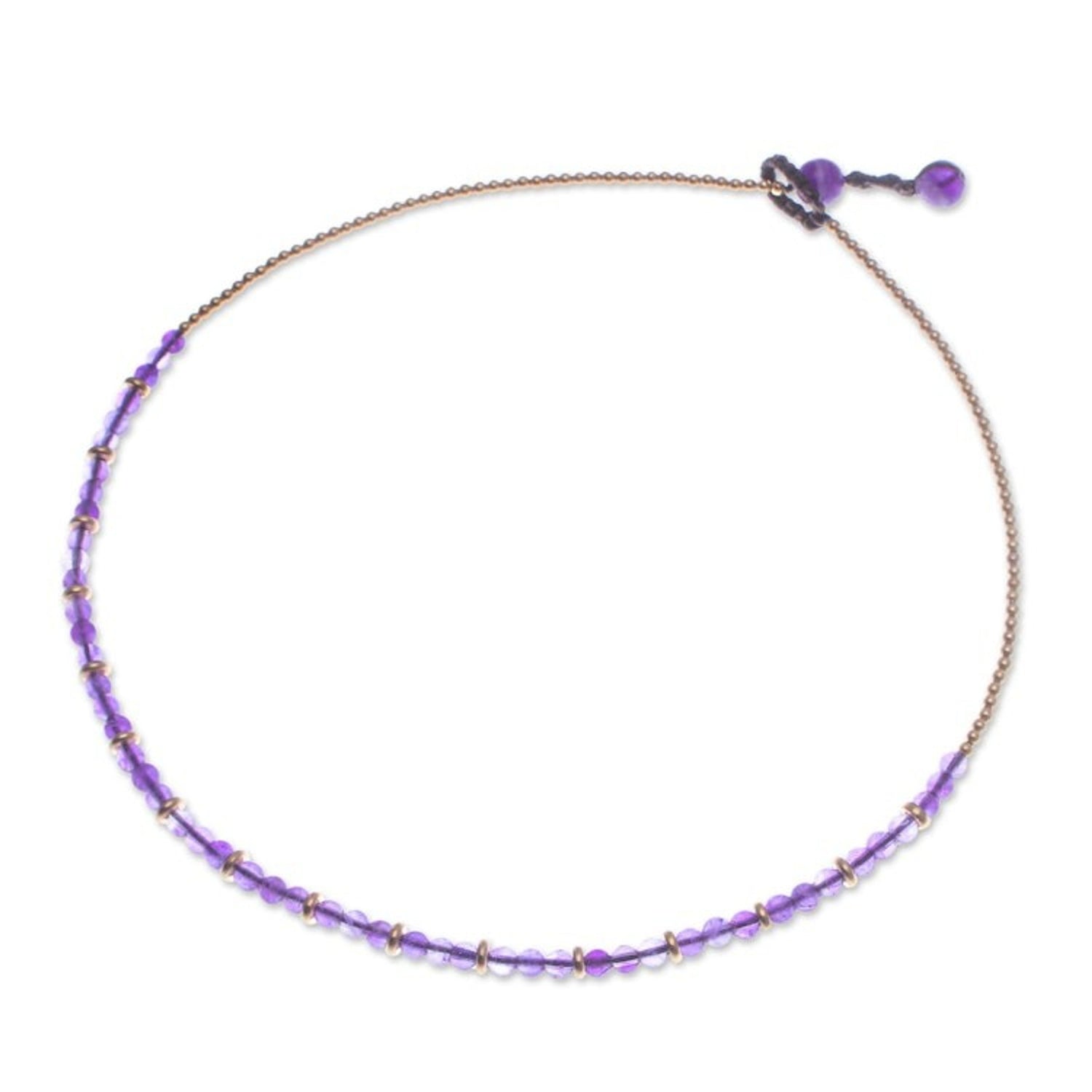 Handcrafted from amethyst and brass beads on a waxed polyester cord, this necklace measures 17 inches min L x 17.8 inches max L and features a button clasp. Natural variations in the stone's color and variegation are expected.