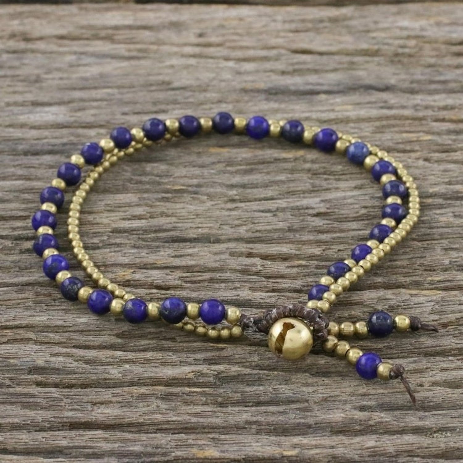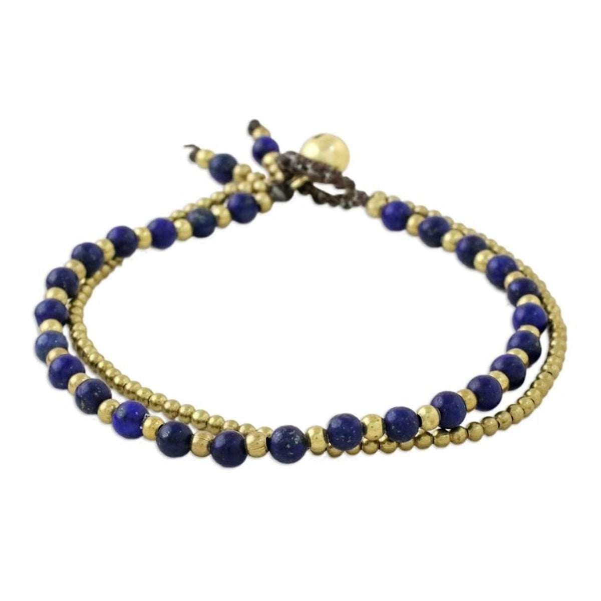Handcrafted from dyed lapis lazuli and brass beads on waxed polyester cord, this bracelet measures 7.8 inches L and features a button clasp. The color of the stones may vary slightly and the piece features bells that produce sound.