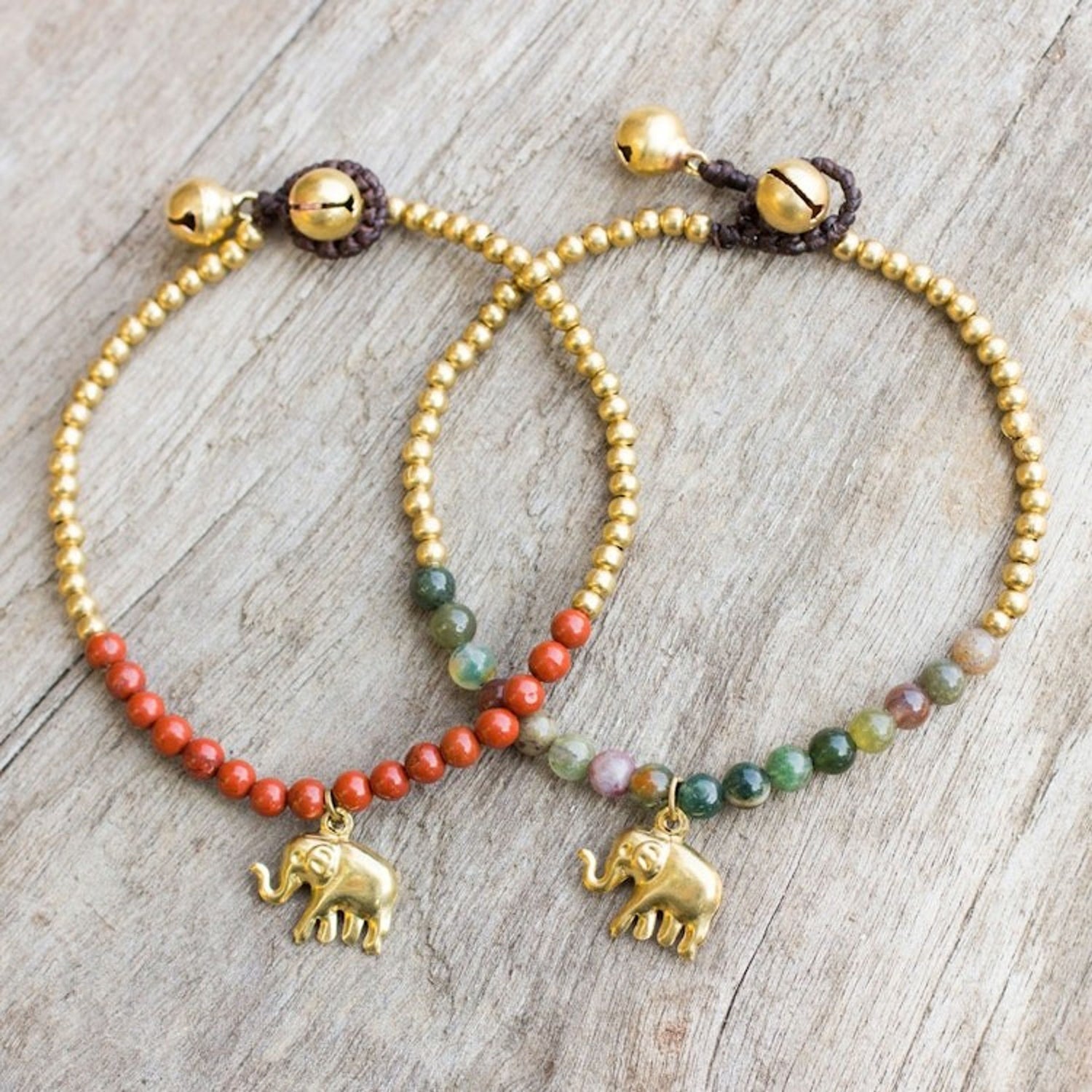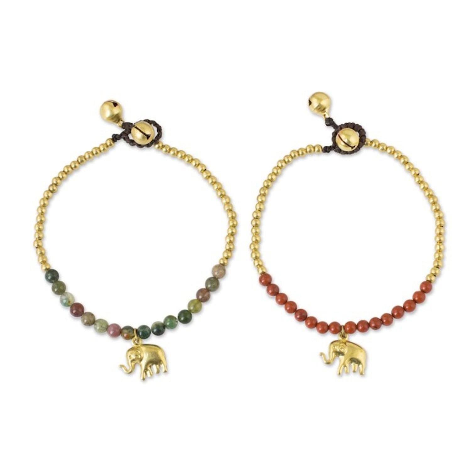 This Stylish Elephants set of two bracelets by Thai artisan Tiraphan Hasub exudes Thai style with charming elephant charms and shiny bells. Each bracelet is handcrafted with shiny brass beads and features a dangling elephant charm. One bracelet is centered with vibrant orange jasper, while the other features a beautiful green jasper. The set fastens at one of two lengths, making them a perfect pair for personal wear or as a thoughtful gift.