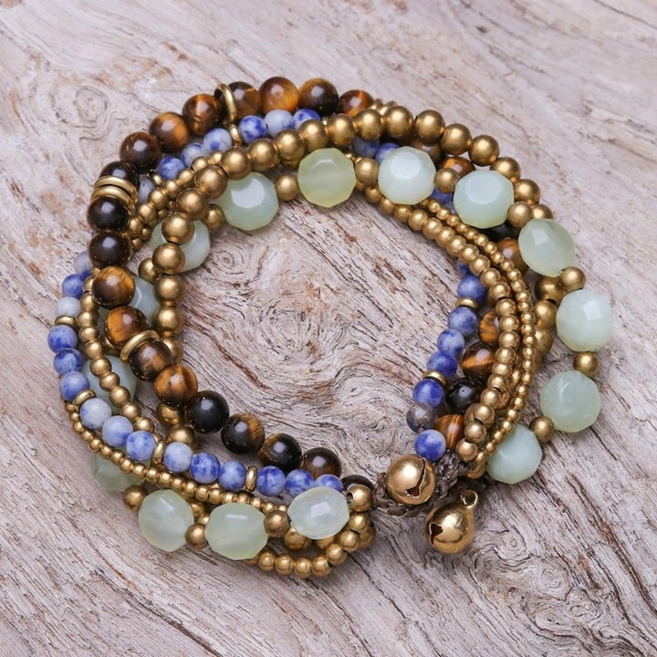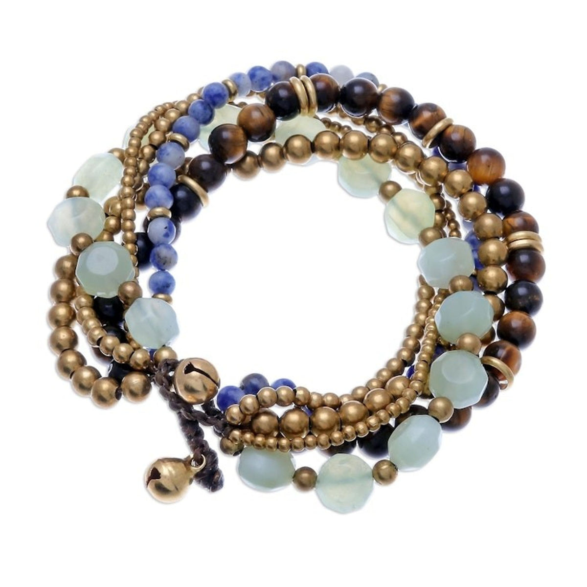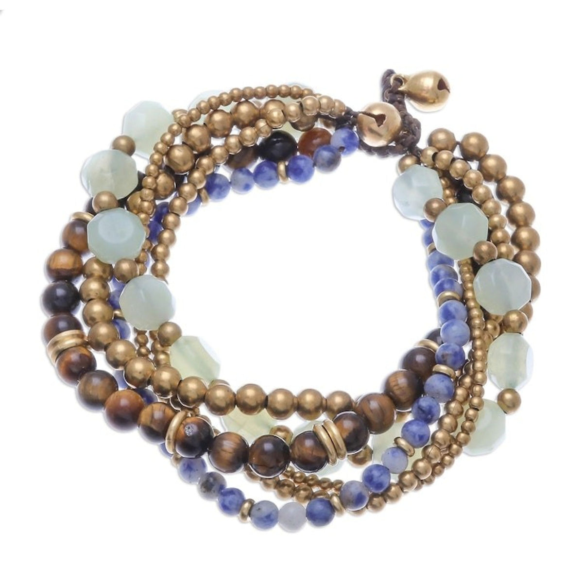 Handcrafted from sodalite, tiger's eye, dyed quartz, and brass on polyester cord, this bracelet measures 7.8 inches min L x 8.3 inches max L and features a button clasp. The color of the stones may vary slightly and the piece features bells that produce sound.