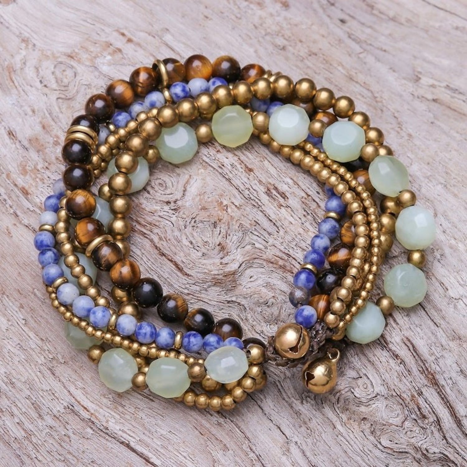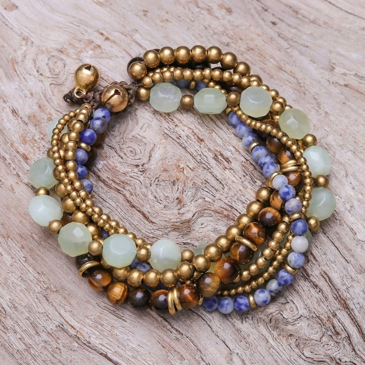 This Thai Tranquility bracelet by Thai artisan Tiraphan Hasub is as lovely as it is serene. The piece circles the wrist with a torsade of sodalite, tiger's eye, and green quartz gemstones, combining their tranquil beauty with gleaming brass beads. The twist design creates a dynamic and visually rich look. This accessory closes with a ringing brass button clasp, which adds a subtle sound and a touch of traditional Thai charm.
