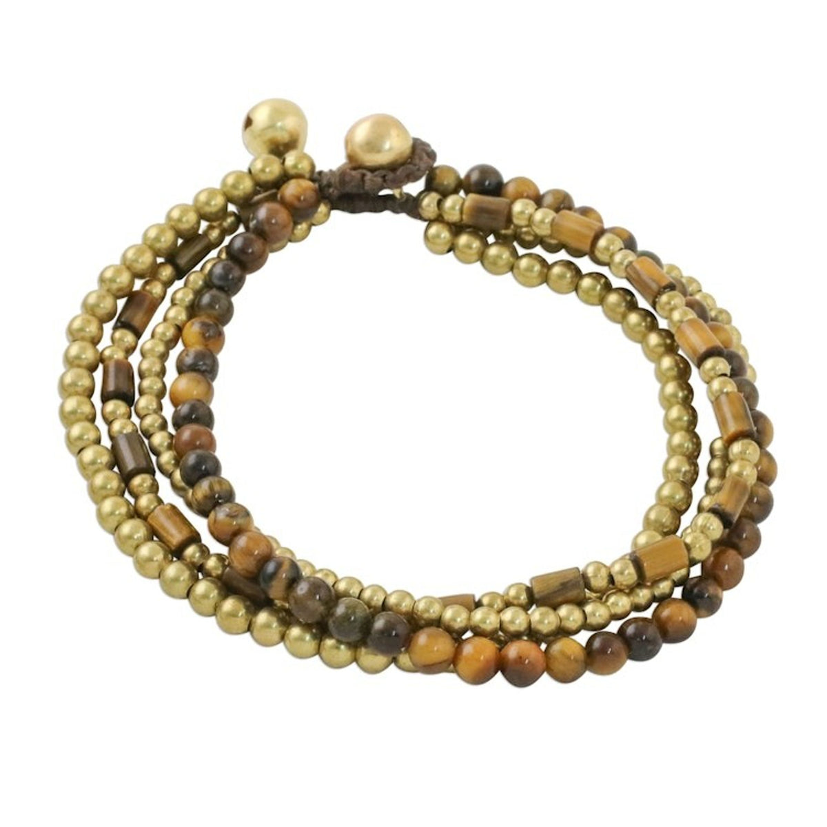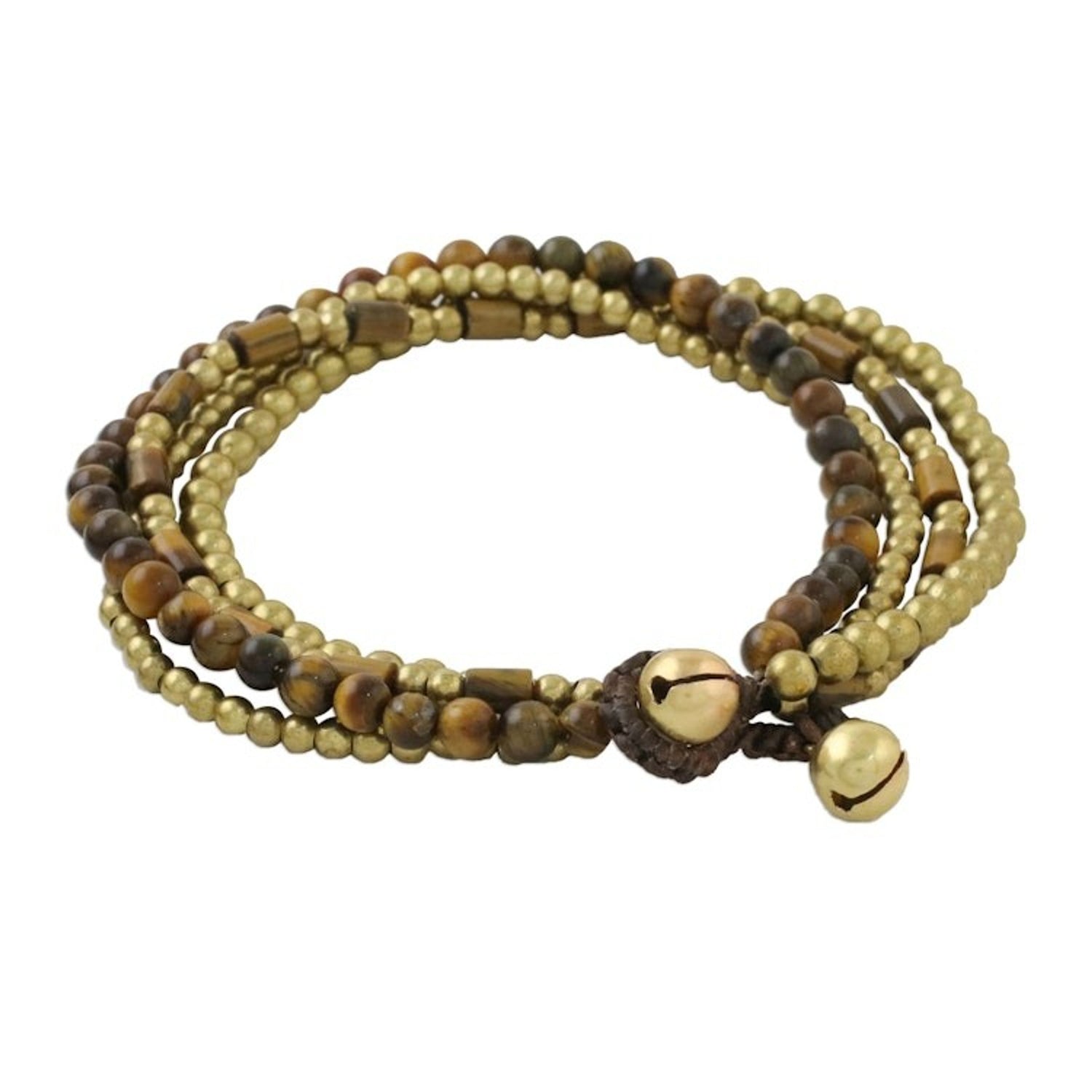 Handcrafted from tiger's eye and brass on polyester cord, this adjustable bracelet measures 7.8 inches min L x 8.3 inches max L and features an antiqued finish and a button clasp. The color of the stones may vary slightly and the piece features bells that produce sound.