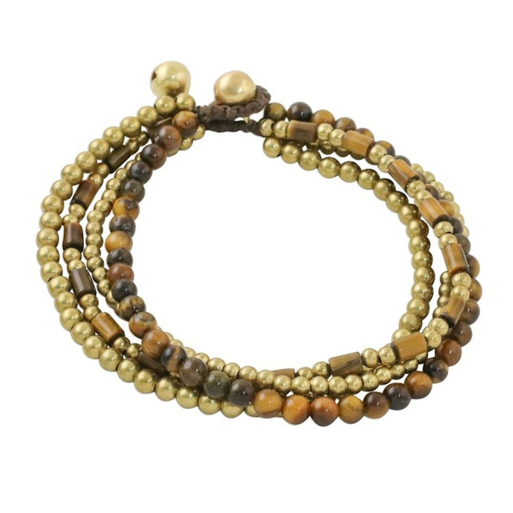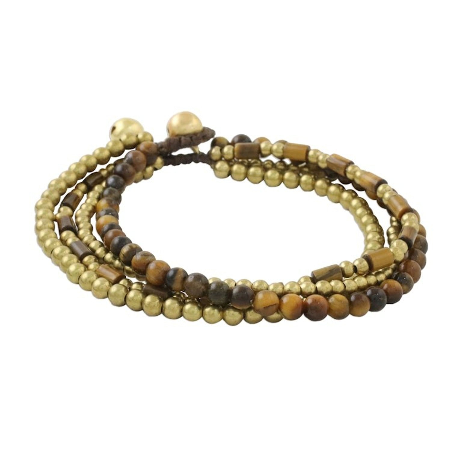 This Earthen Beads multi-strand bracelet by Thai artisan Tiraphan Hasub is a truly intriguing accessory. Round and rondelle beads of tiger's eye, known for their captivating iridescence, are strung on multiple strands to circle the wrist. The design is accentuated with antiqued brass beads, adding a rustic, earthy feel. The bracelet is secured with two ringing brass bells that serve as buttons, allowing for an adjustable length and adding a cheerful, musical touch.