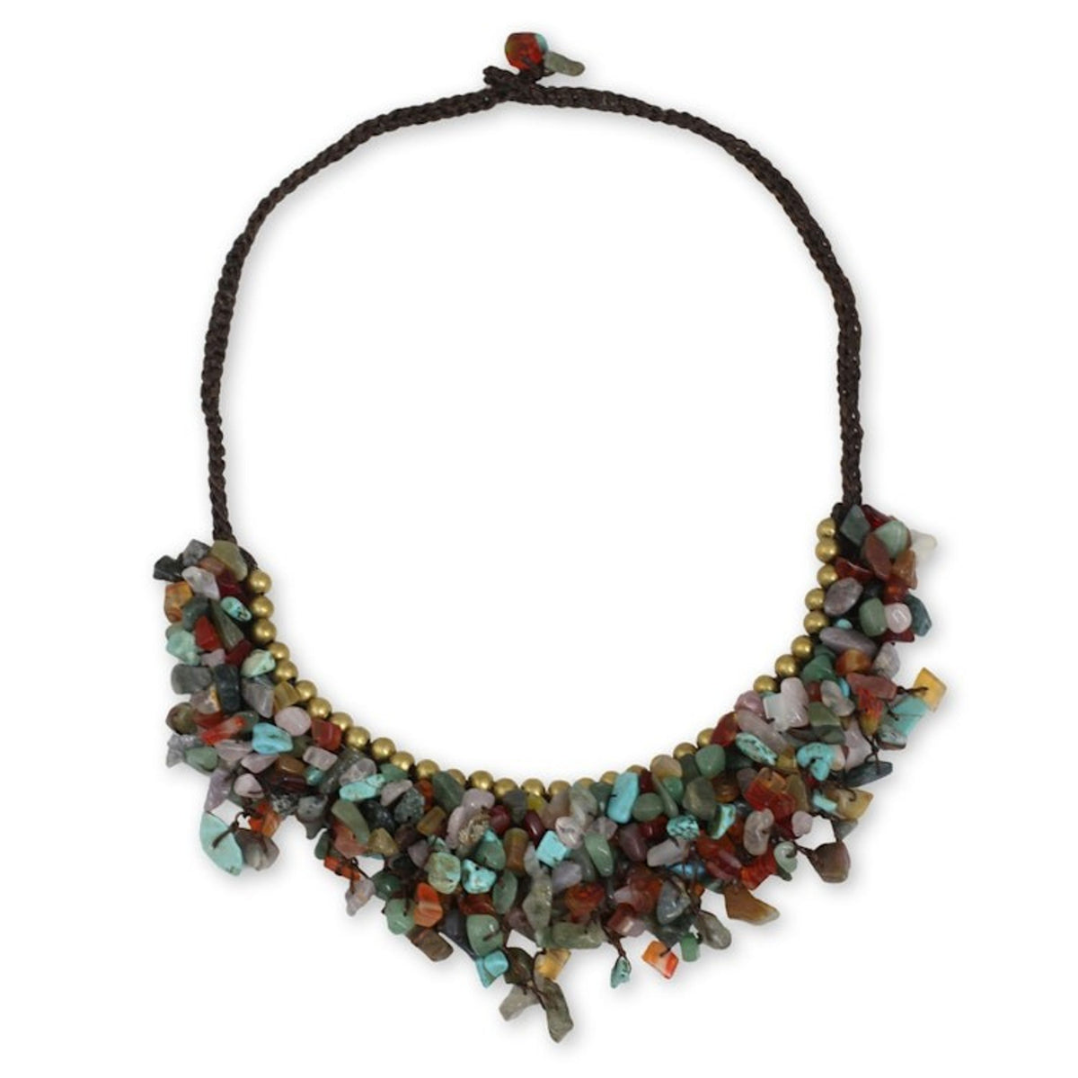 This Festive Party necklace by Thai artisan Tiraphan Hasub is a stylish accessory that will make you the life of the party. The dramatic cord necklace is a celebration of color, featuring a myriad of colorful gemstone chips including dyed calcite, carnelian, aventurine, rose quartz, and enhanced jasper. The gems are knotted together and topped with shiny brass beads for a beautiful contrast. The necklace fastens with a toggle crafted from assorted gemstone nuggets.