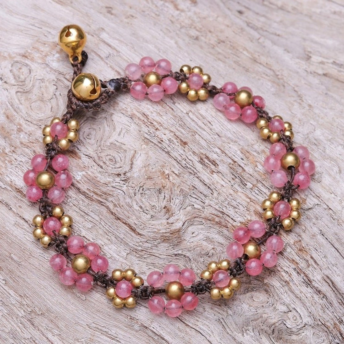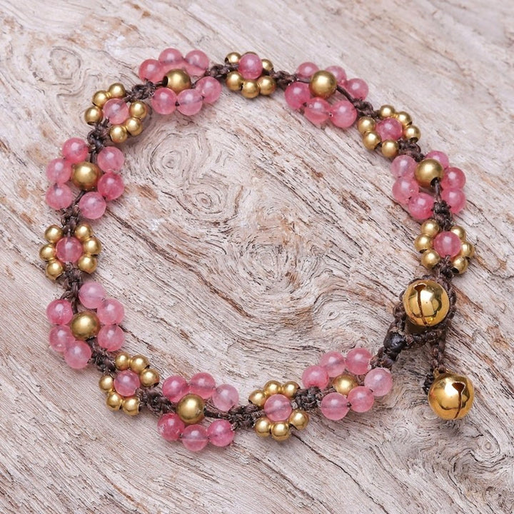 This Blooming with Love macrame bracelet by Thai artisan Tiraphan Hasub features lovely shapes that resemble flowers. The design is created by a combination of pink quartz and gleaming brass beads, which are expertly integrated using macrame techniques. The bracelet is finished with a ringing brass bell button clasp, which not only secures the piece but also adds a cheerful and whimsical sound to the design.