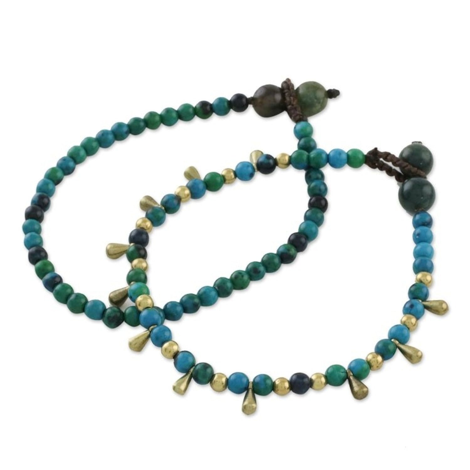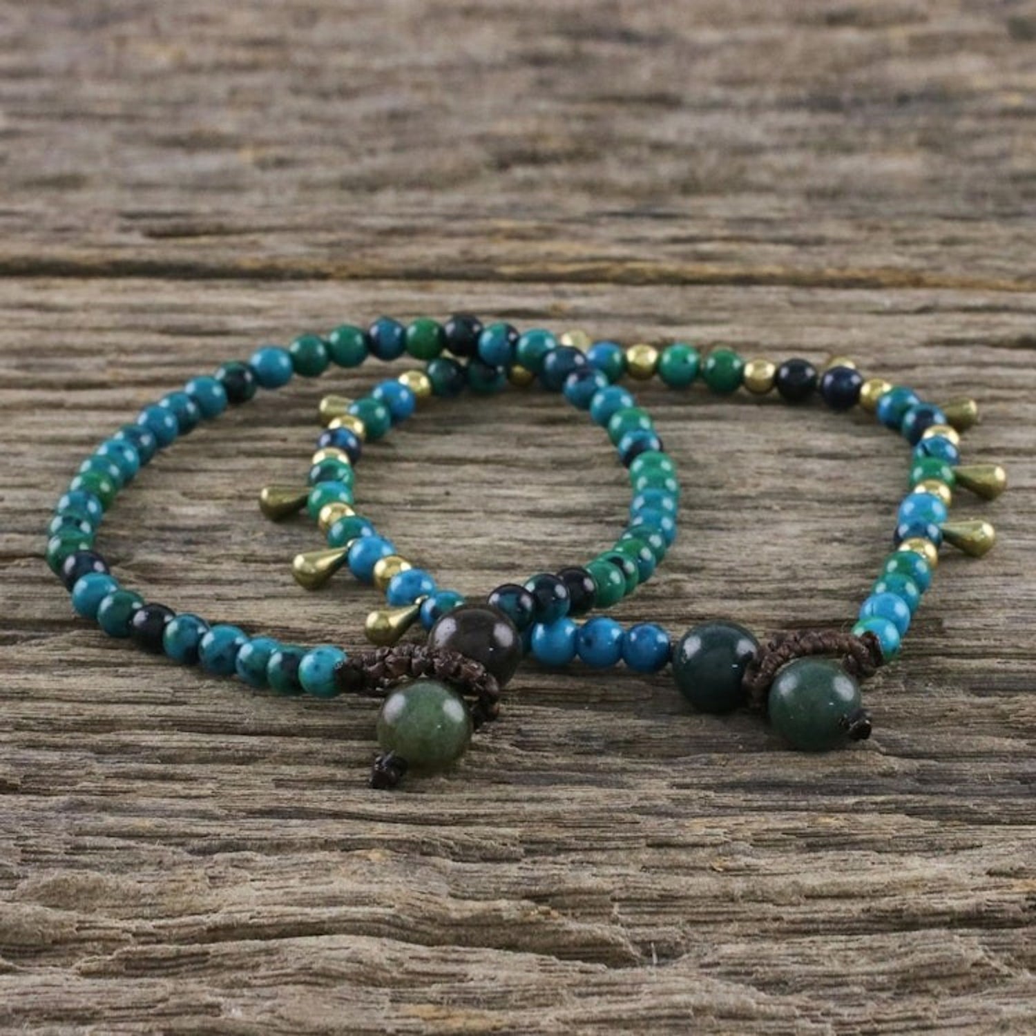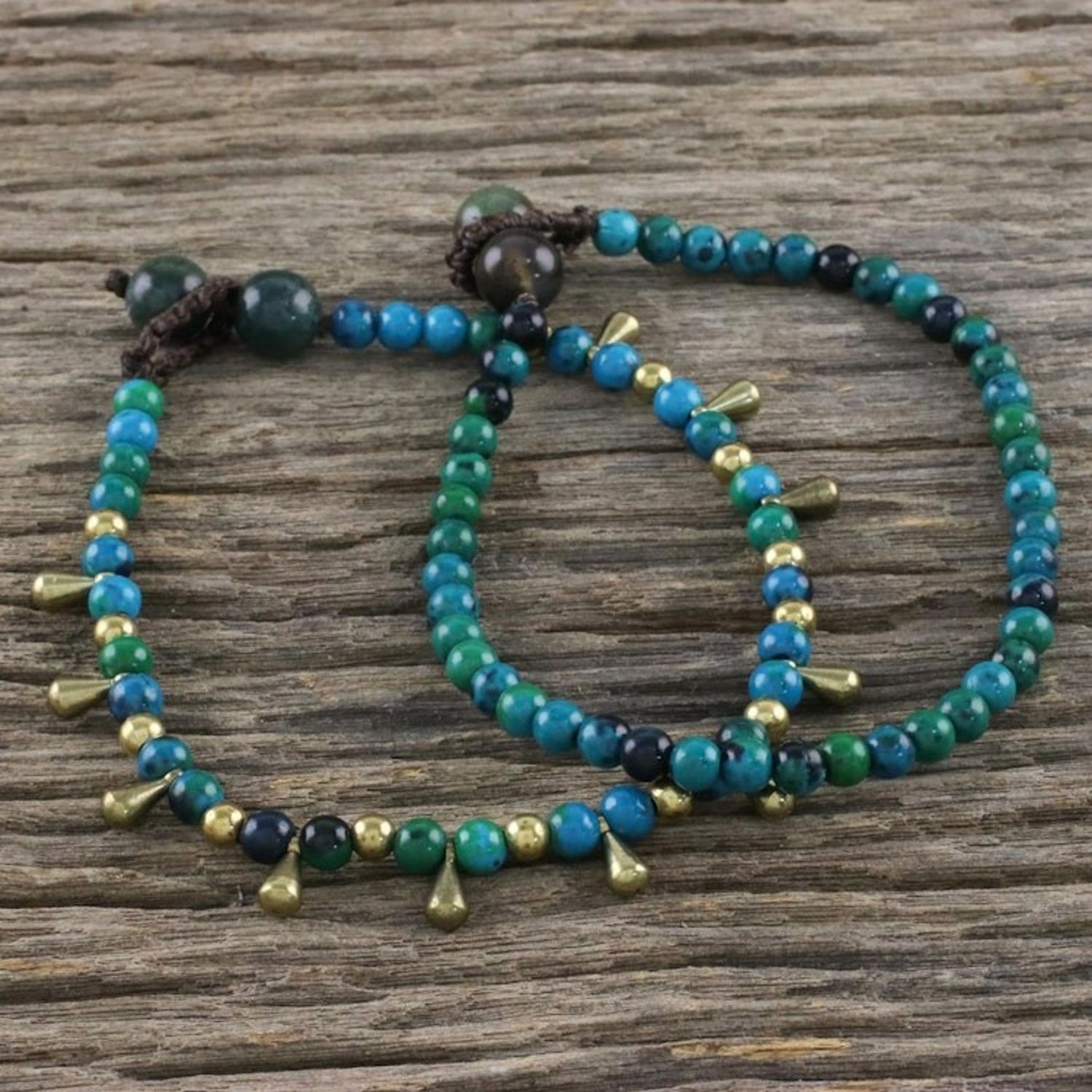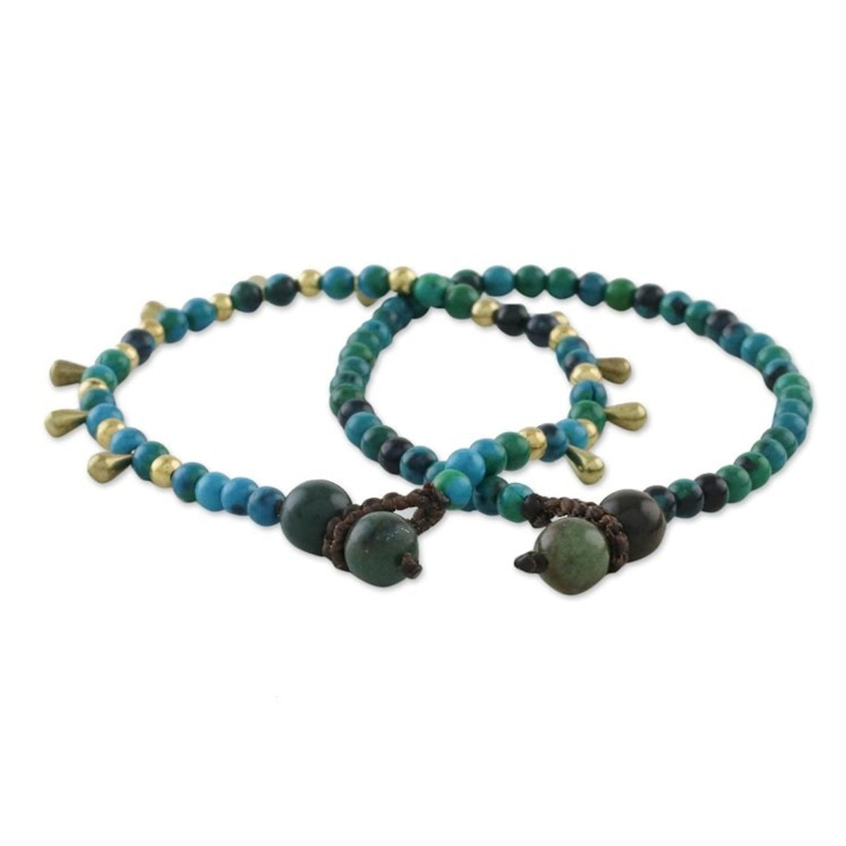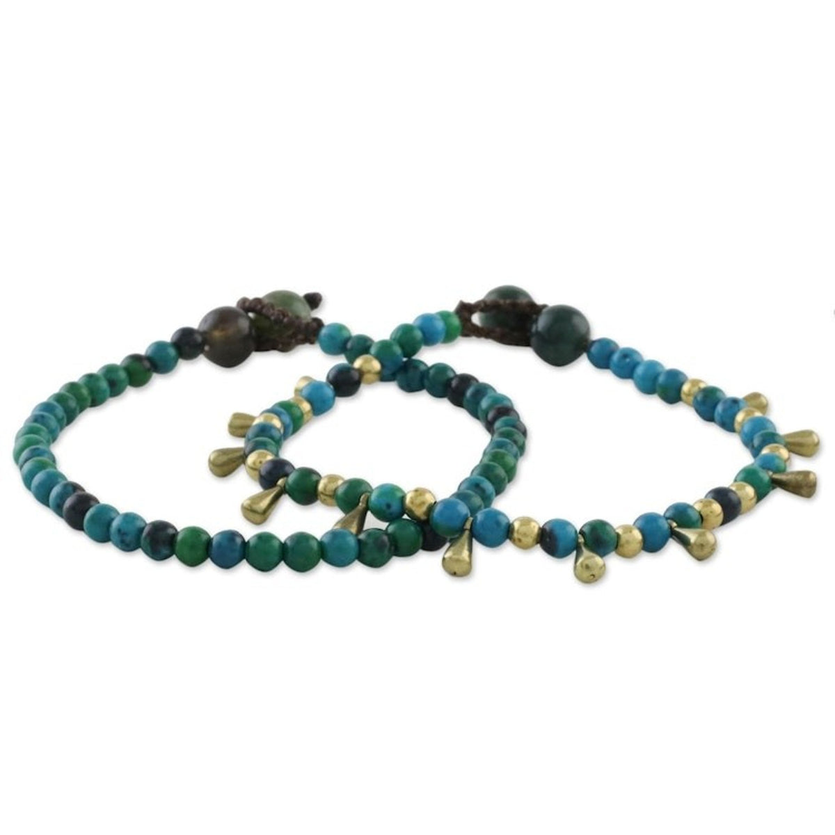 This Beautiful Forever pair of bracelets by Thai artisan Tiraphan Hasub is designed for lasting beauty. Each bracelet is beaded with stones of oceanic serpentine, with one featuring brass beads that stand out. The bracelets are secured with adjustable agate button clasps, allowing for a comfortable fit. The combination of materials and colors creates a harmonious and natural aesthetic.