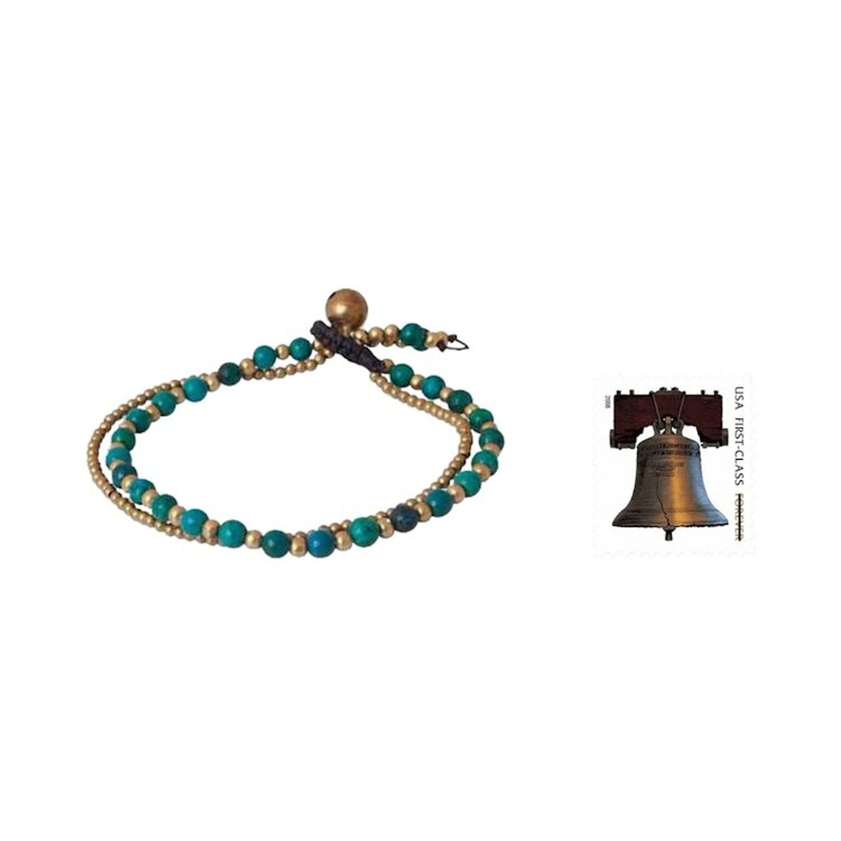 Handcrafted from dyed serpentine and brass on waxed polyester, this bracelet measures 7.5 inches L and features a button clasp. The piece features bells that produce sound.