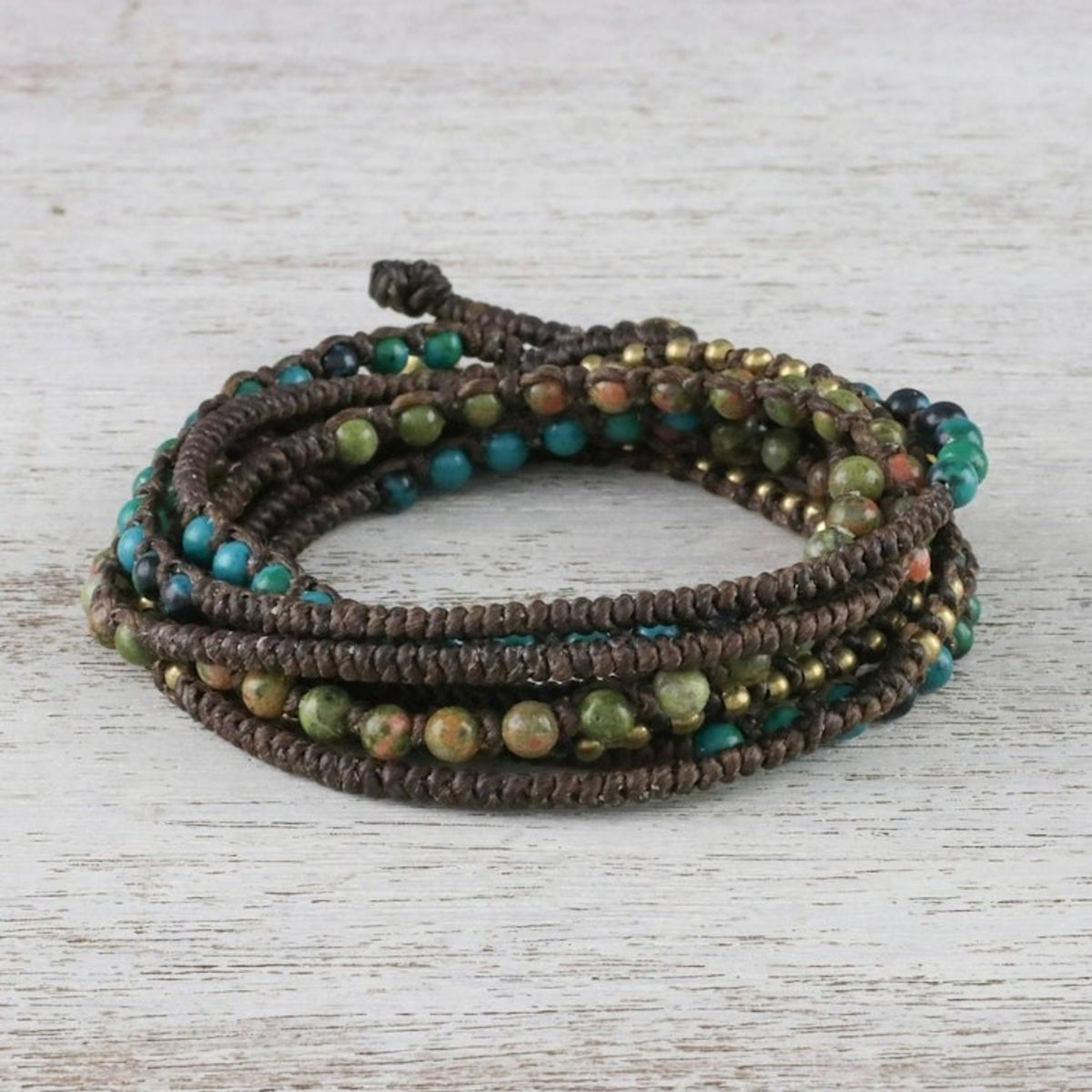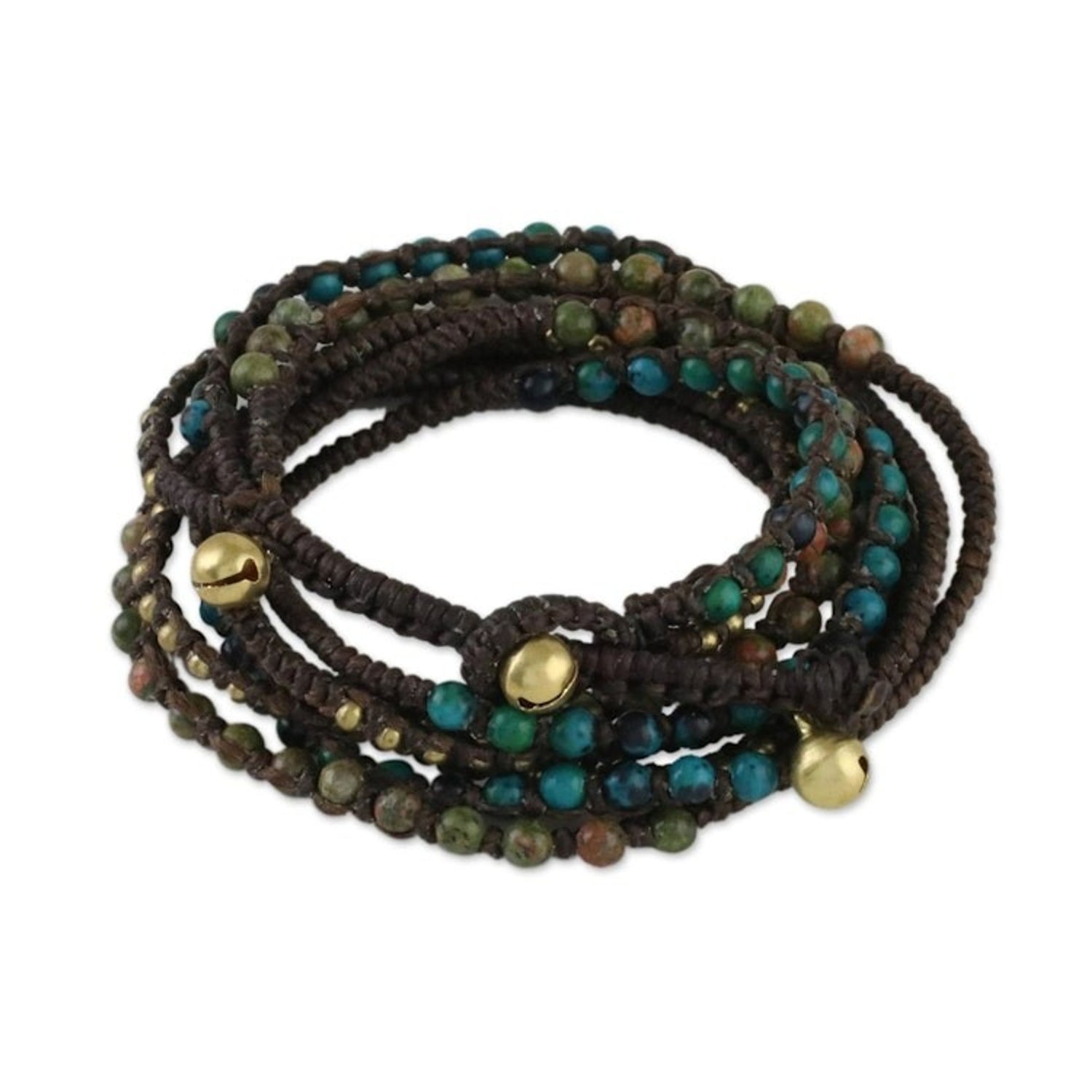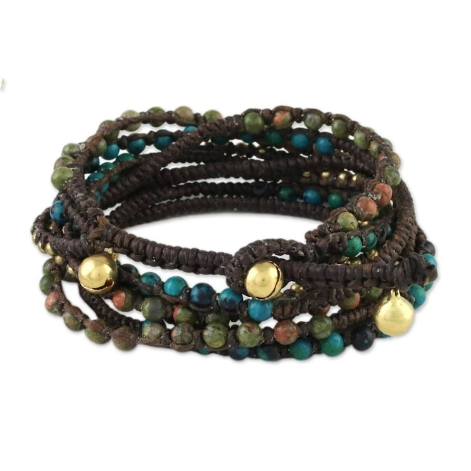 Handcrafted from dyed serpentine, unakite, and brass on polyester cord, this adjustable wrap bracelet measures 22.8 inches min L x 25 inches max L and features a button clasp. The color of the stones may vary slightly and the piece features bells that produce sound.