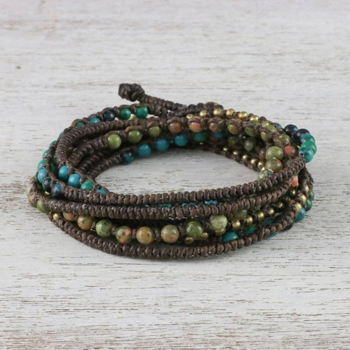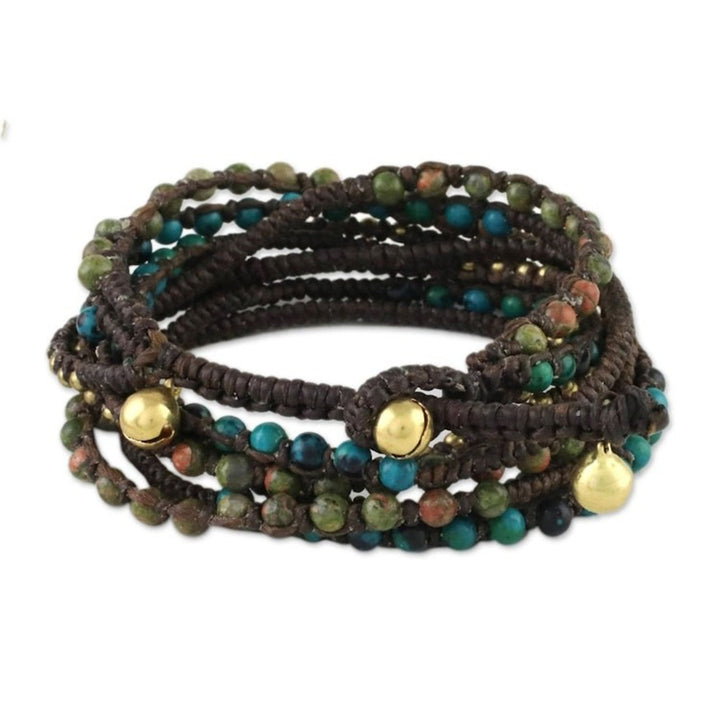 This Voice of the Forest wrap bracelet by Thai artisan Tiraphan Hasub has a bohemian style. The artisan hand-braids three strands of polyester cord, which are beaded with gleaming brass, serpentine, and natural unakite. The combination of earthy tones and natural stones gives the piece a rustic and enchanting feel. The bracelet closes with an adjustable button clasp, which is accentuated with ringing bells.