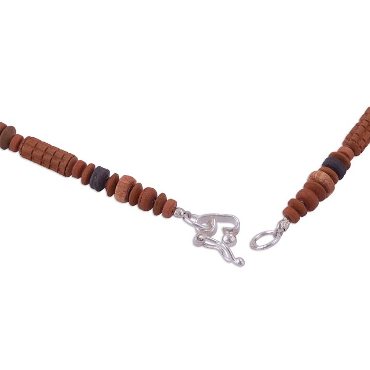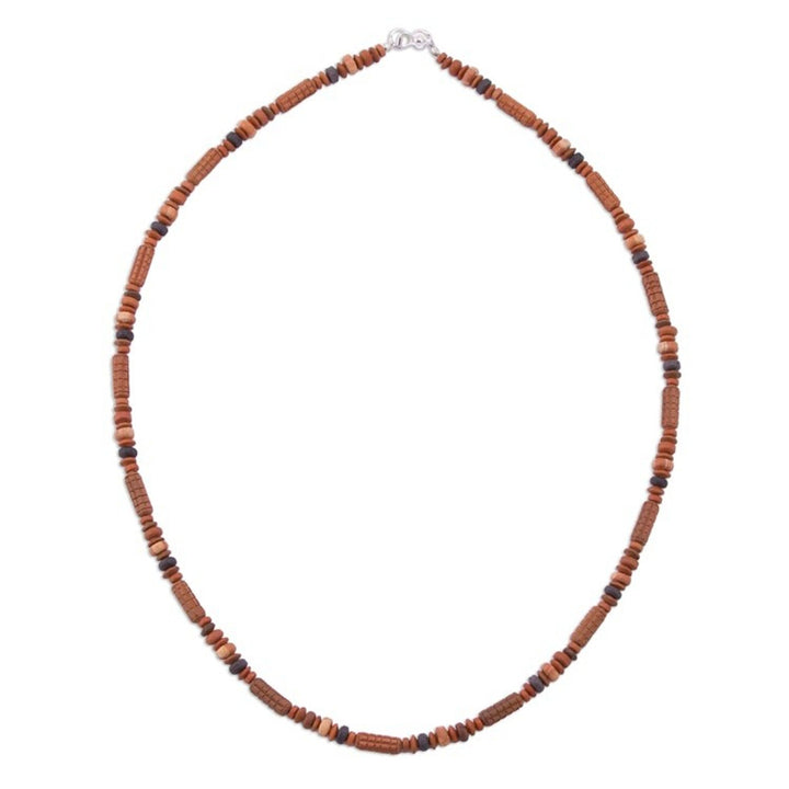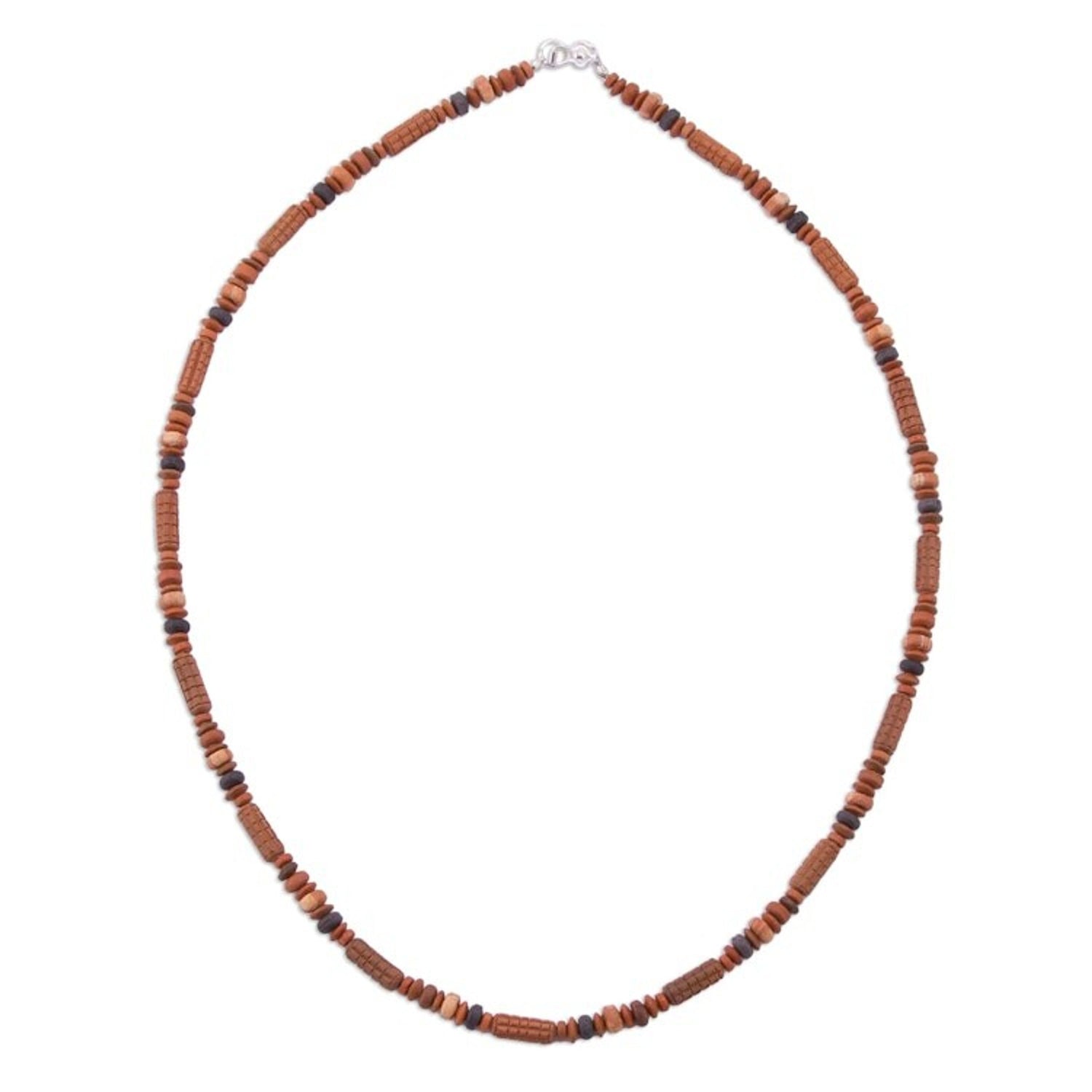 This Andean Corn necklace by Peruvian artisan Ubaldina Paucar Achancaray is a ceramic beaded accessory inspired by the staple food of Peru. The intriguing design features handcrafted tubular ceramic beads that evoke corn cobs, intermingling with brown and black beads. The accessory is a blend of cultural tradition and contemporary style, perfect for a casual outing or work. It closes with a sterling silver fold-over clasp.