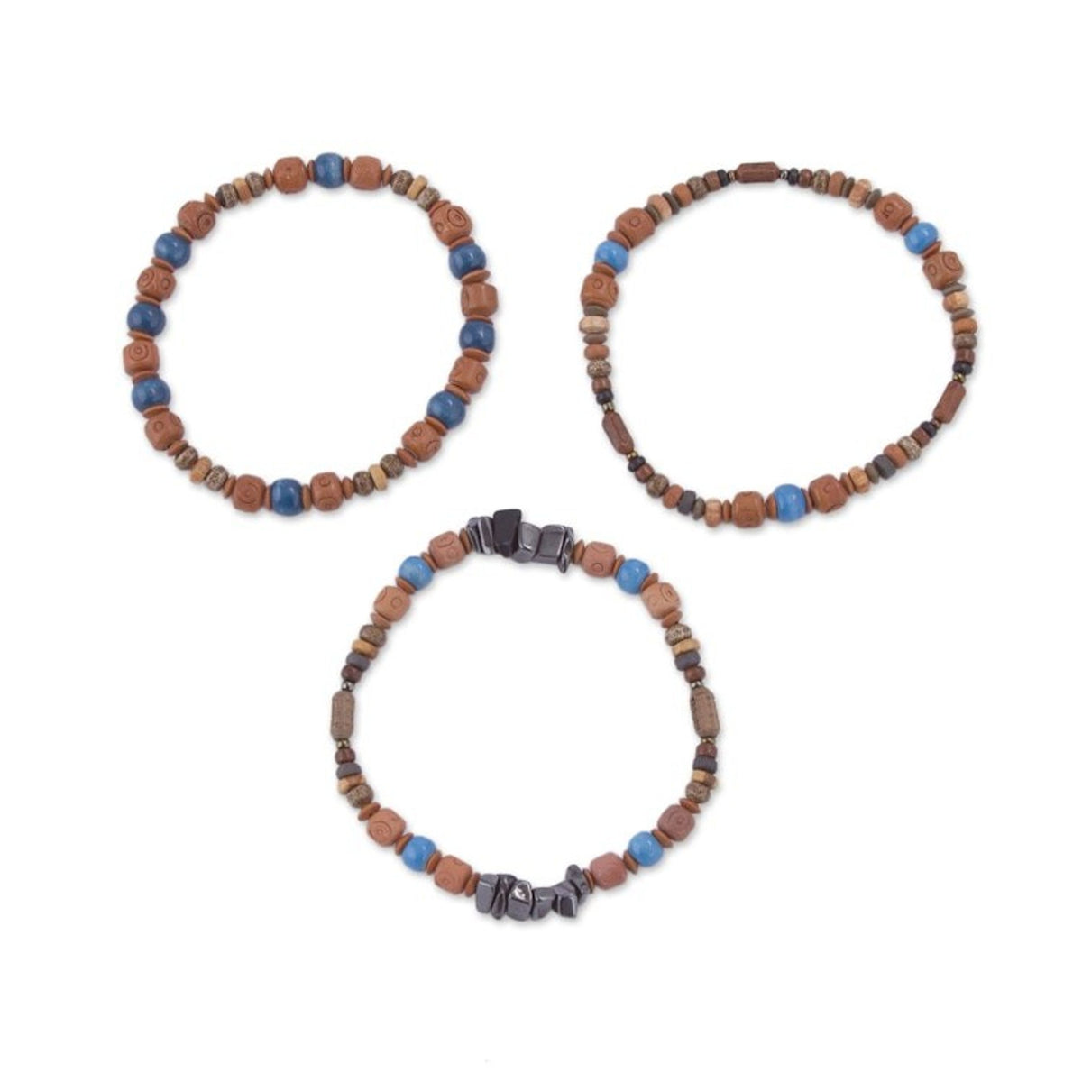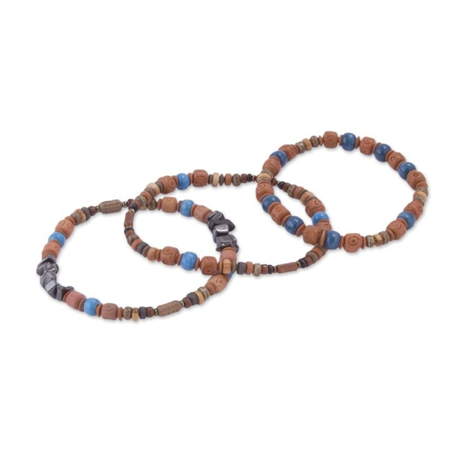 Three Hematite and Ceramic Beaded Bracelets in Earth Tones 'Andean Eyes'