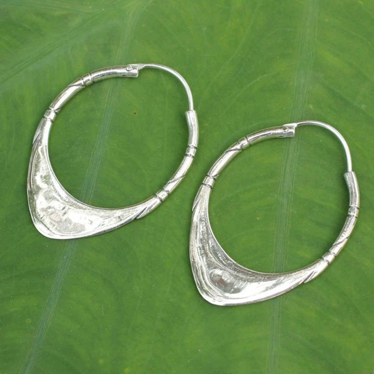 These Silver Boomerang hoop earrings by Thai artisan Wadarat Supasirisuk embody contemporary Thai design. Smooth arcs of gleaming 950 silver curve outward and return, creating the effect of a boomerang. The design is enhanced with subtle textures, adding depth and visual interest. These enchanting earrings are handcrafted and have an endless hoop style.